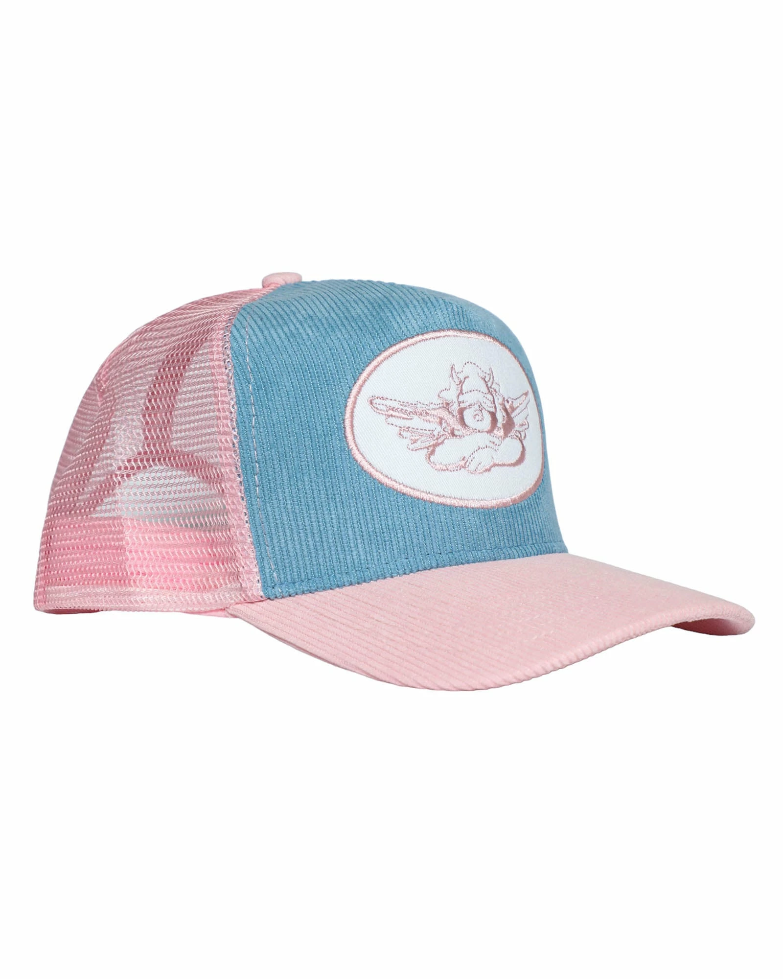 Baby pink trucker hat with white patch and blue corduroy. Adjustable snapback.