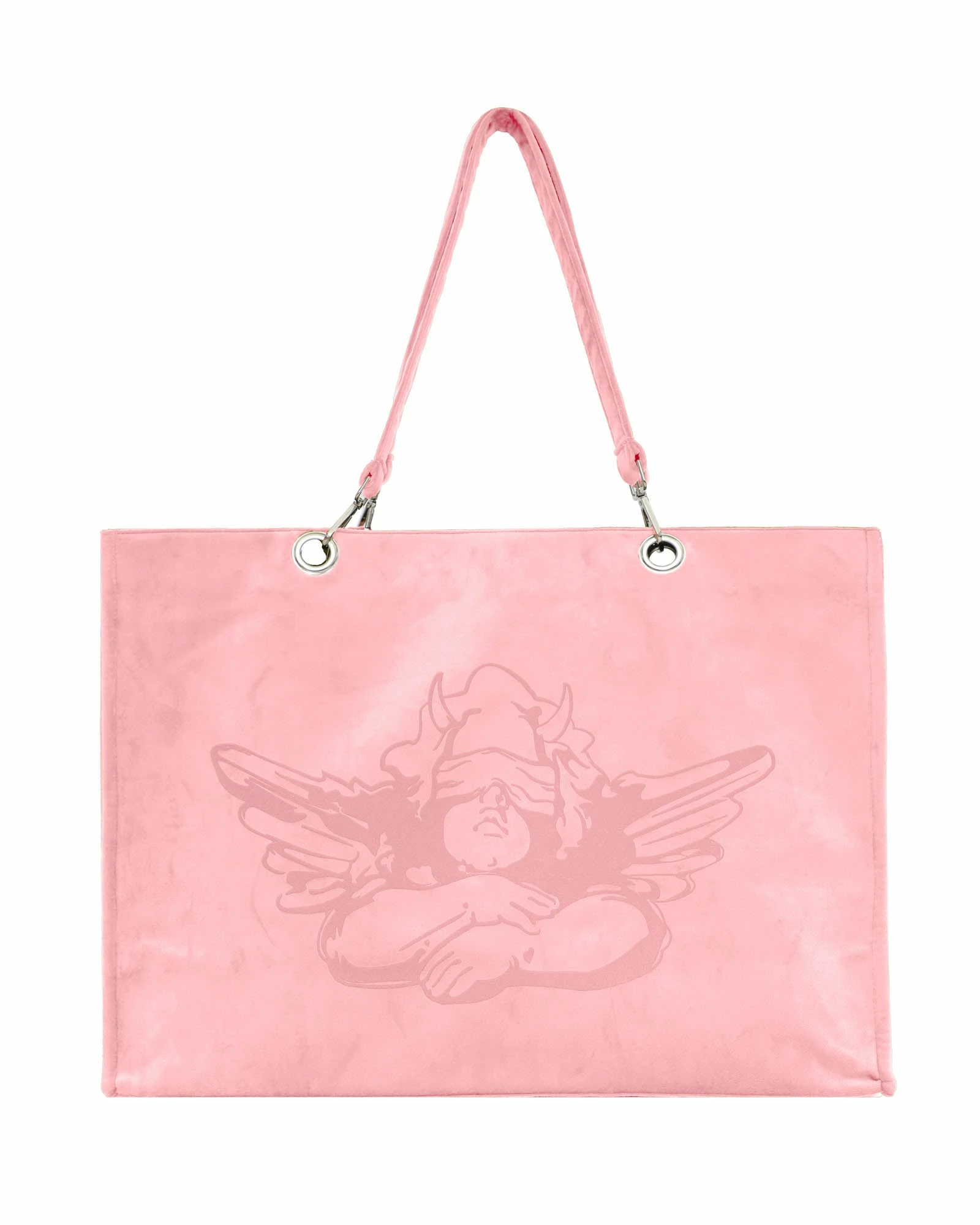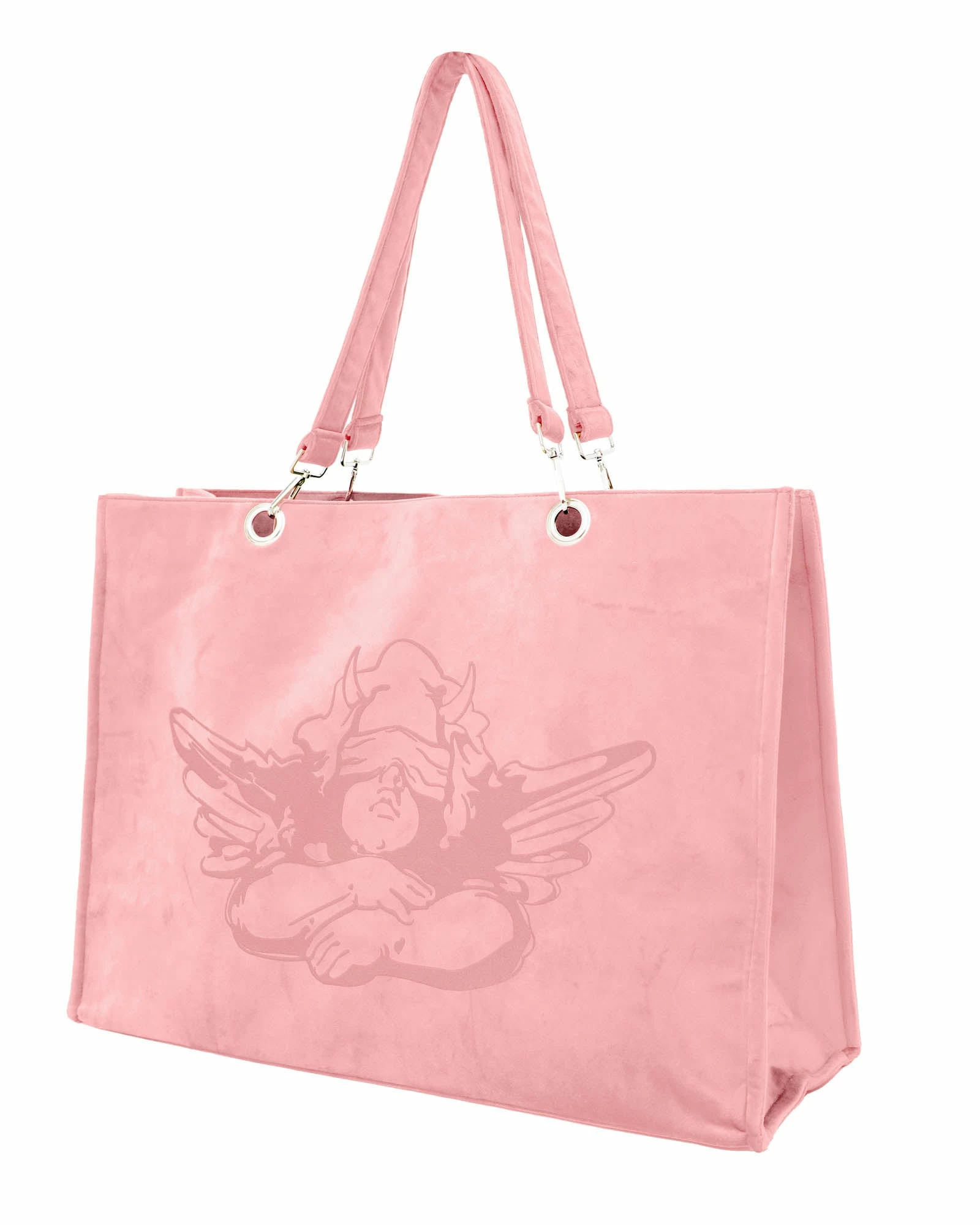 Oversized baby pink velour structured tote. Small interior pocket, silver hardware, and magnetic closure.
