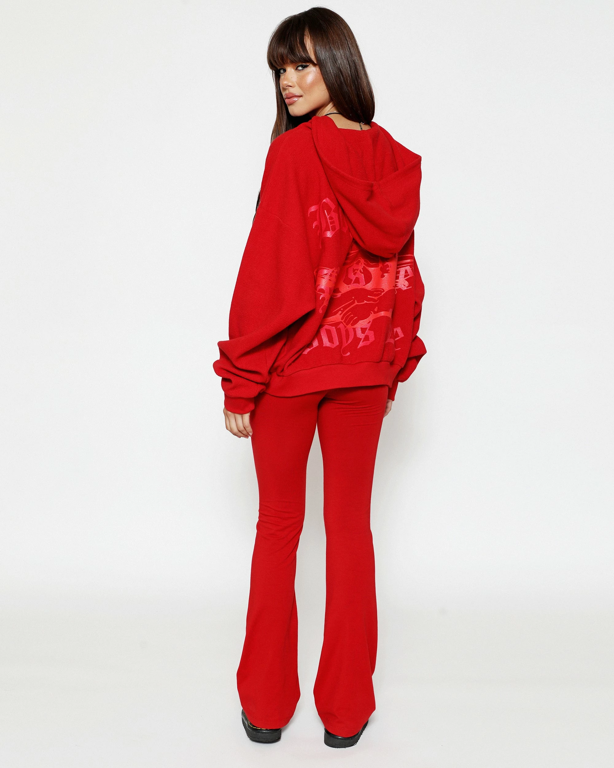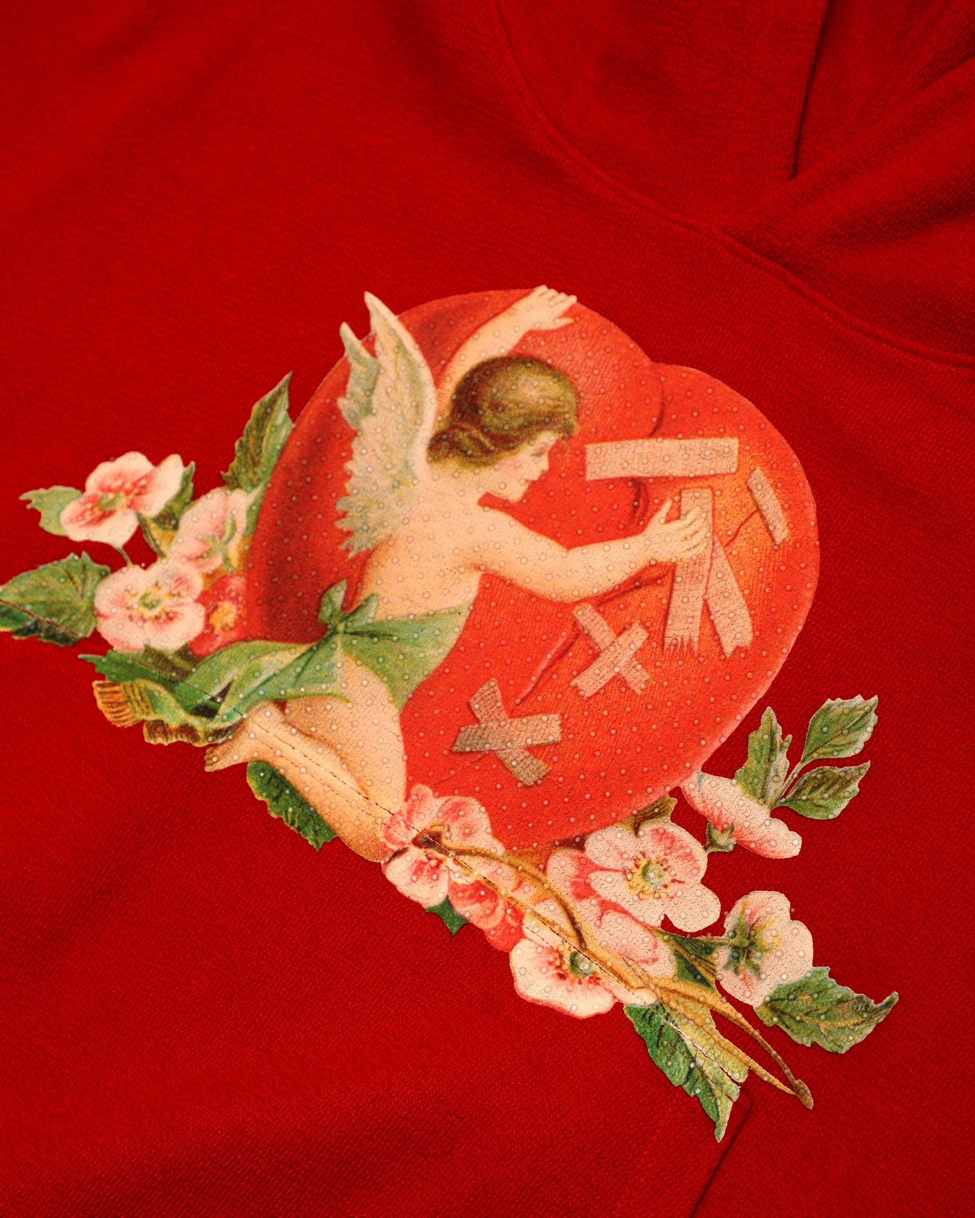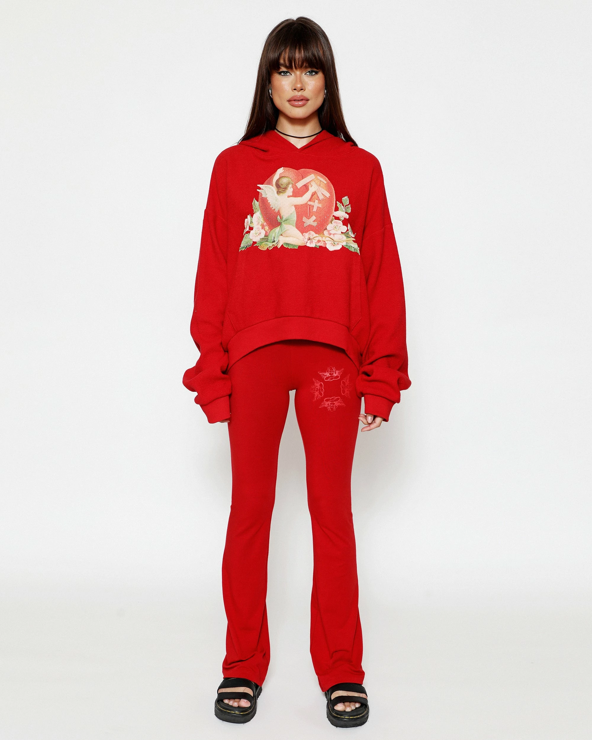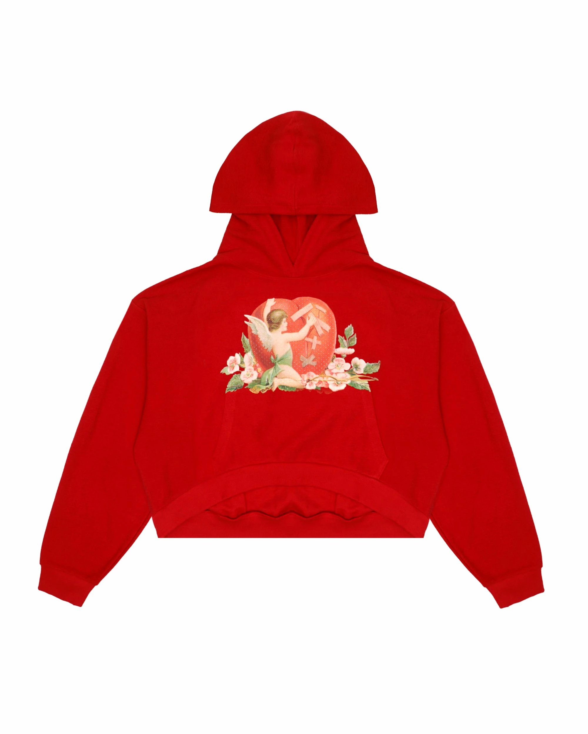 Inside out french terry fabric in red. Oversized cropped hoodie featuring a dramatic hood, front pocket, slightly curved front hem, front and back graphics, and rhinestone embellishments.