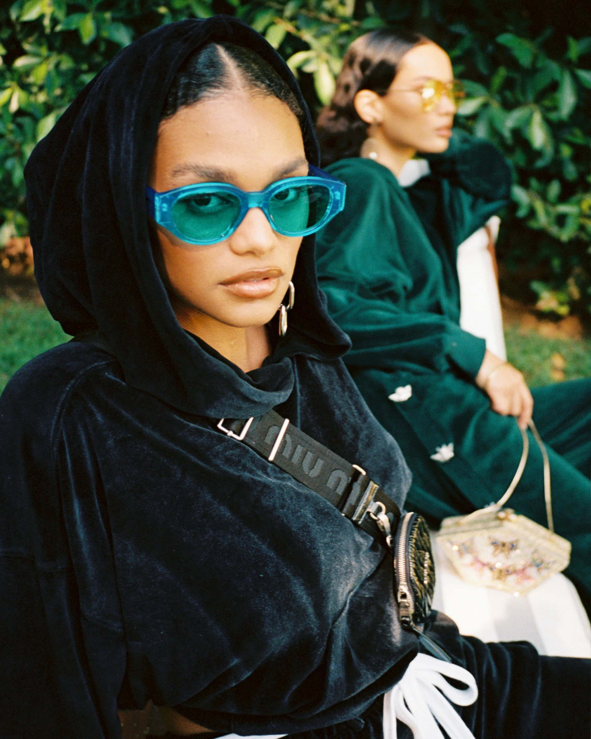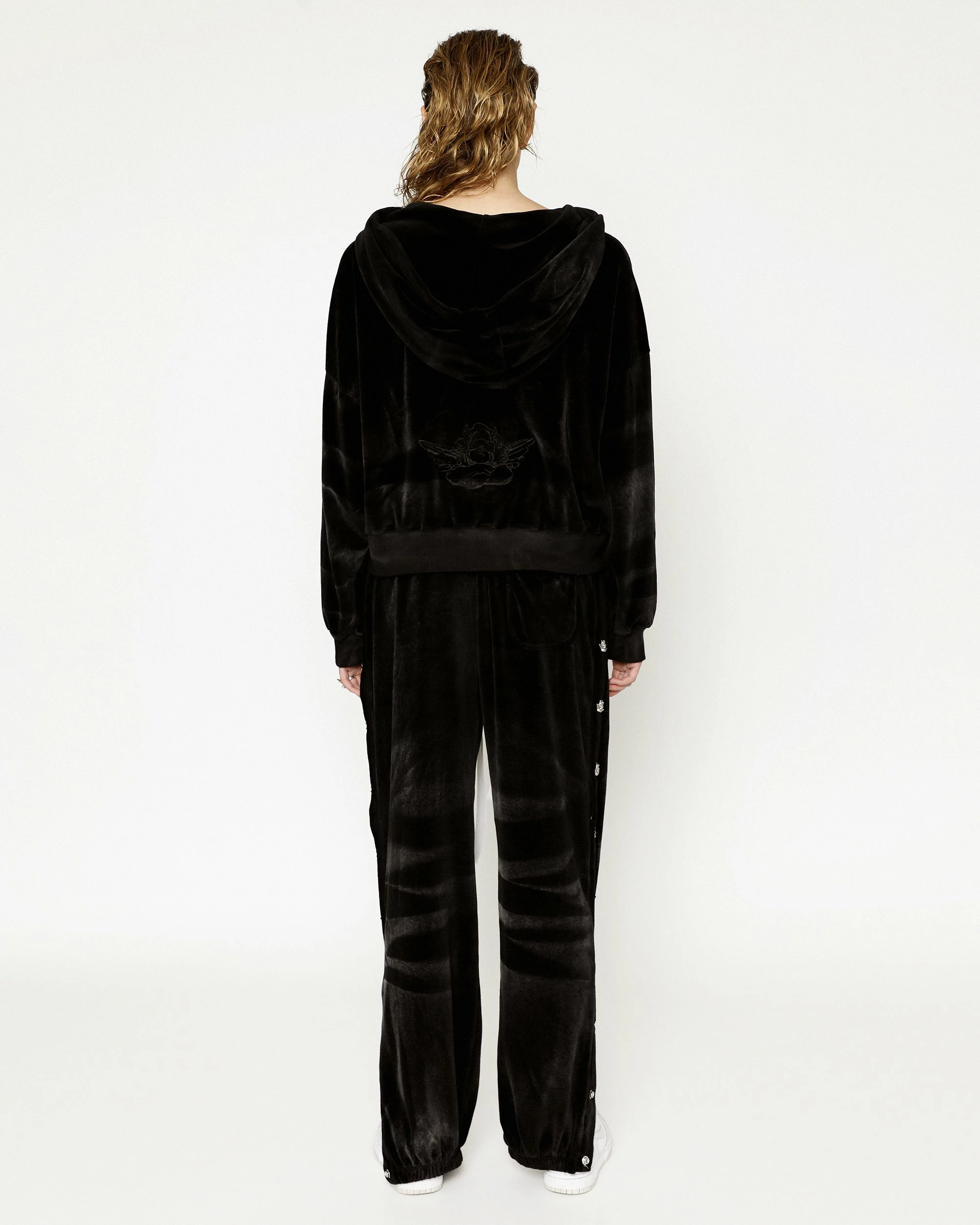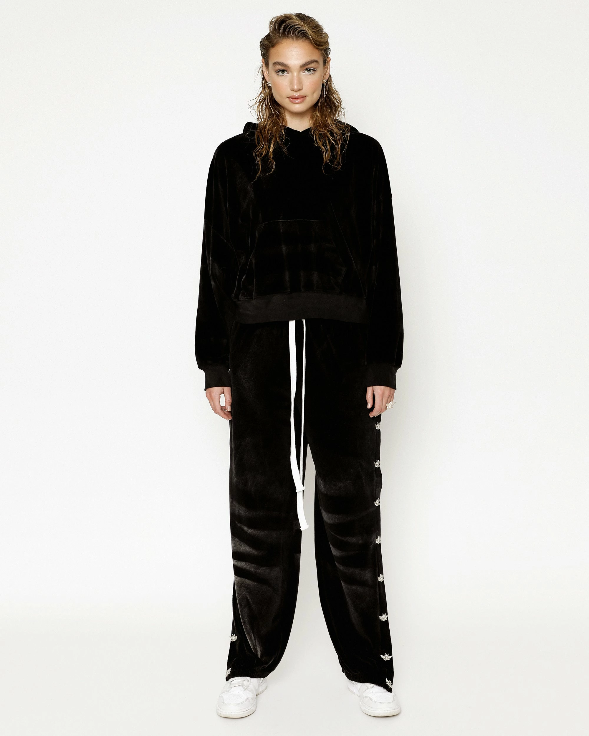 Velour cropped hoodie with front pocket, dolman sleeves, embroidered back logo, with ribbed cuffs and hem. Each item is hand dyed – may show slight color variations. Made in Los Angeles, California.