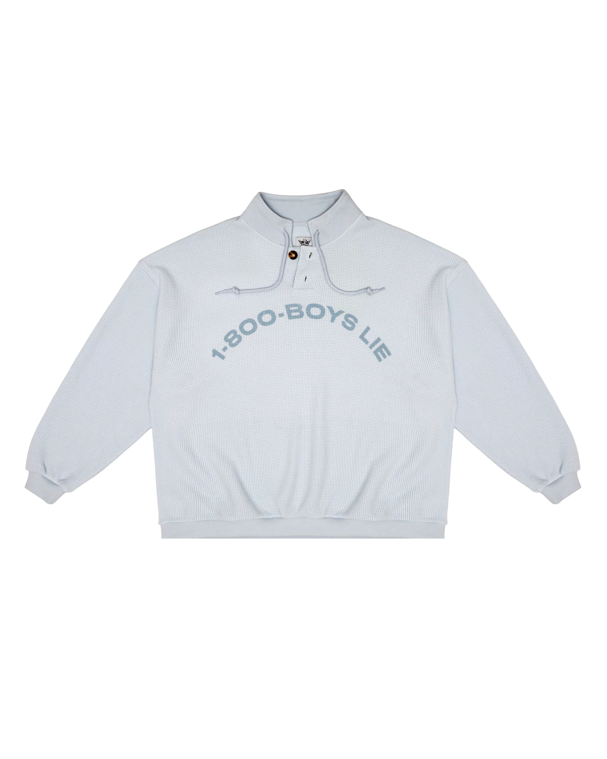 Soft and lightweight thermal fabric. Henley style crewneck with button details, drawstring, and ribbed cuffs and hem. Features rhinestone embellishments.