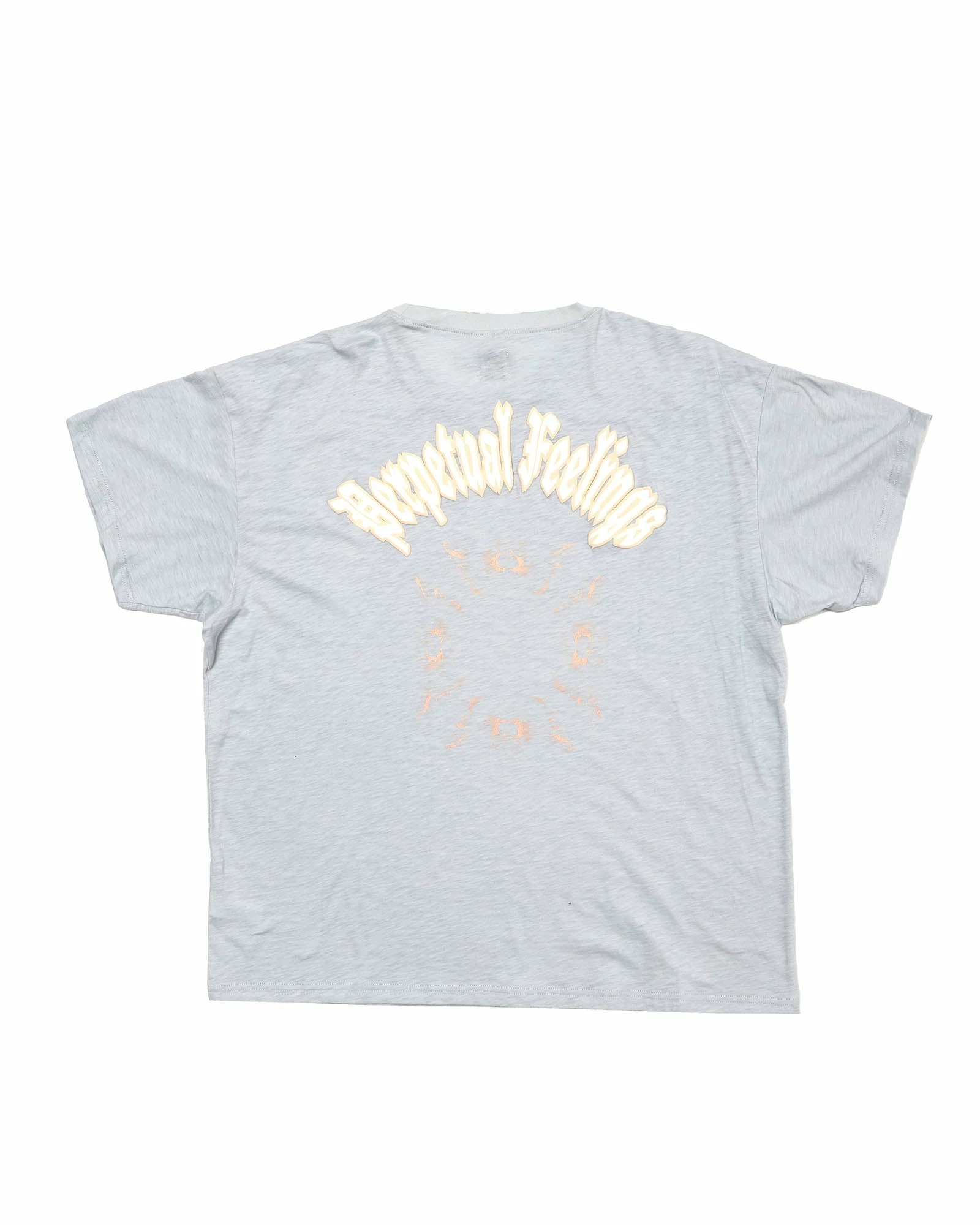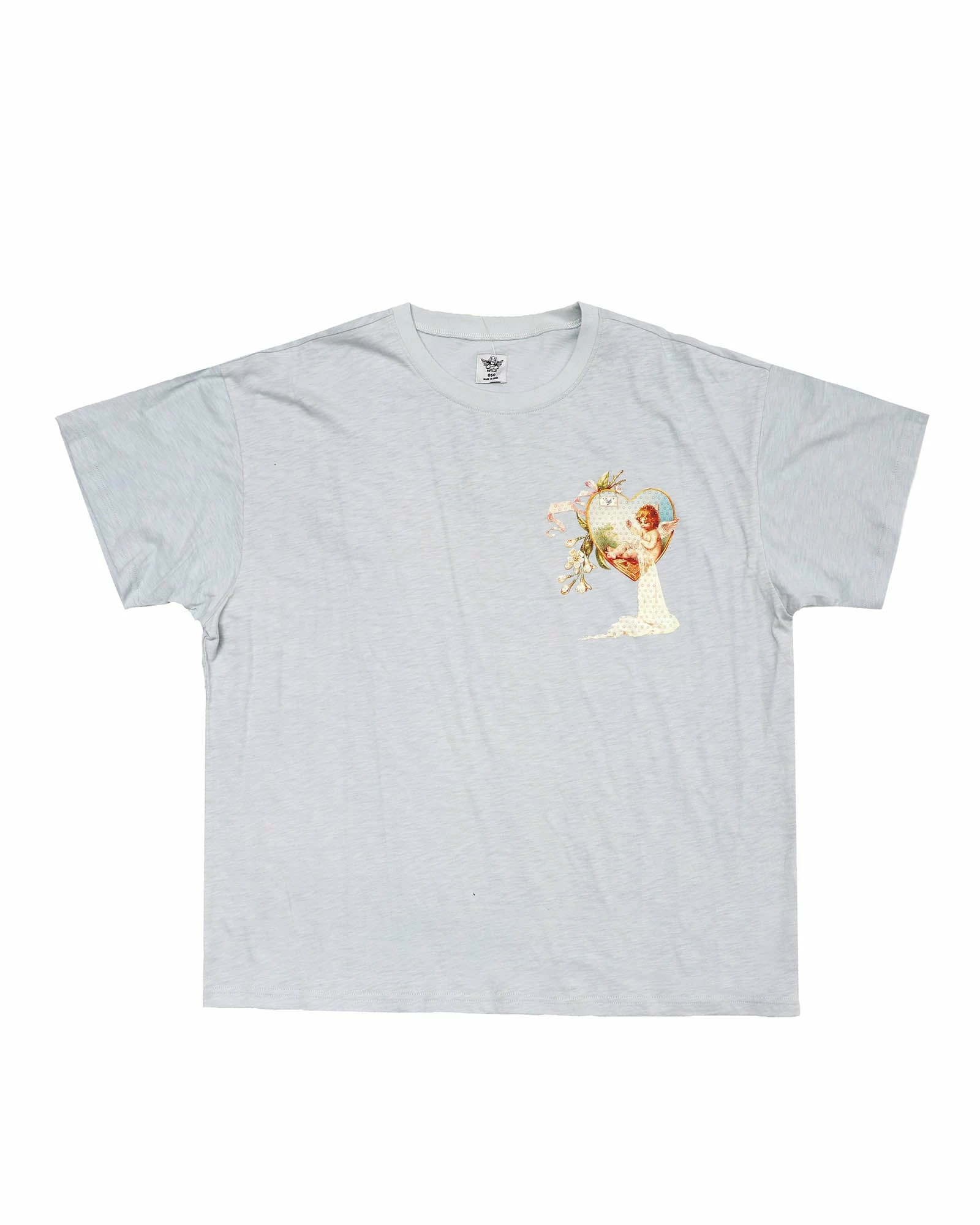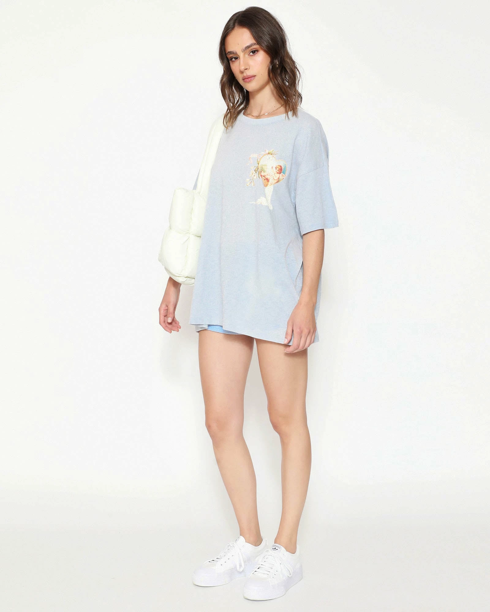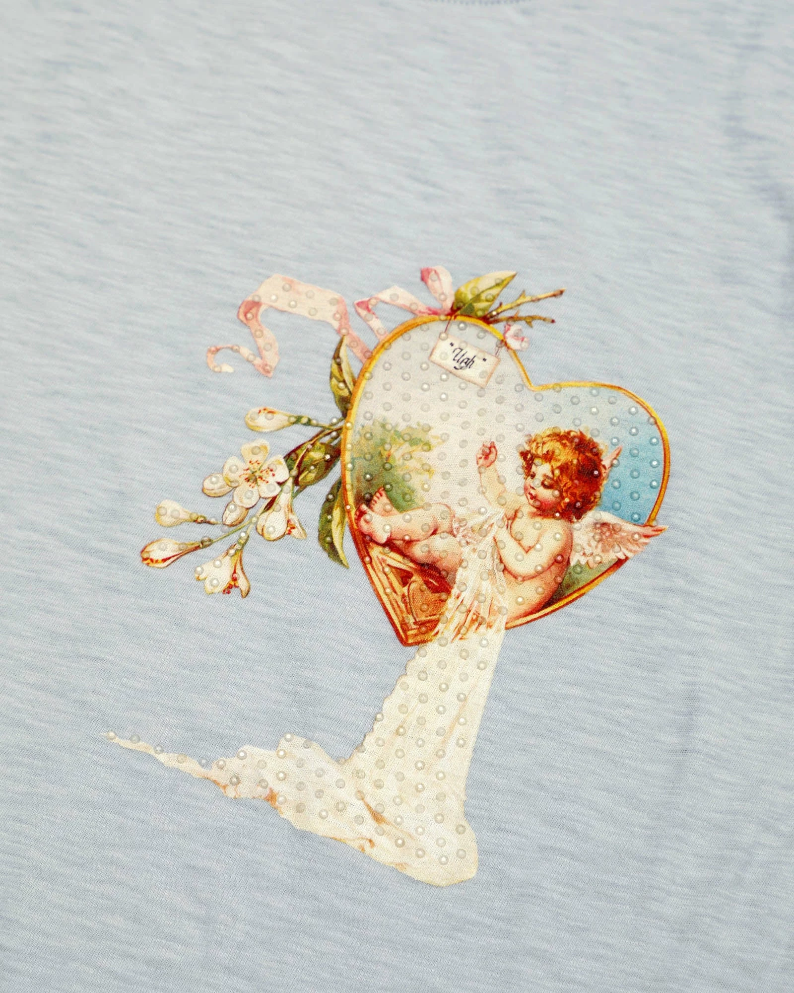 Lightweight and slightly sheer light blue tee in cotton slub jersey with an oversized fit. Features rhinestone embellishments, distressed logos, and puff print graphics.