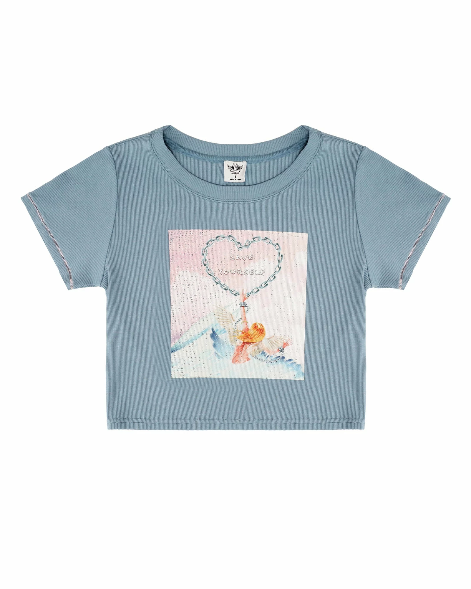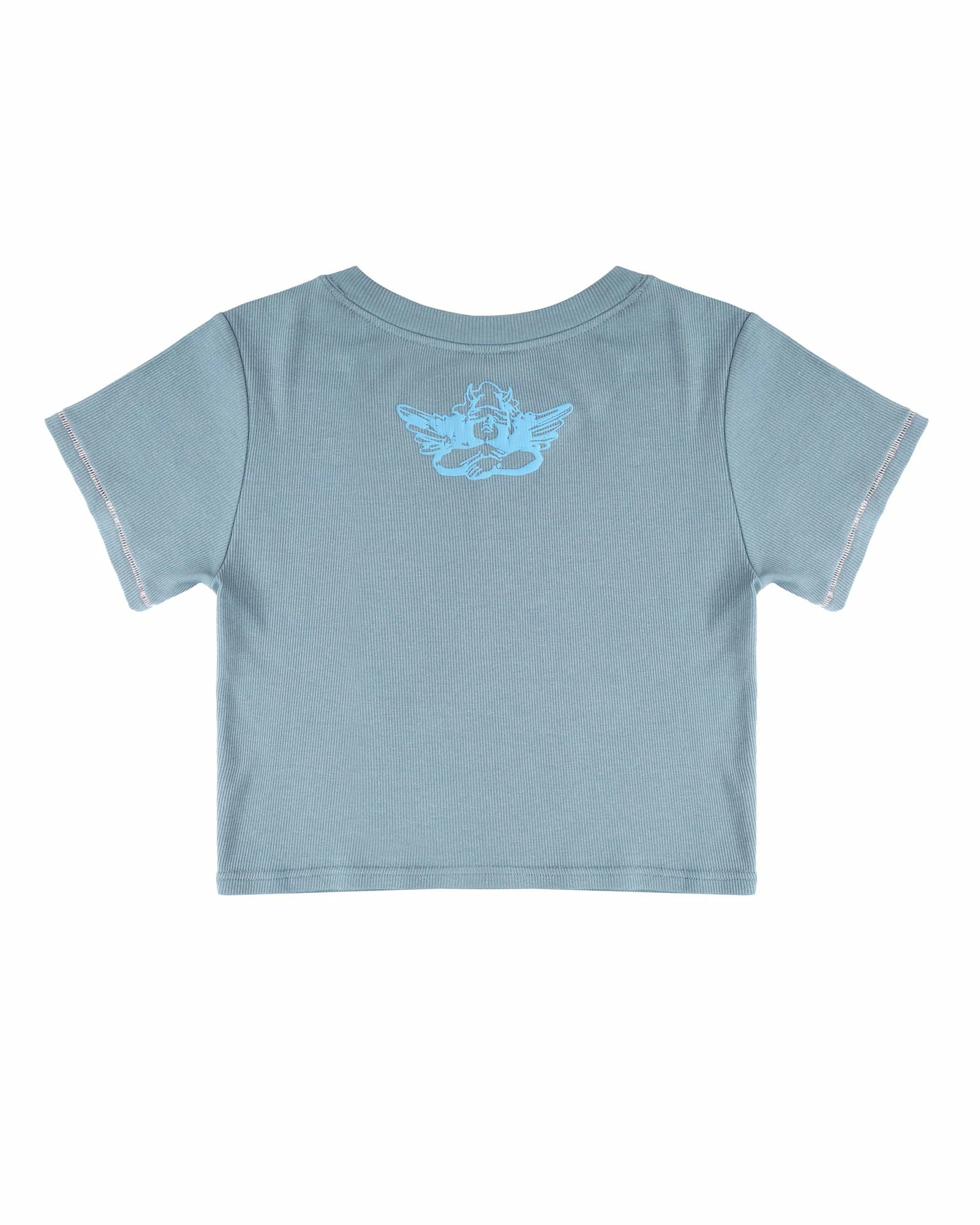 Blue ribbed crop tee with rounded neckline and cap sleeves. Features distressed graphic, puff print logo, and contrast stitching.
