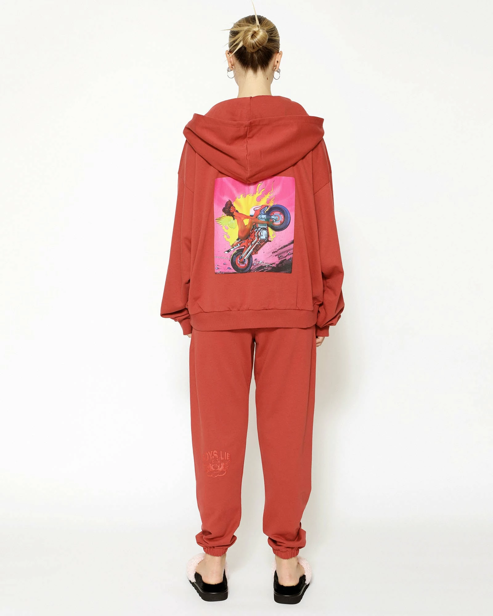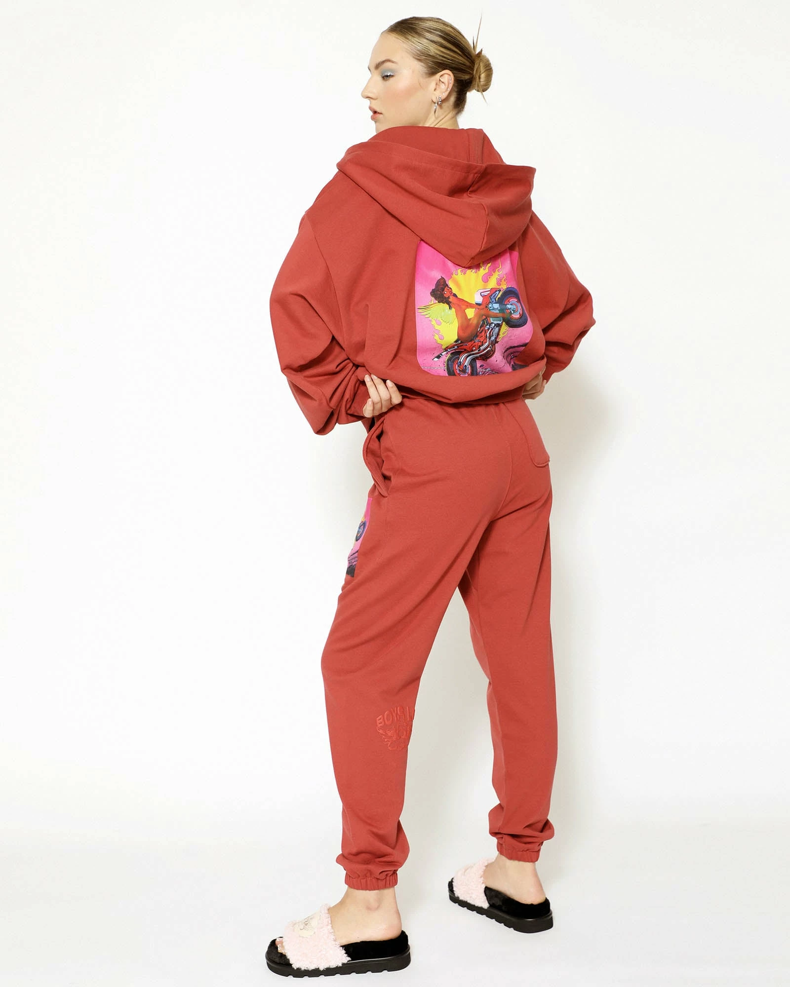 Mid-weight fleece fabric in deep red with a puff print logo. High rise sweatpants with back and side pockets, elastic waistband and cuffs.