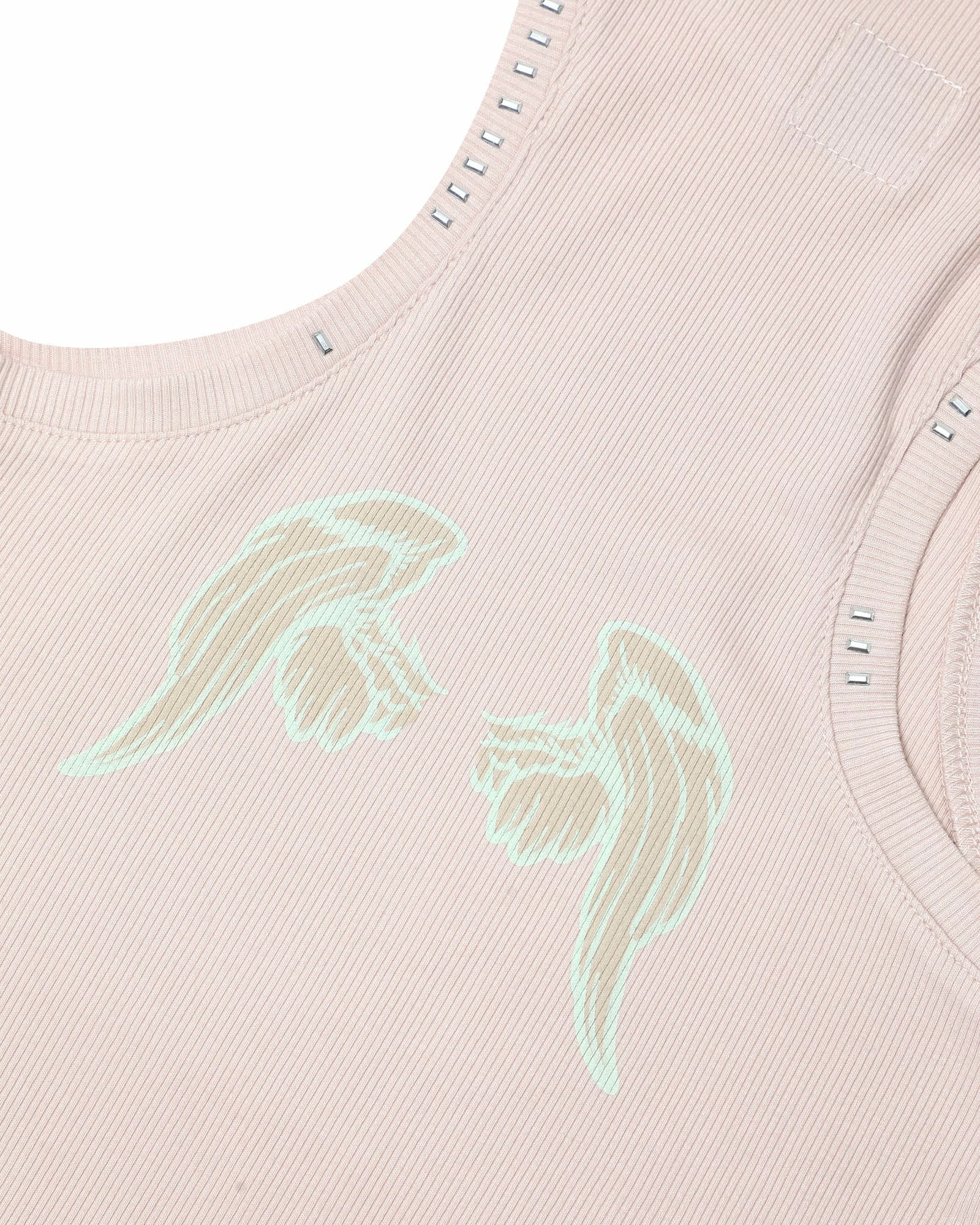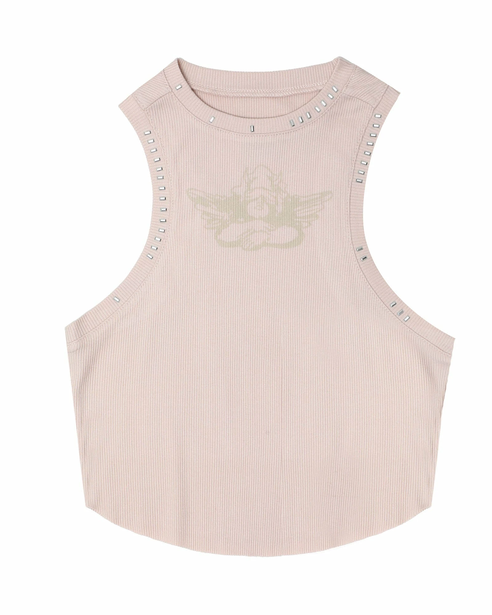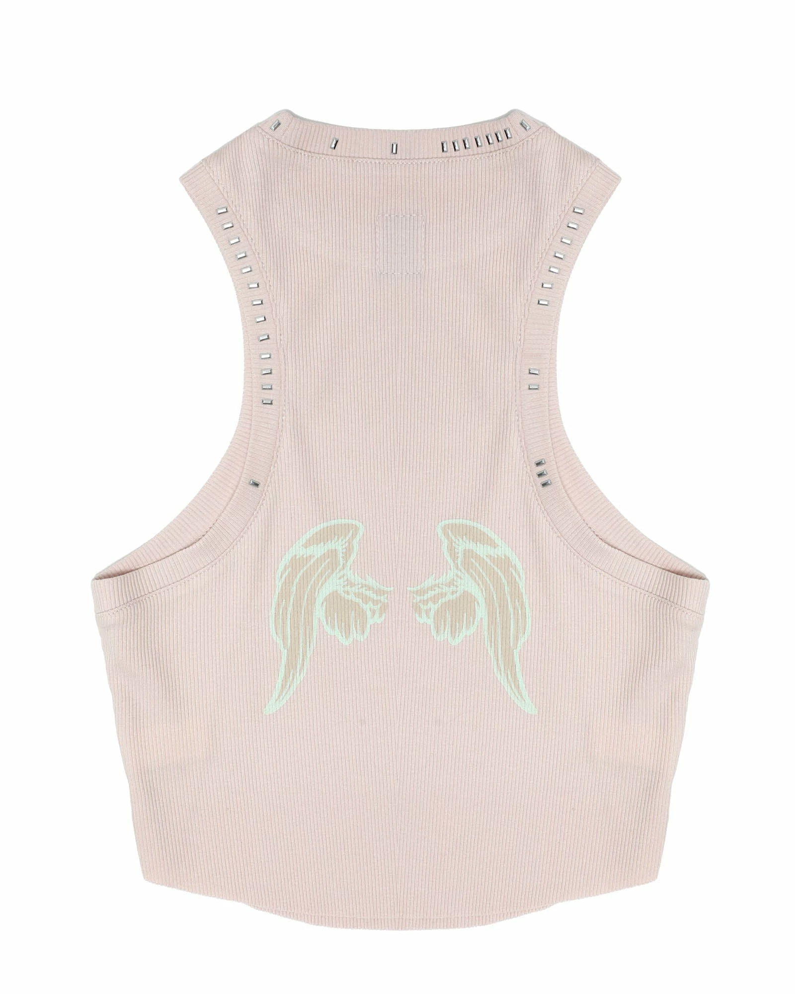 Ribbed tank in blush pink. Curved hem with a raw edge, racerback neckline, and stud details.