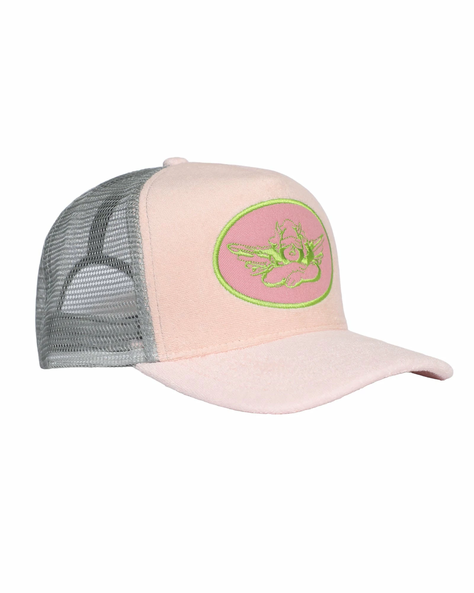 Grey trucker hat with pink patch and peach terry cloth. Adjustable snapback.