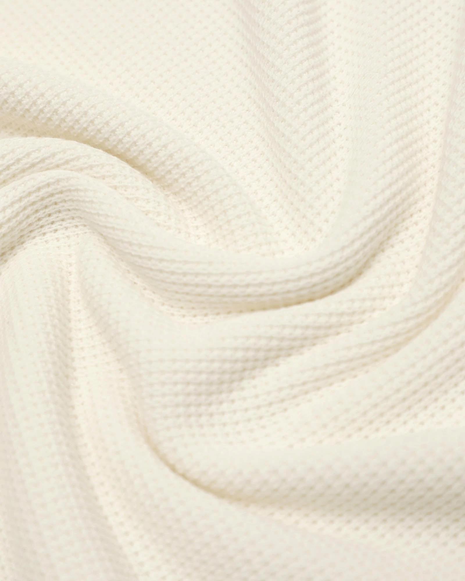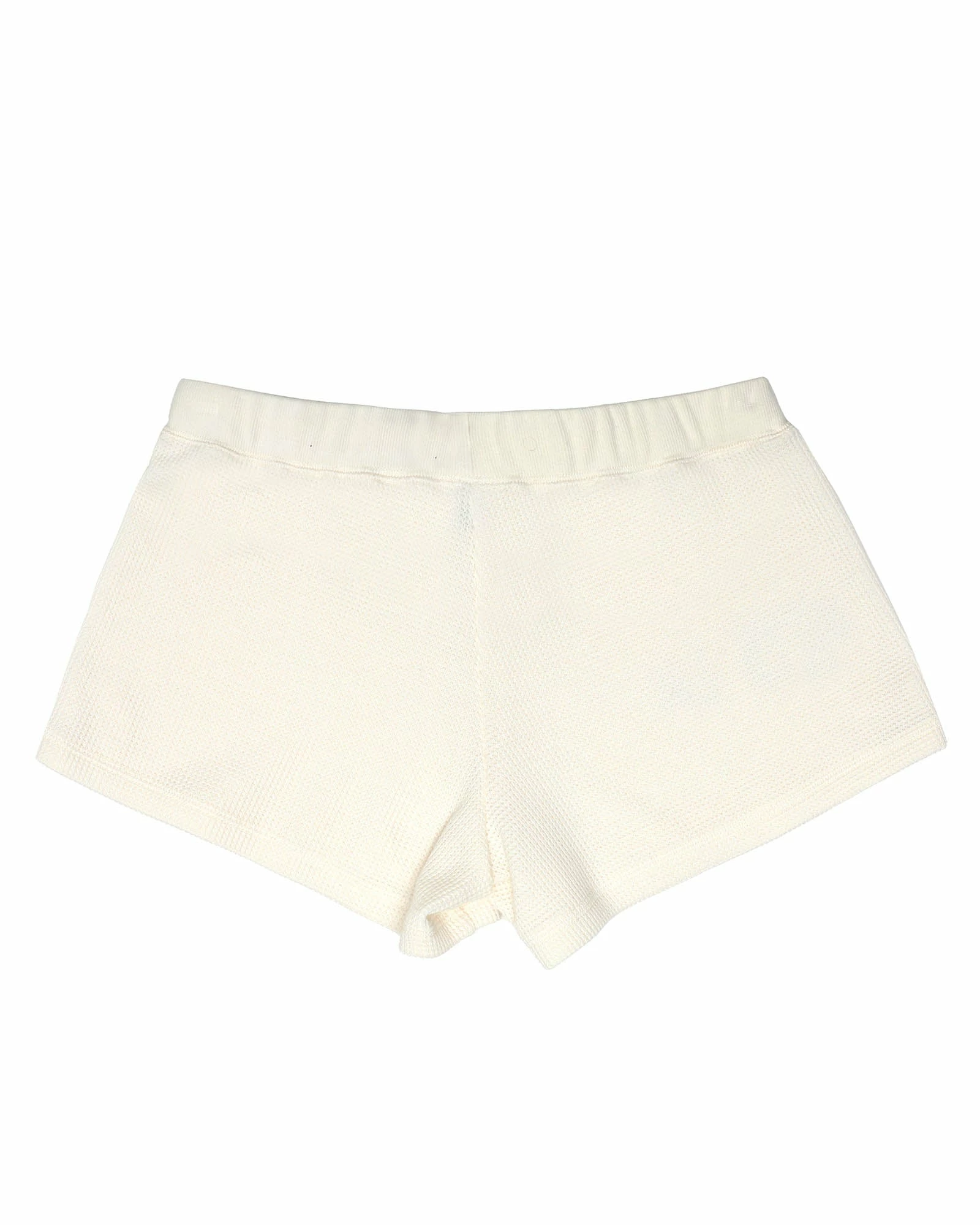 Soft thermal fabric in cream. Mid-rise shorts with adjustable drawstring.