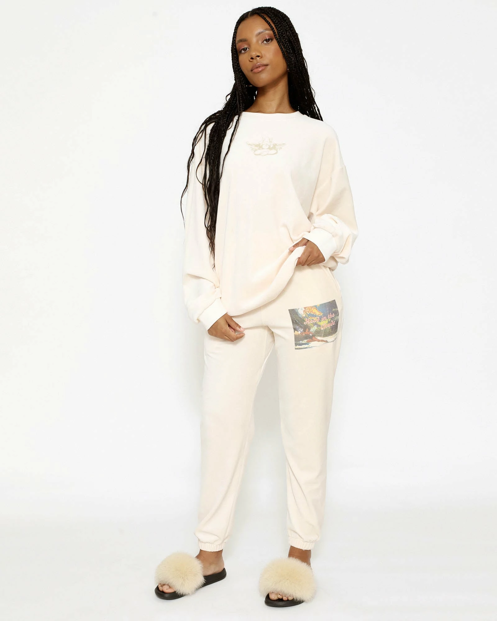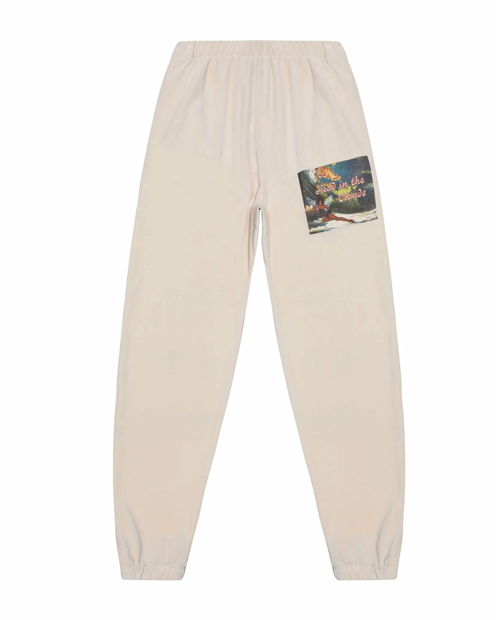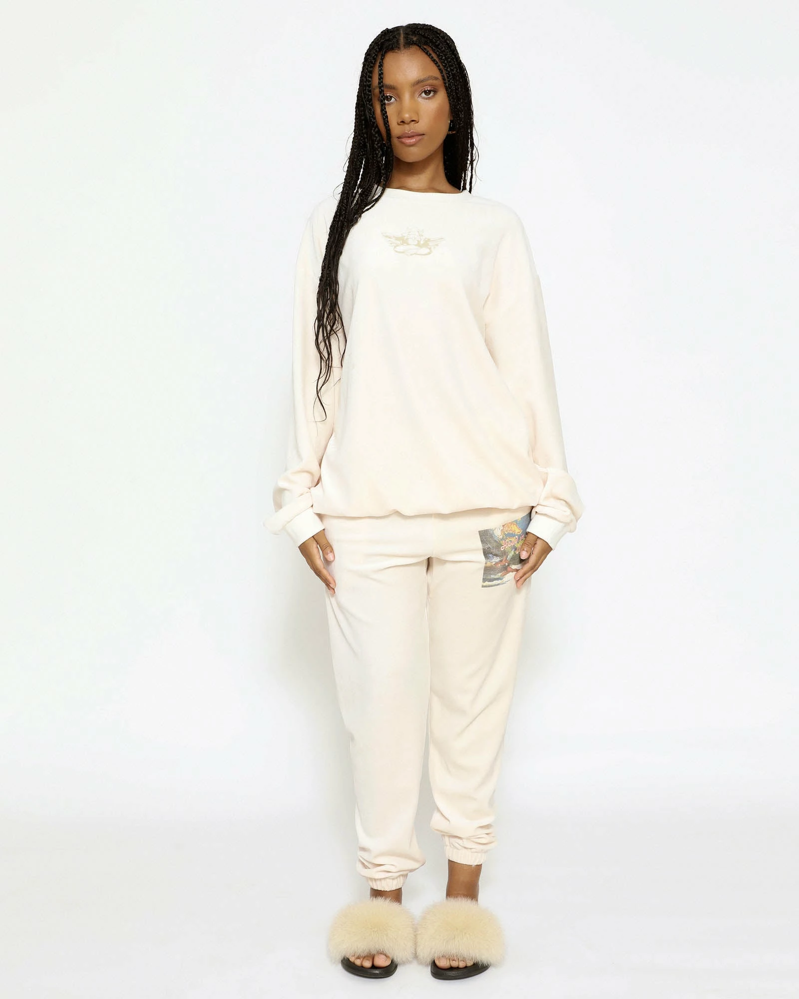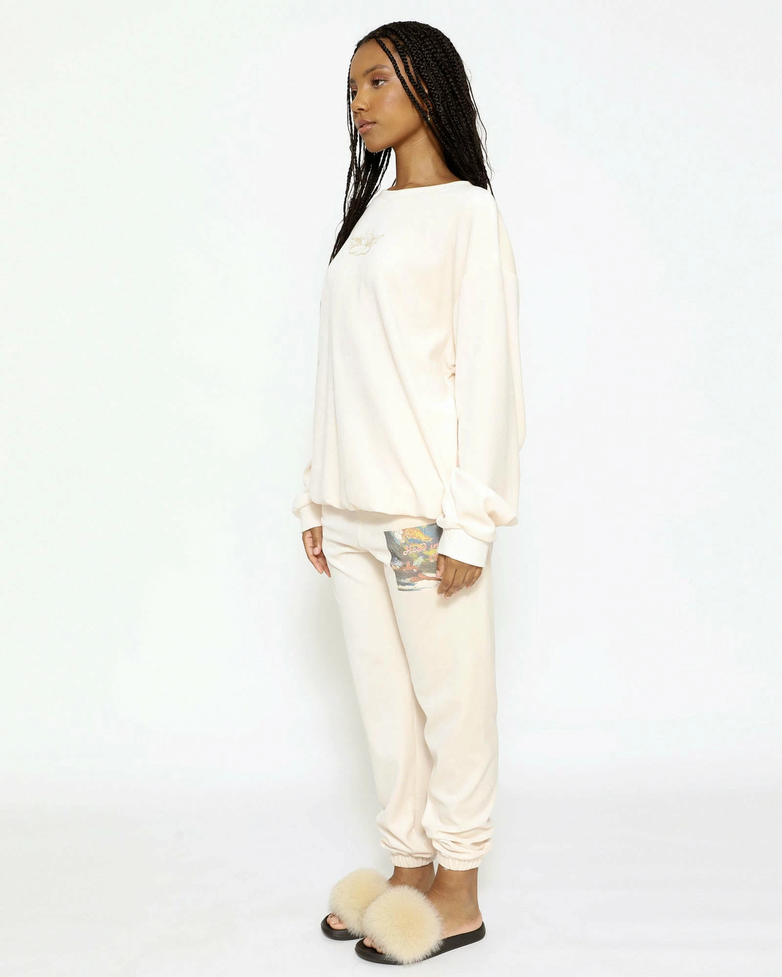Lightweight velour fabric in blush pink. High rise sweatpants with back and side pockets, elastic waistband and cuffs. This print is designed to crackle, just like your favorite vintage sweatpants.