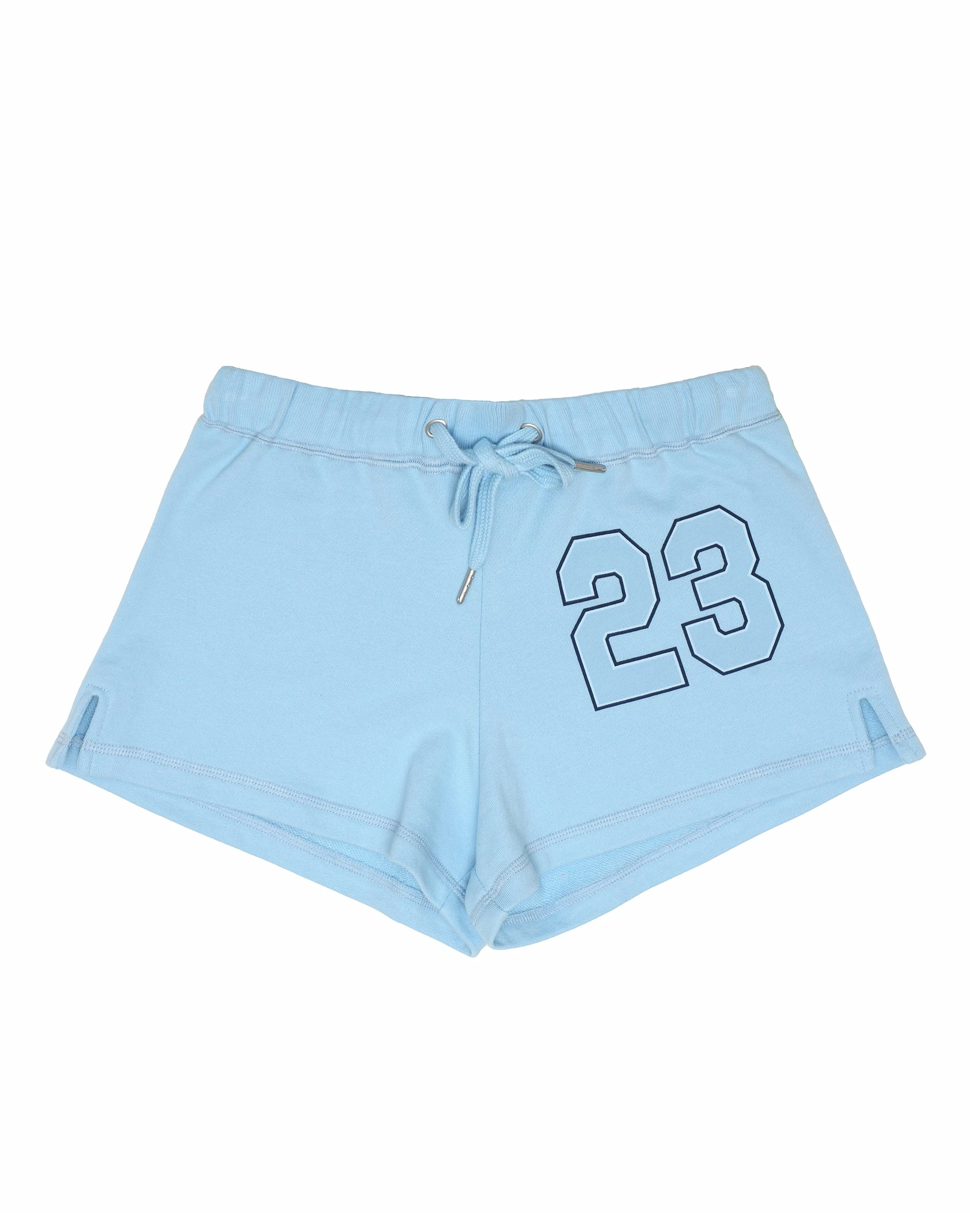 Lightweight french terry fabric in sky blue. Mid-rise shorts with adjustable drawstring.