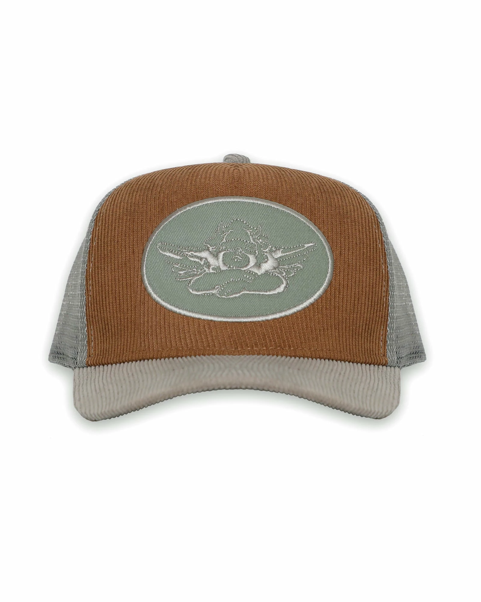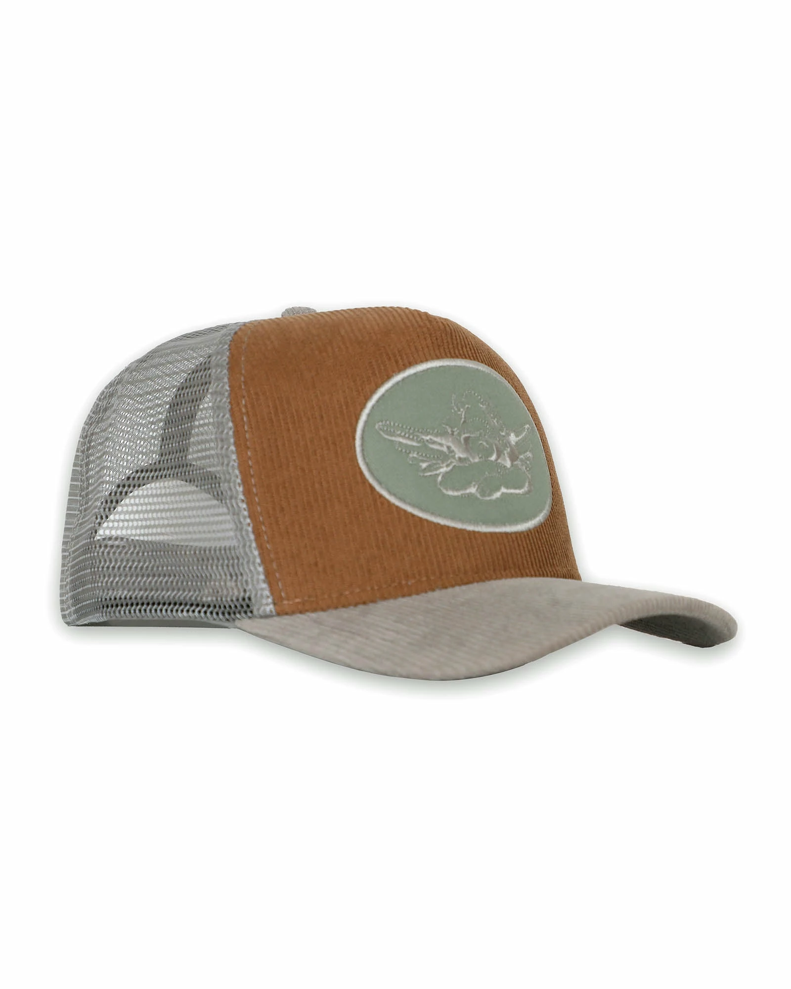 Grey trucker hat with grey patch and brown corduroy. Adjustable snapback.