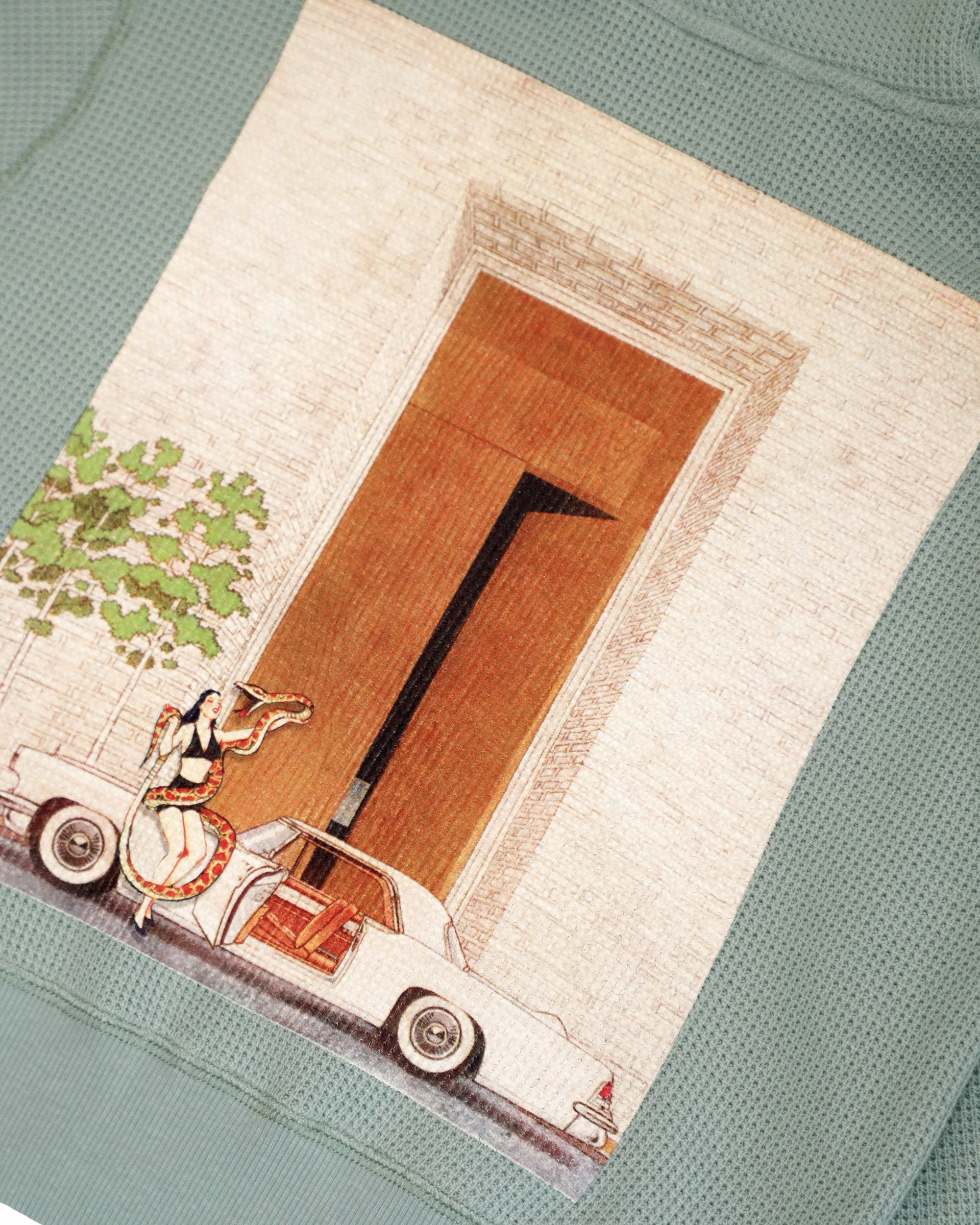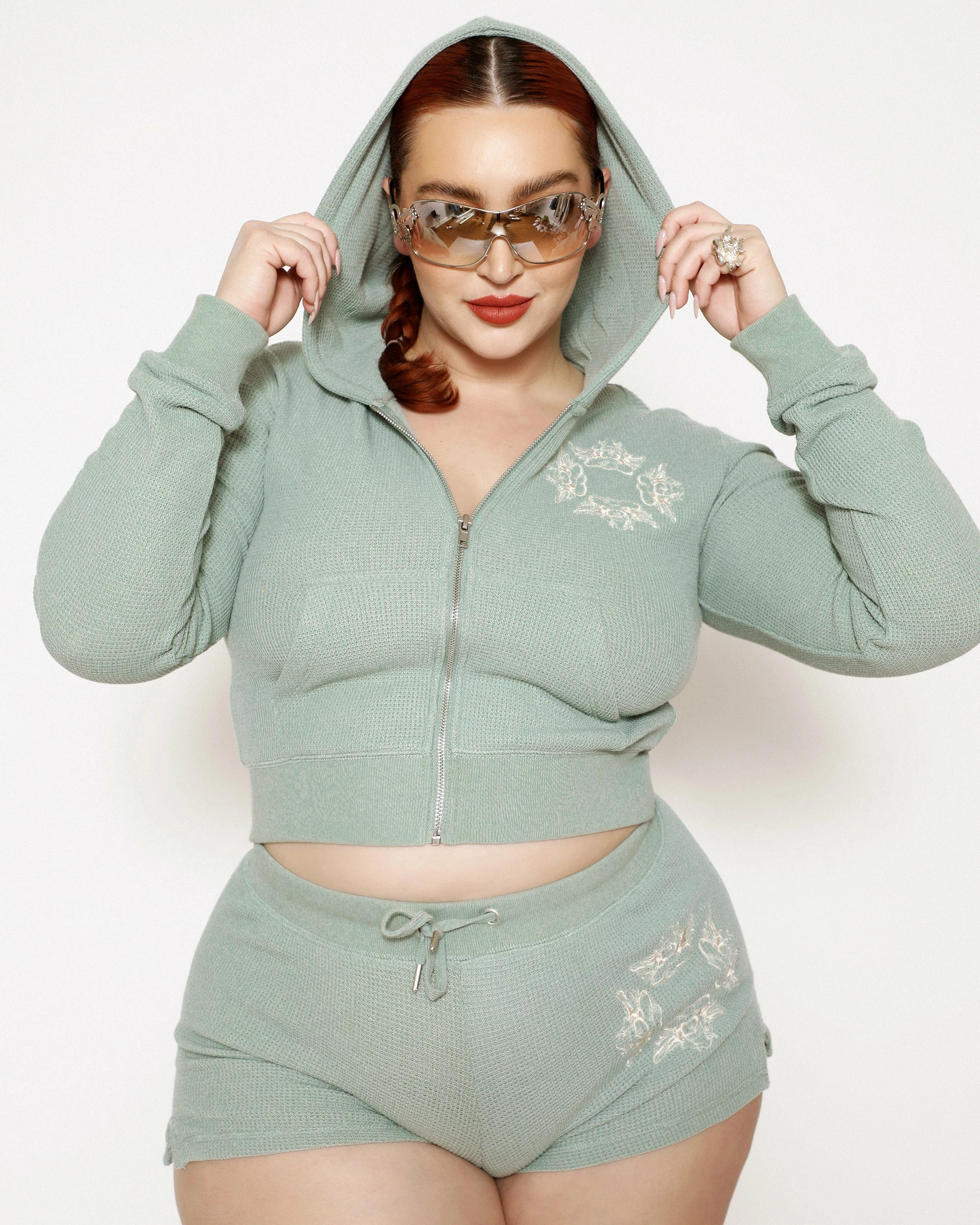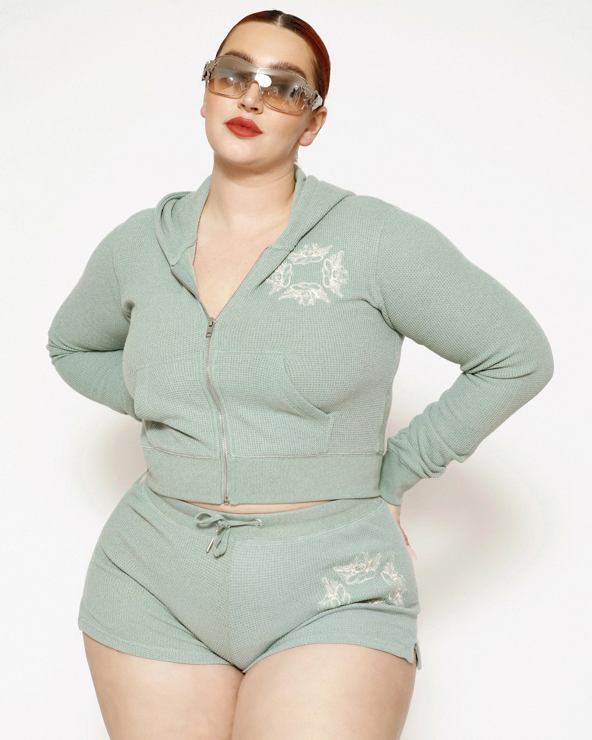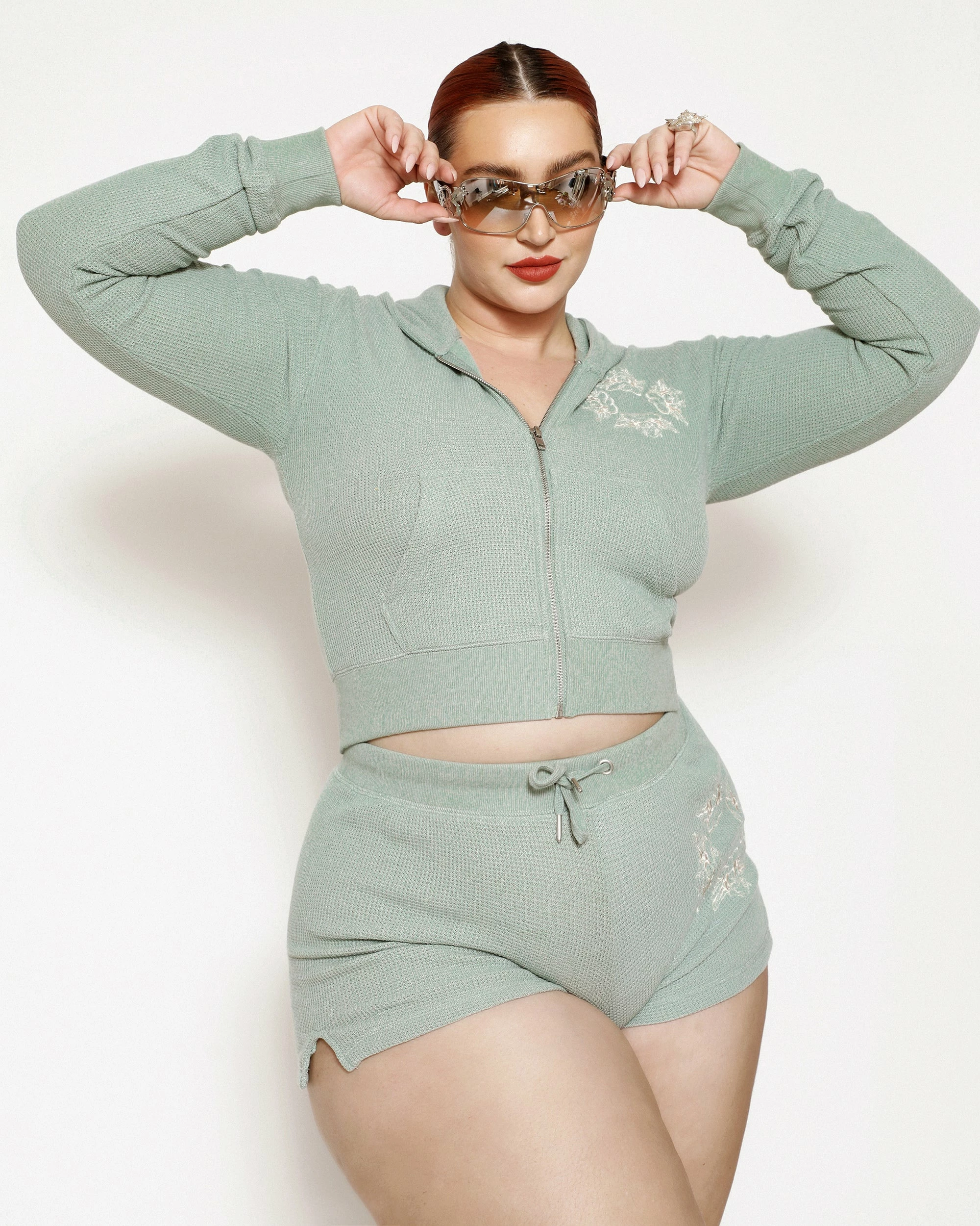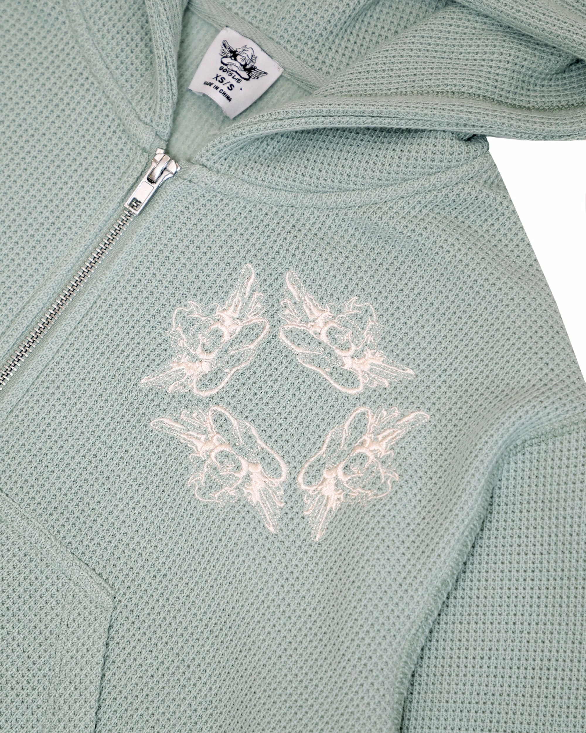 Soft thermal fabric in sage green. Zip up hoodie with cropped hem, front pockets, and embroidered front logos.