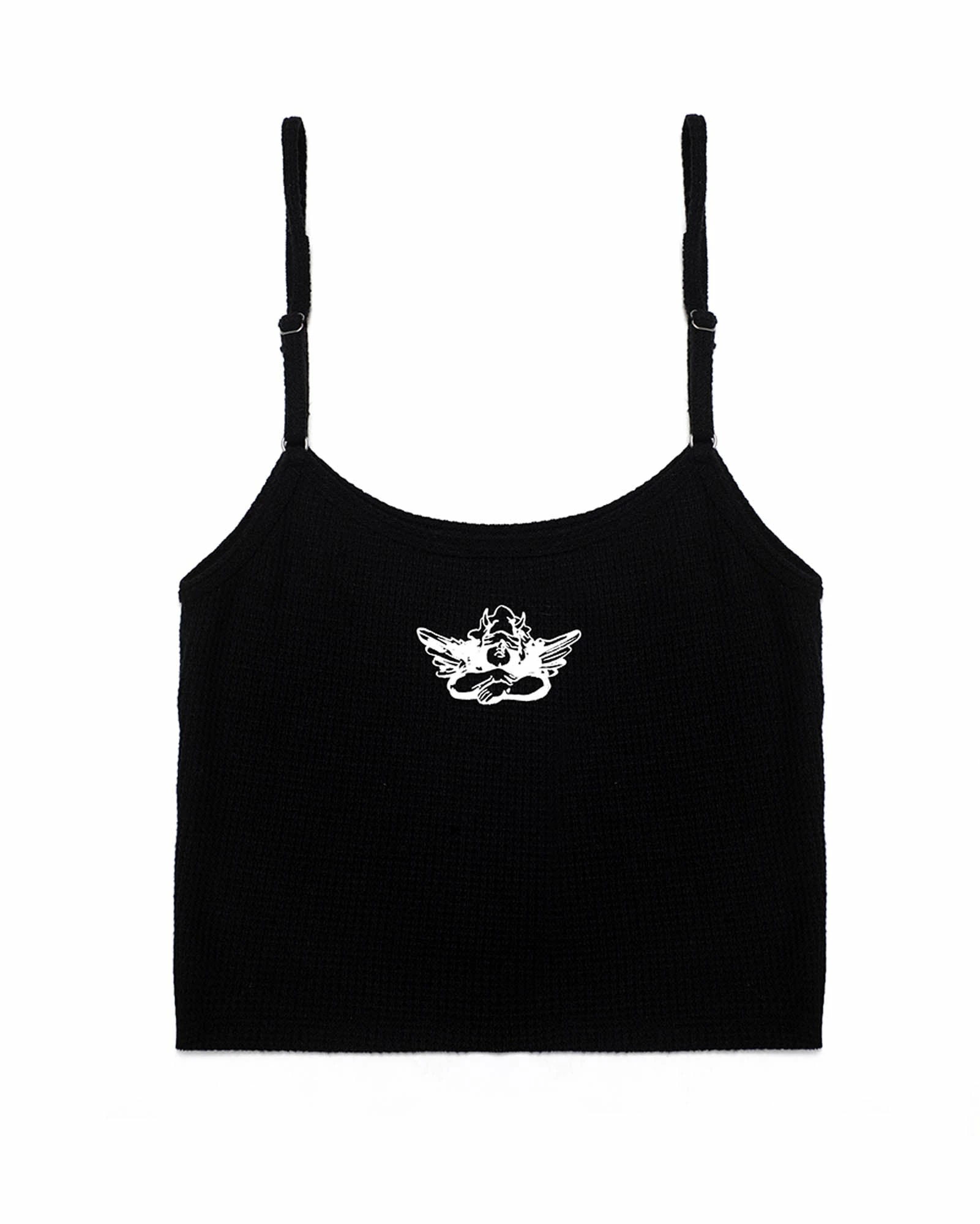 Soft thermal crop tank in black with adjustable straps and rhinestone embellishments.