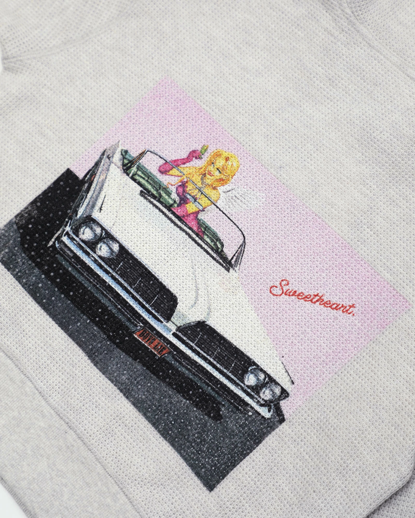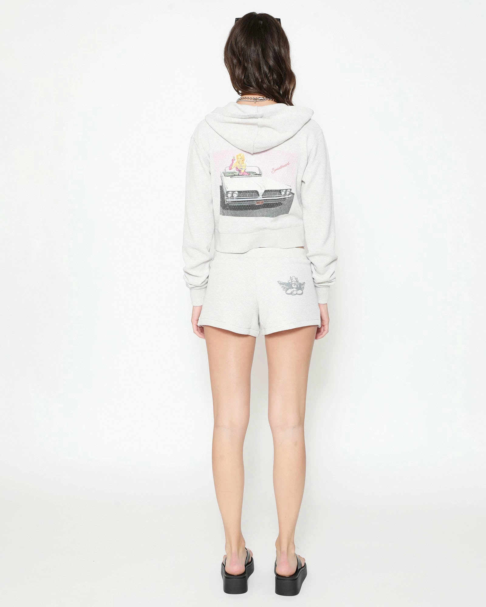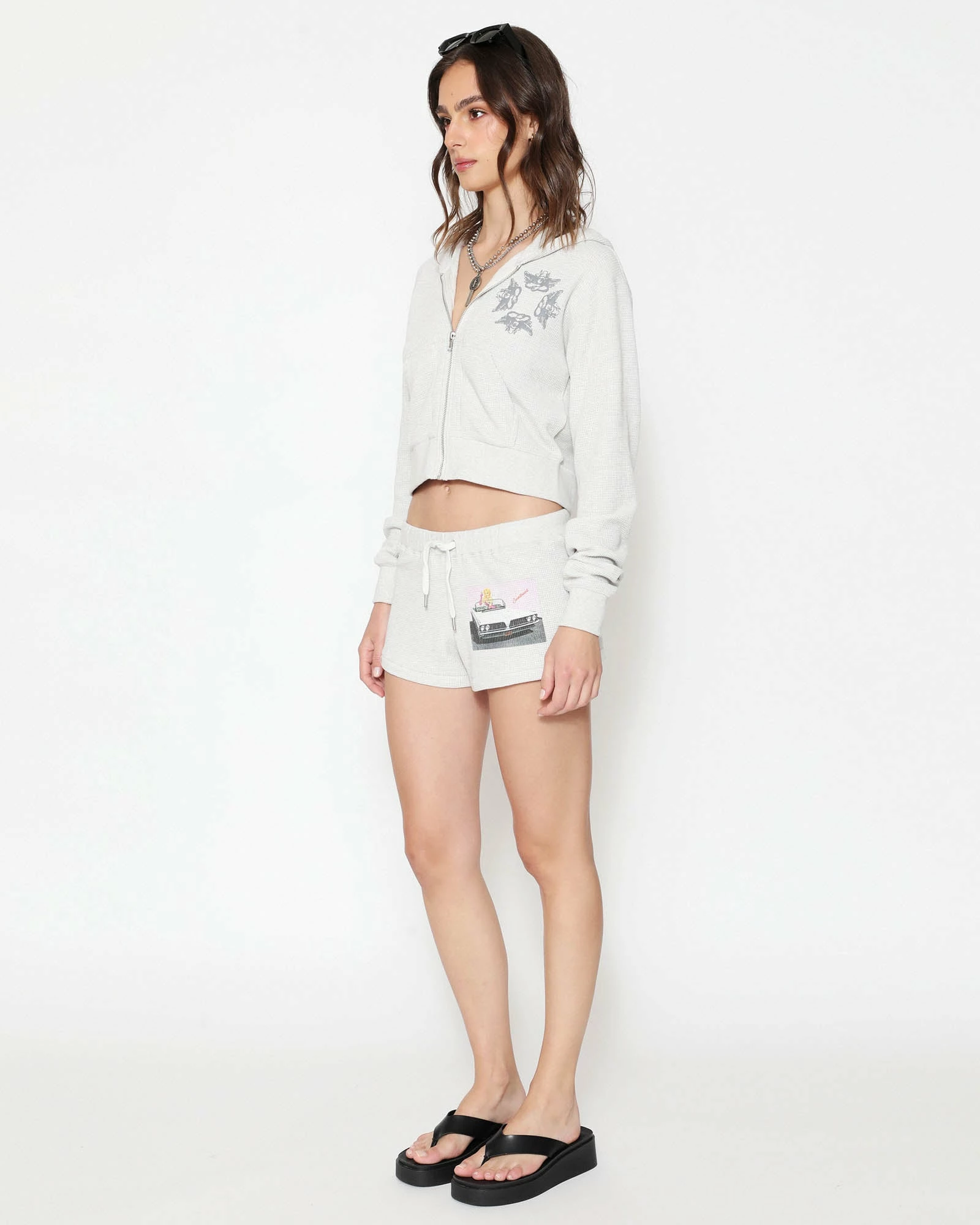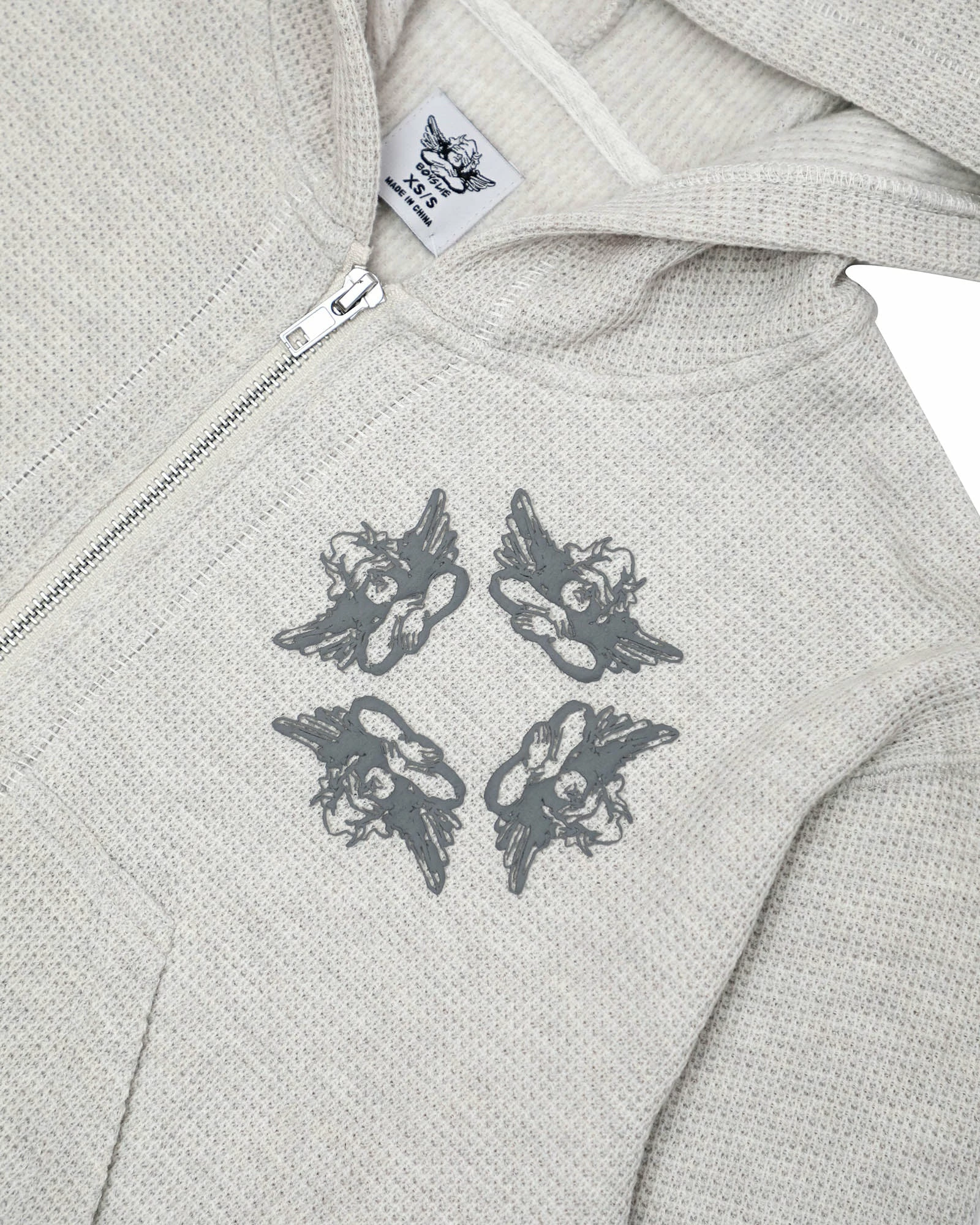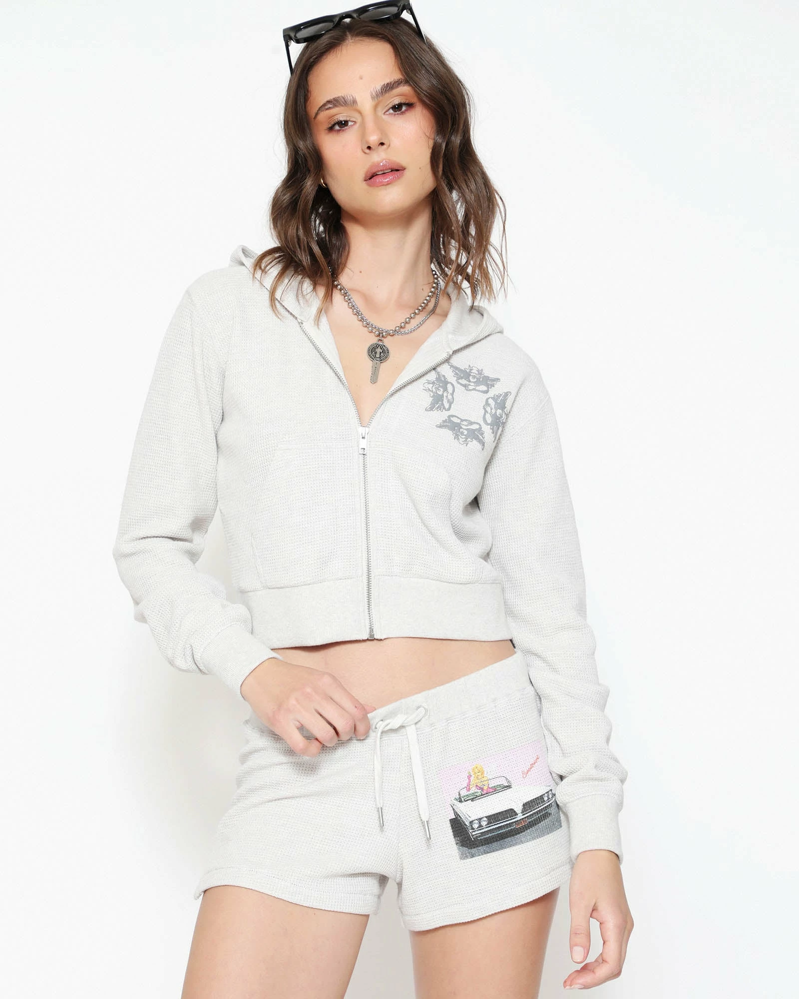 Soft thermal fabric in heather grey. Zip up hoodie with cropped hem, front pockets, and ribbed cuffs. Features puff print logos and rhinestone embellishments.