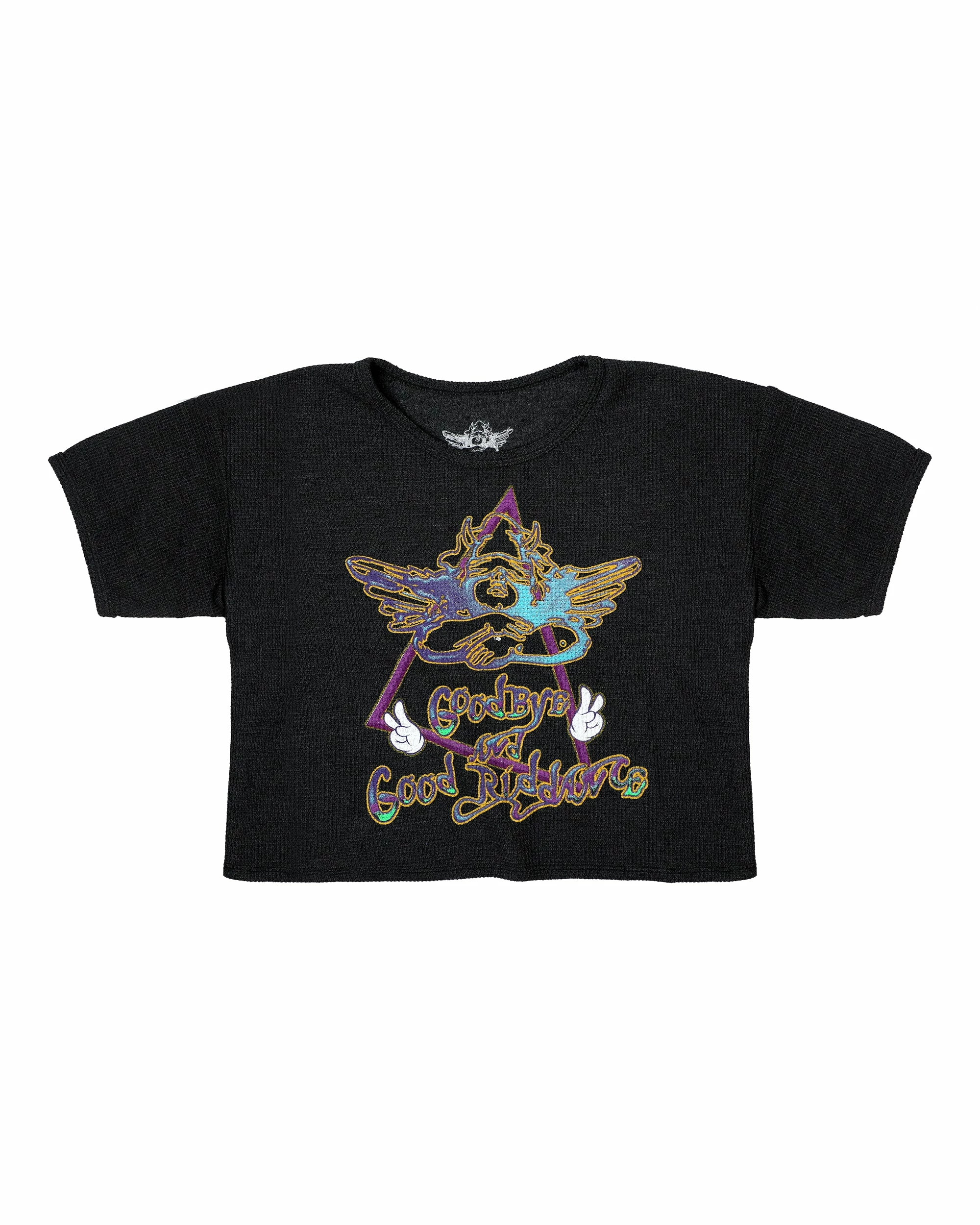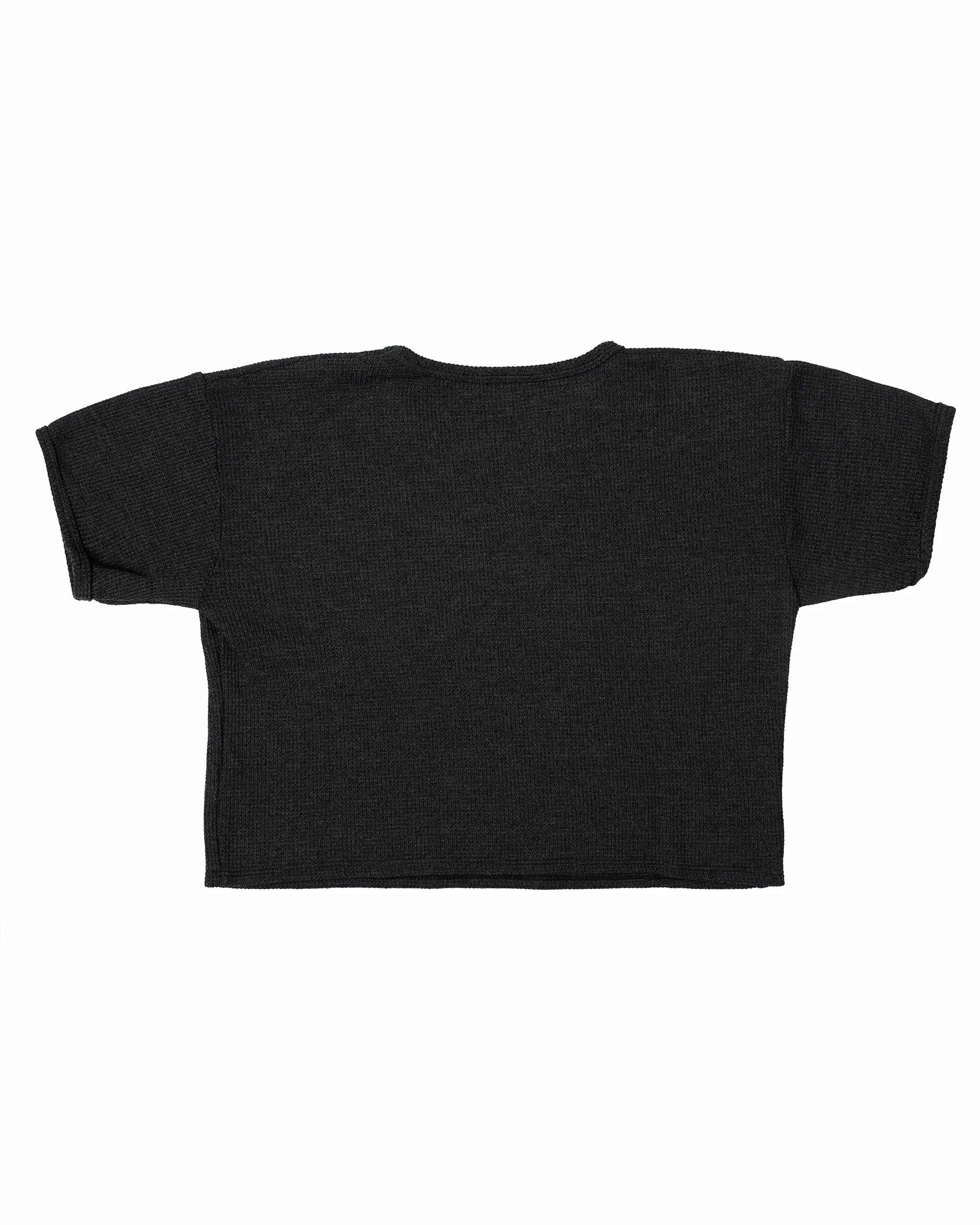 Soft thermal fabric. Cropped hem, short sleeves, and a relaxed fit.