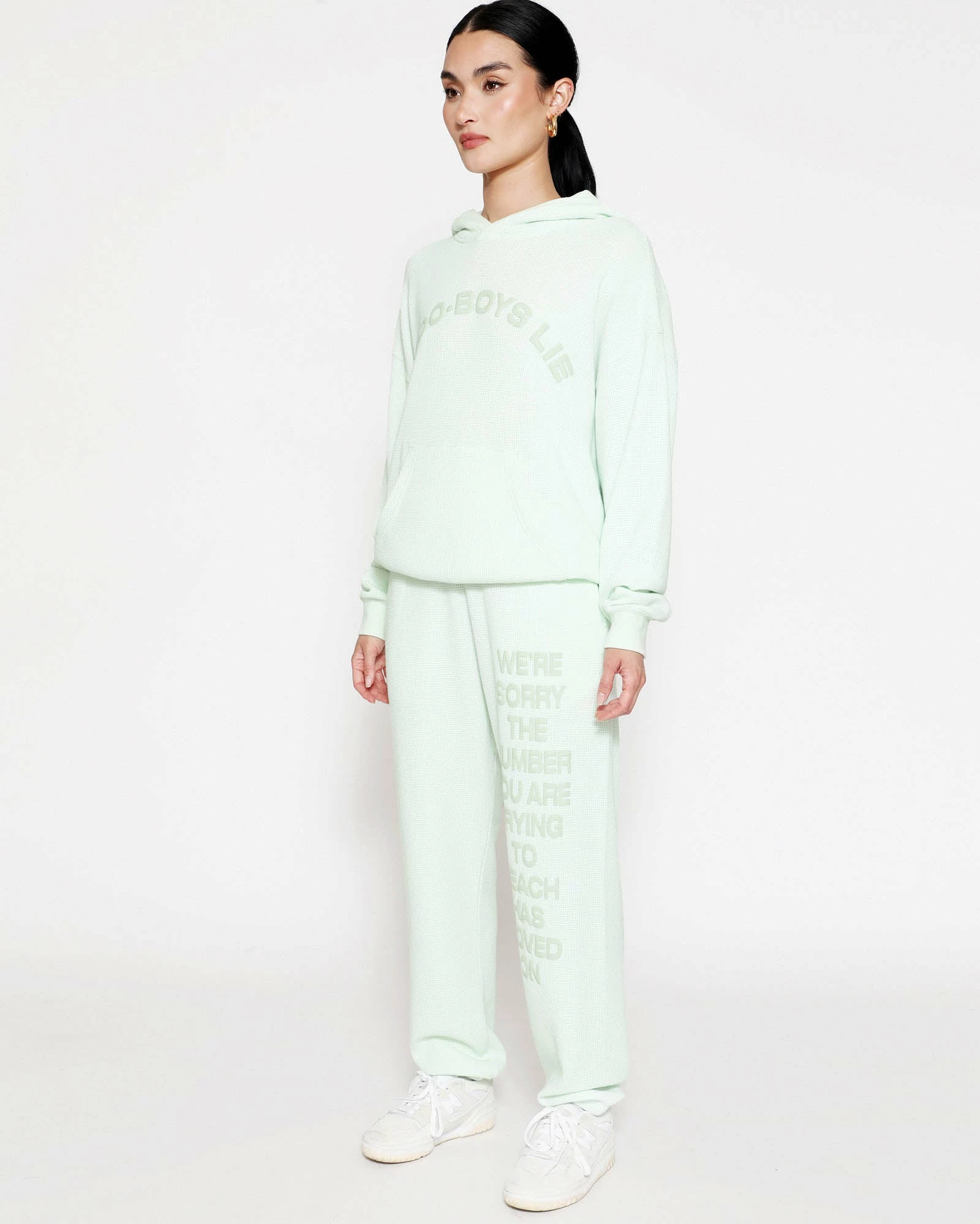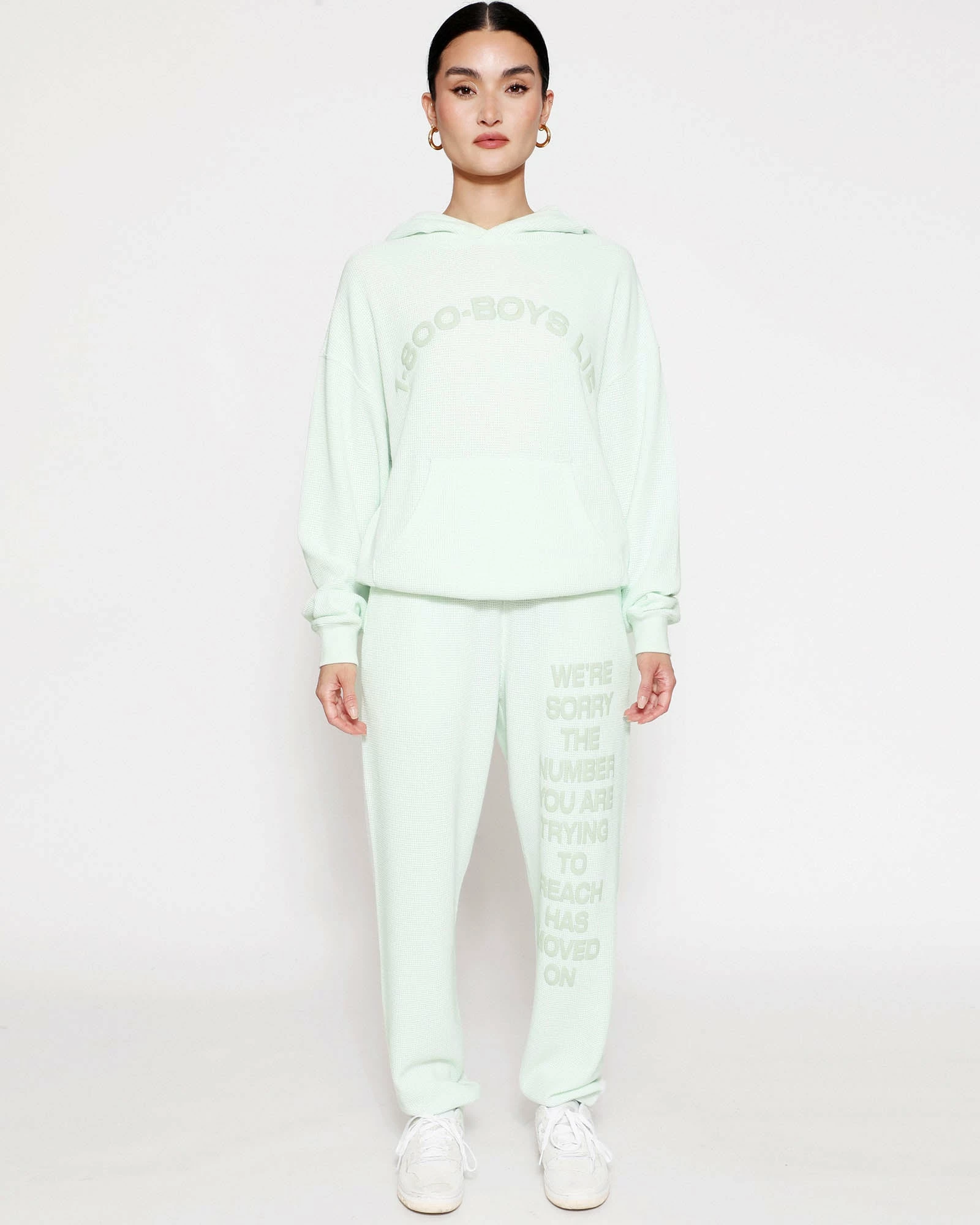 Soft thermal fabric in a soft green. High rise sweatpants with back and side pockets, elastic waistband and cuffs. Features puff print graphics.