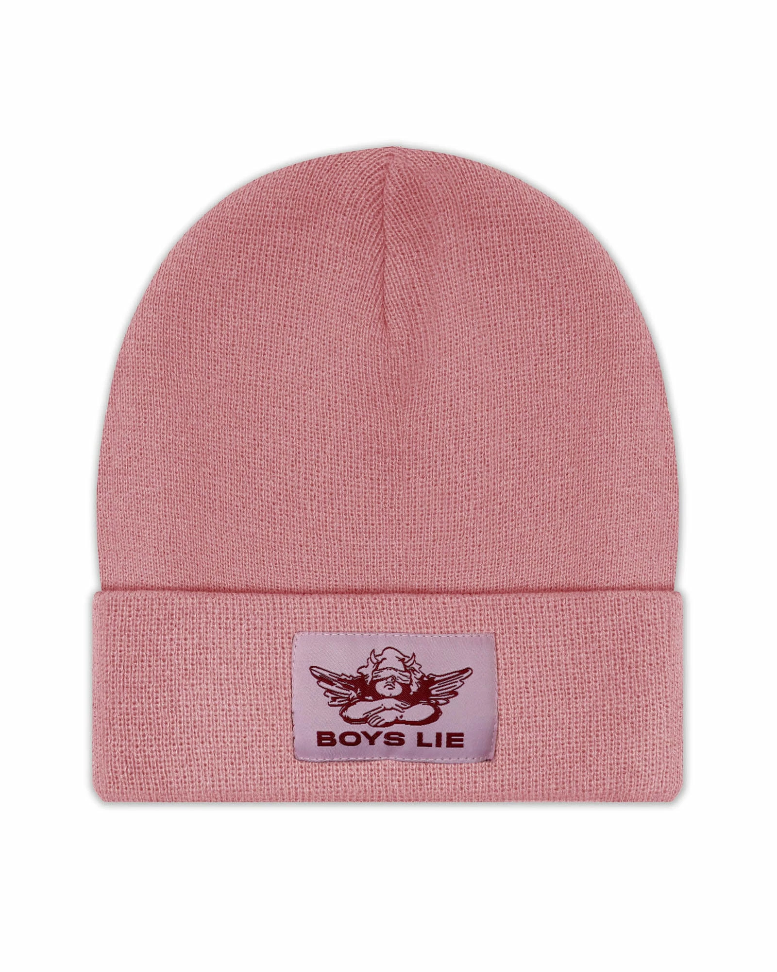 Dusty pink beanie with mauve Boys Lie logo patch.