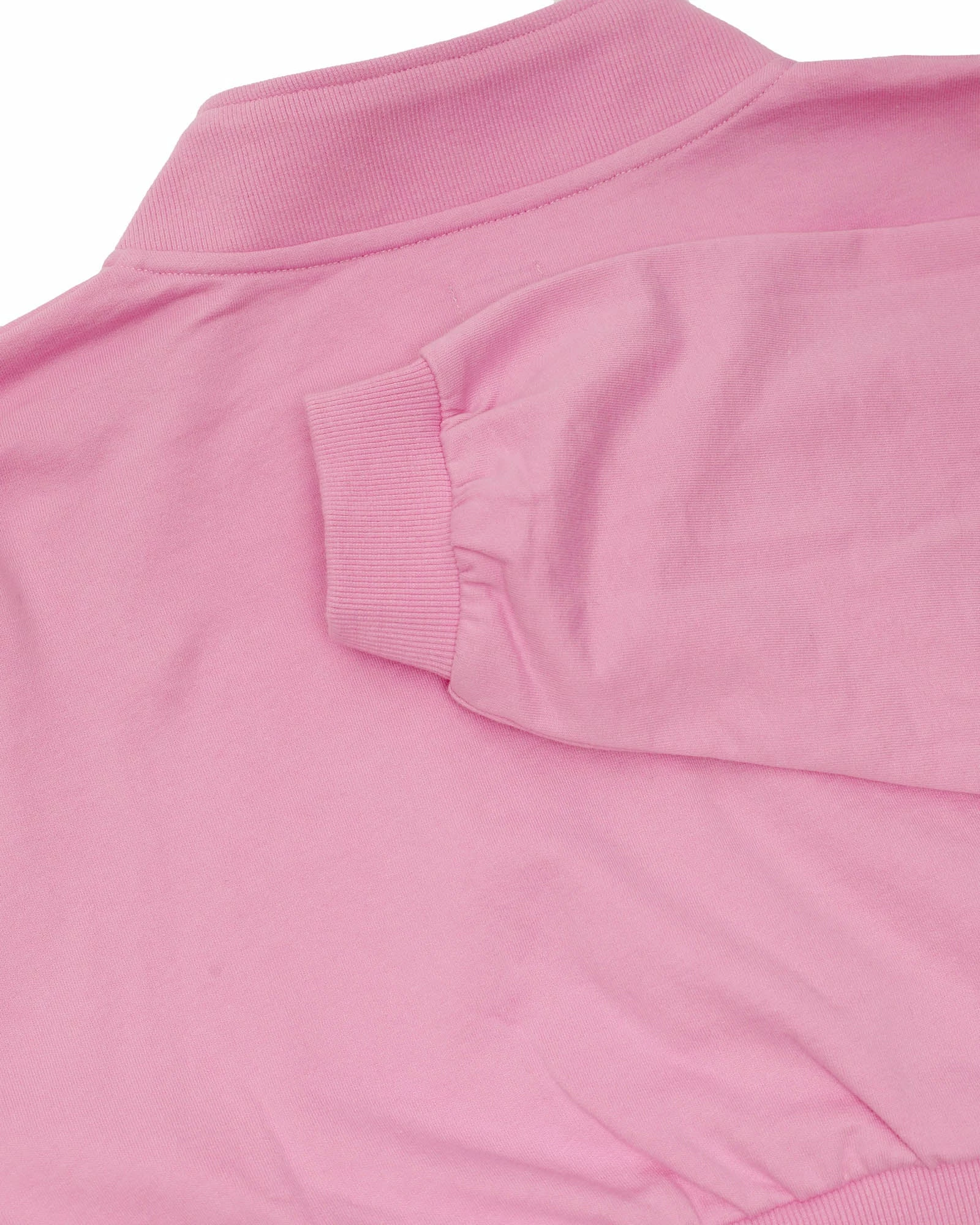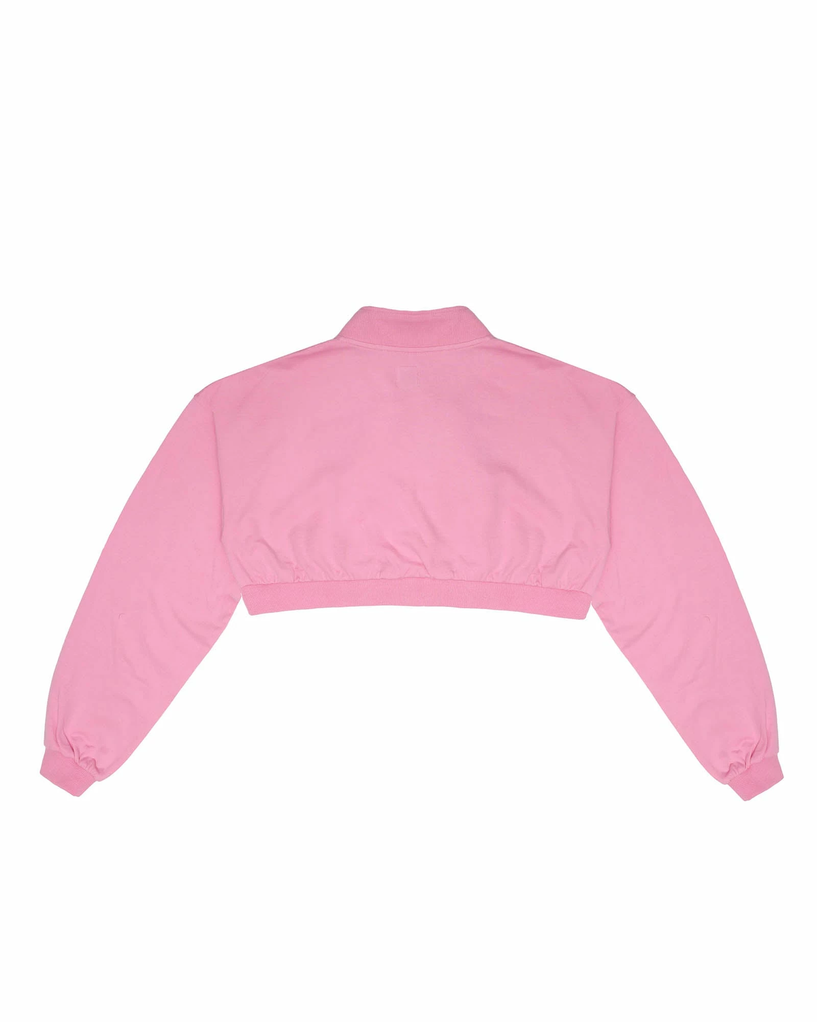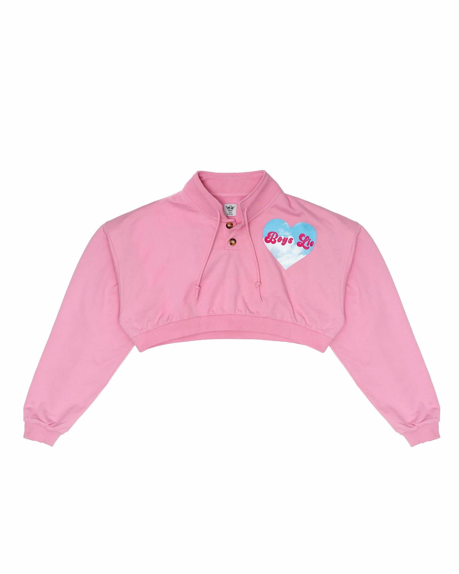 Lightweight fleece fabric in pink. Henley style cropped crewneck with buttons, drawstring, and ribbed cuffs and hem.