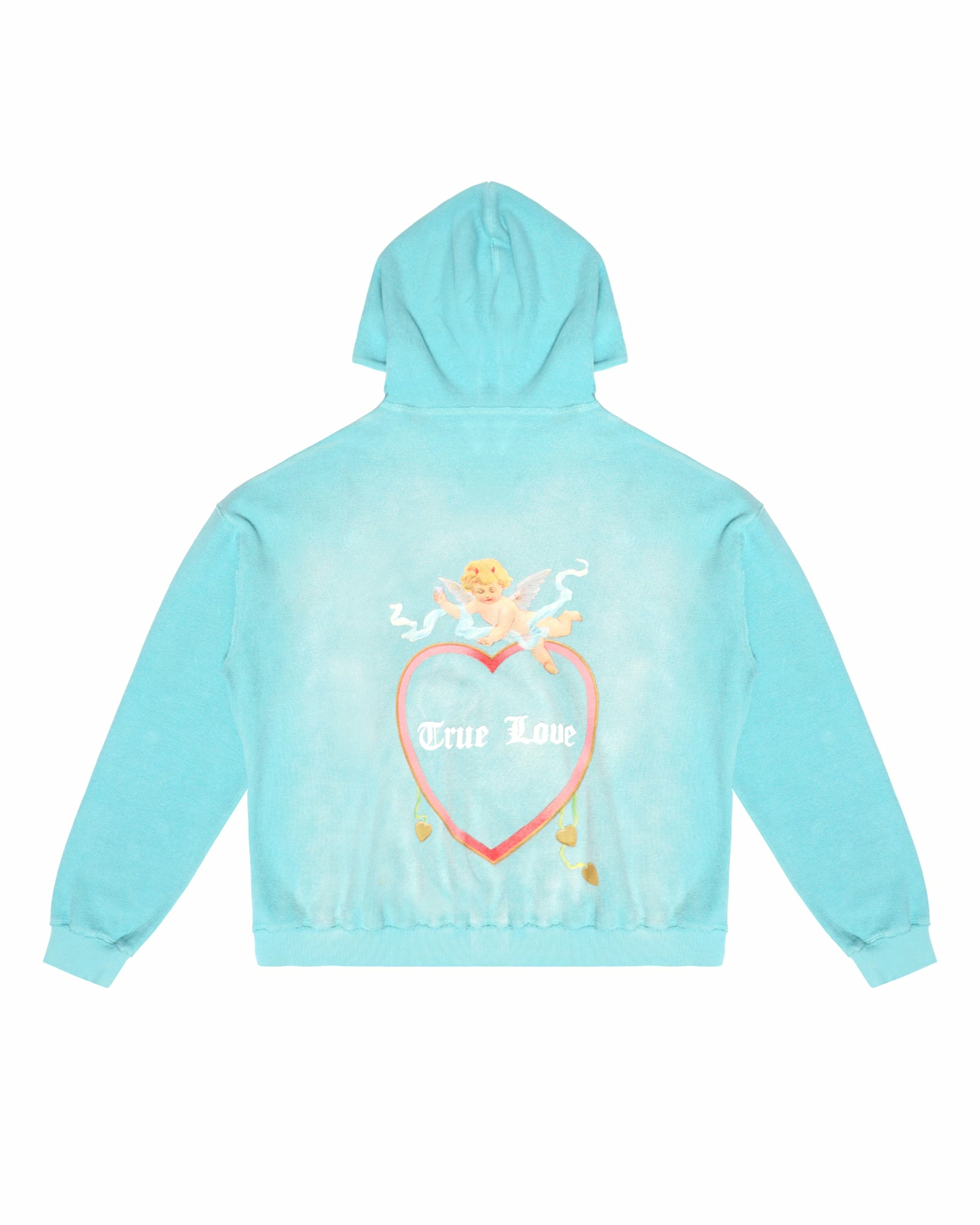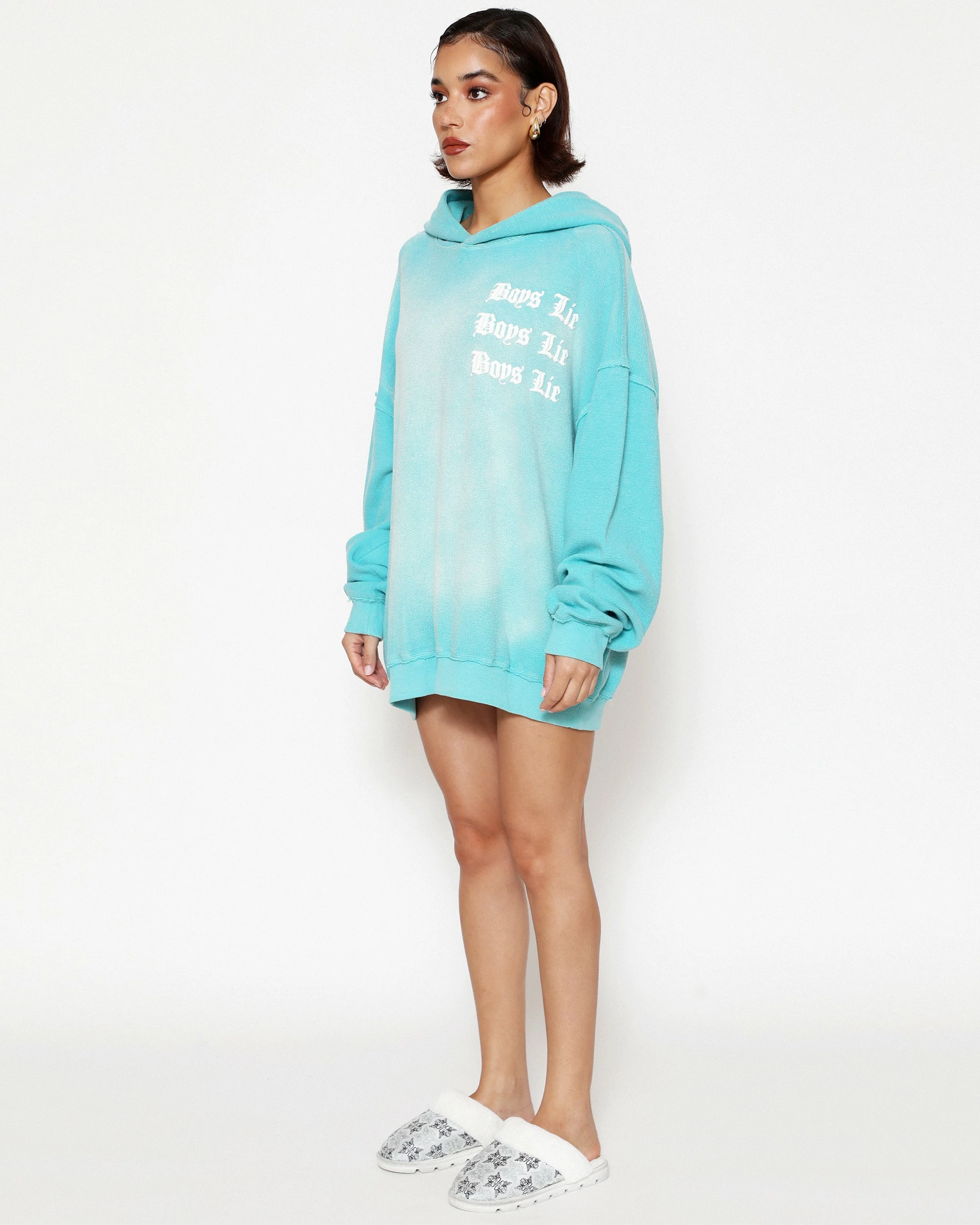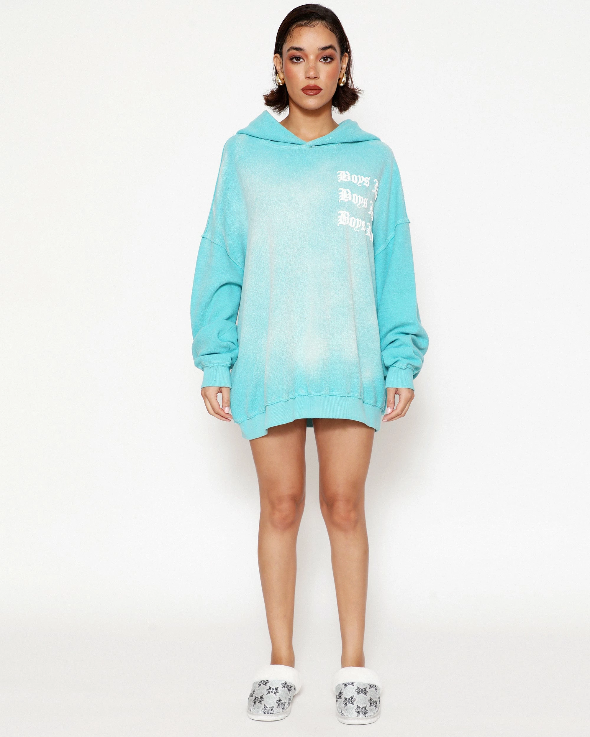 Inside out french terry fabric in teal with potassium dye treatment. Oversized hoodie featuring a dramatic hood and front and back printed graphics.
