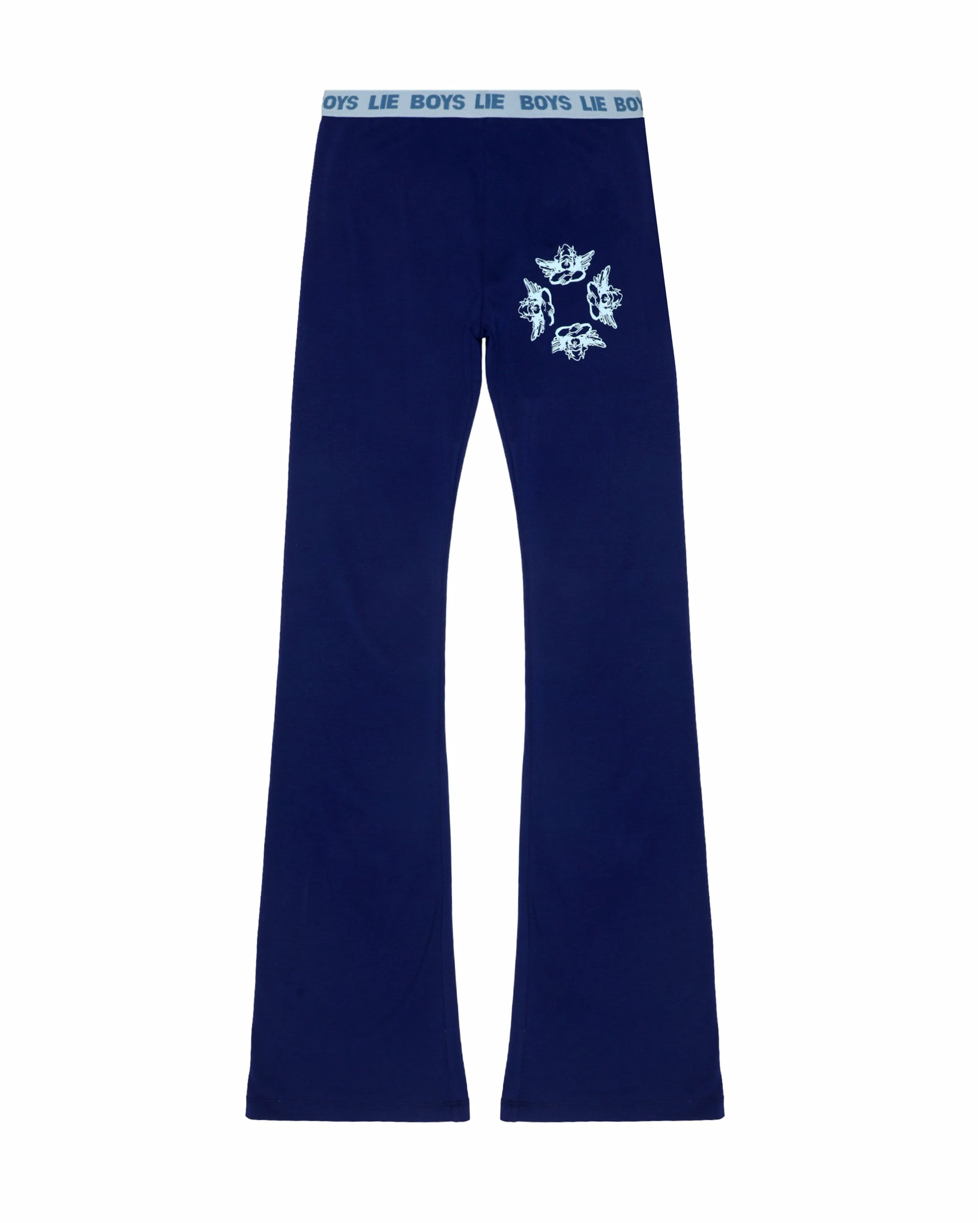 Mid-rise flared yoga pant in blue with elastic waistband. Printed front graphic.