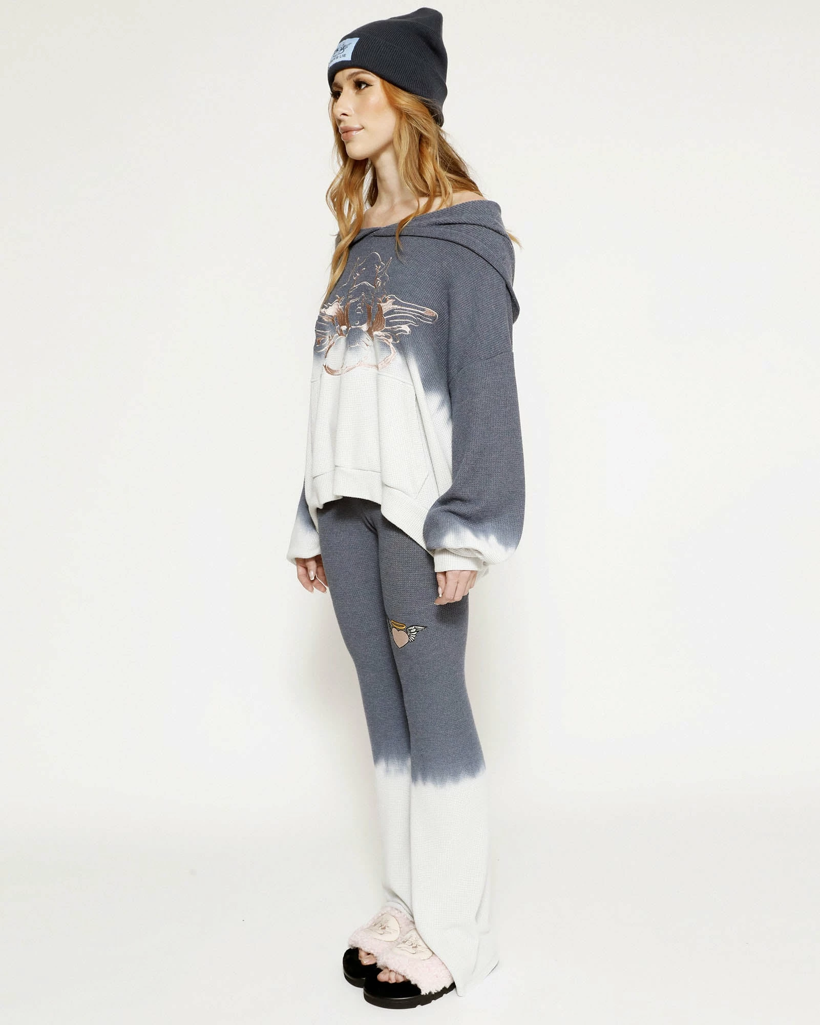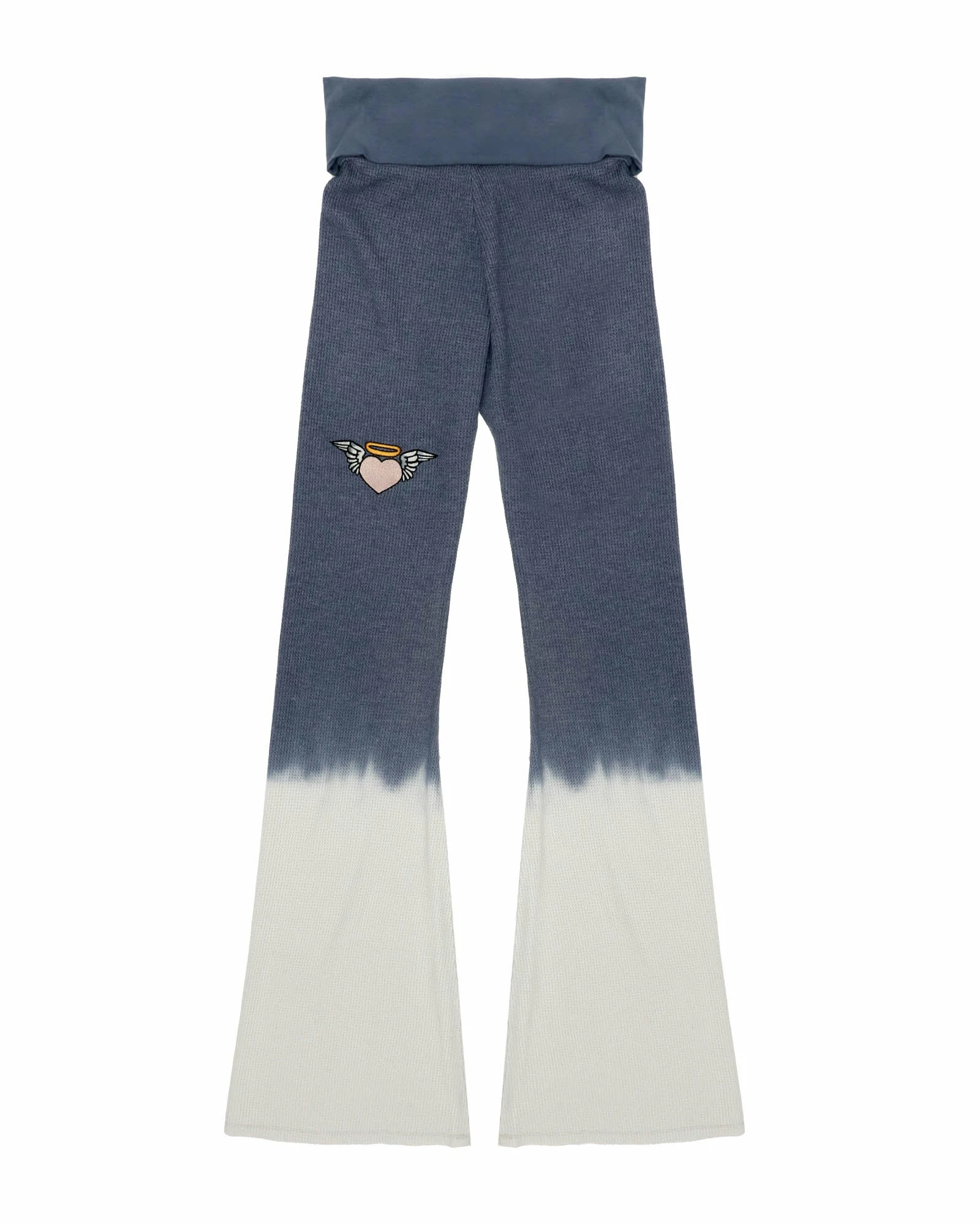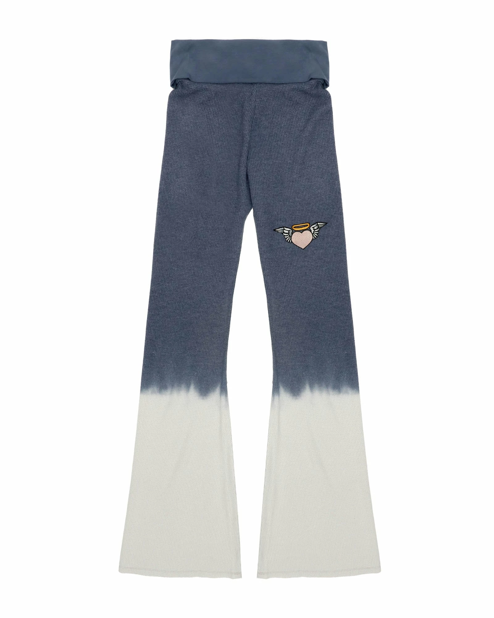 Mid rise soft thermal pants in blue and white dip dye with embroidered designs on the front and back. Adjustable jersey fold-over waistband and flared hem. These items are individually dyed and may have slight color variations.