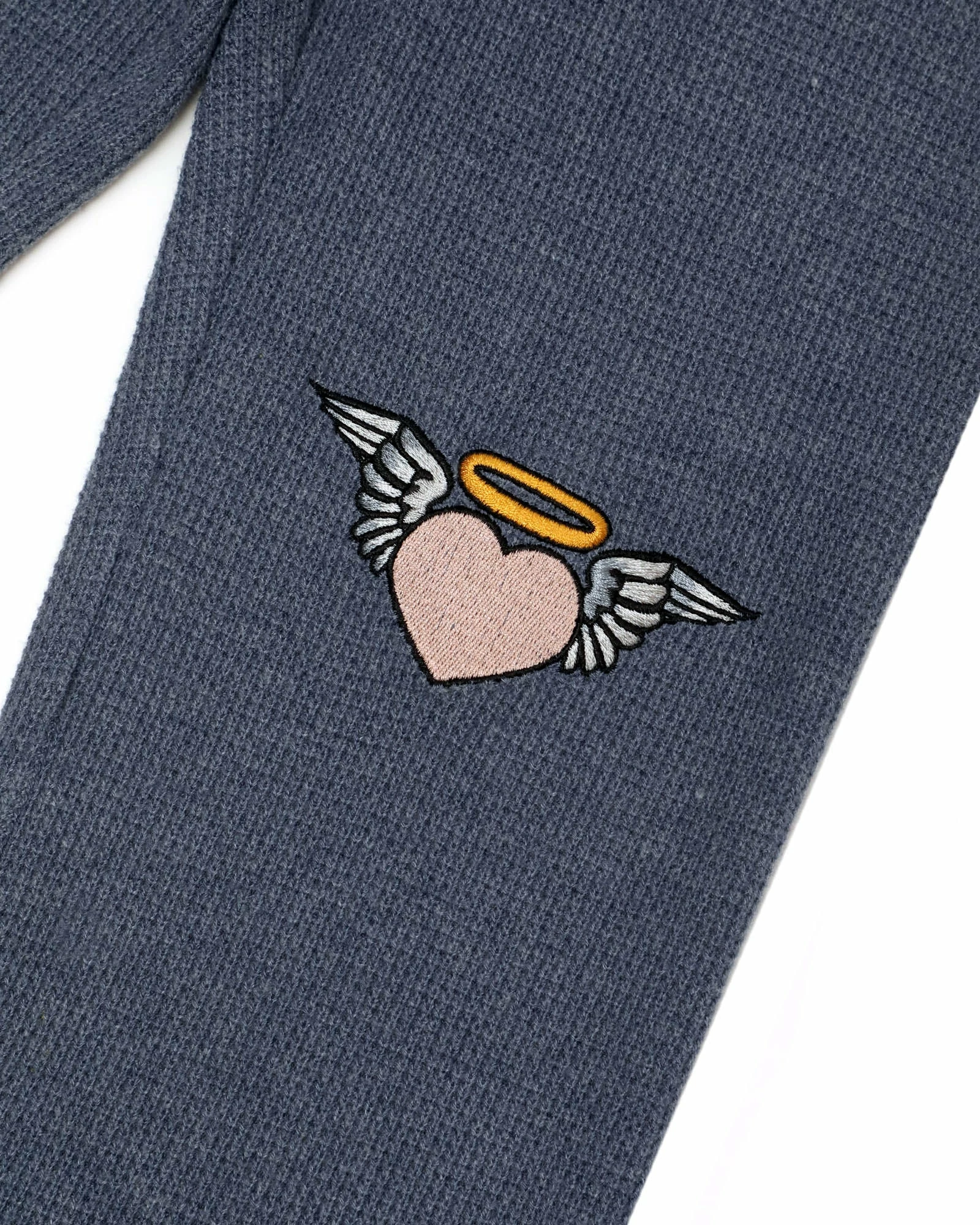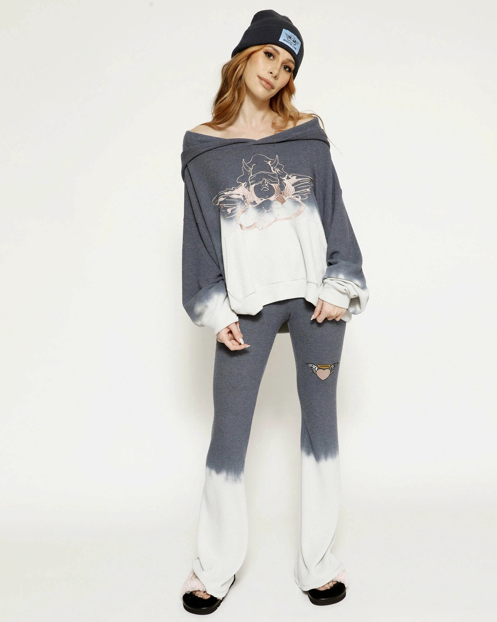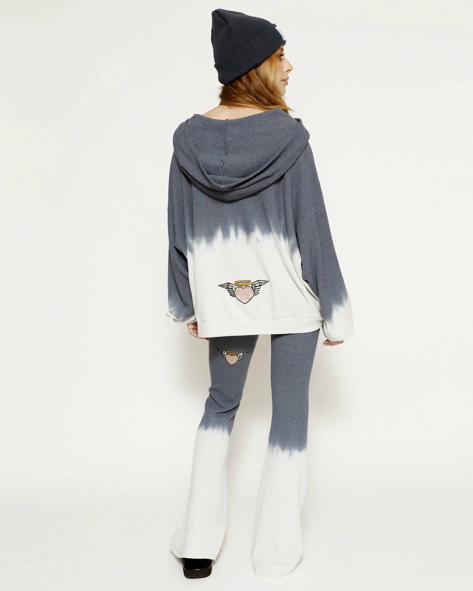 Mid rise soft thermal pants in blue and white dip dye with embroidered designs on the front and back. Adjustable jersey fold-over waistband and flared hem. These items are individually dyed and may have slight color variations.