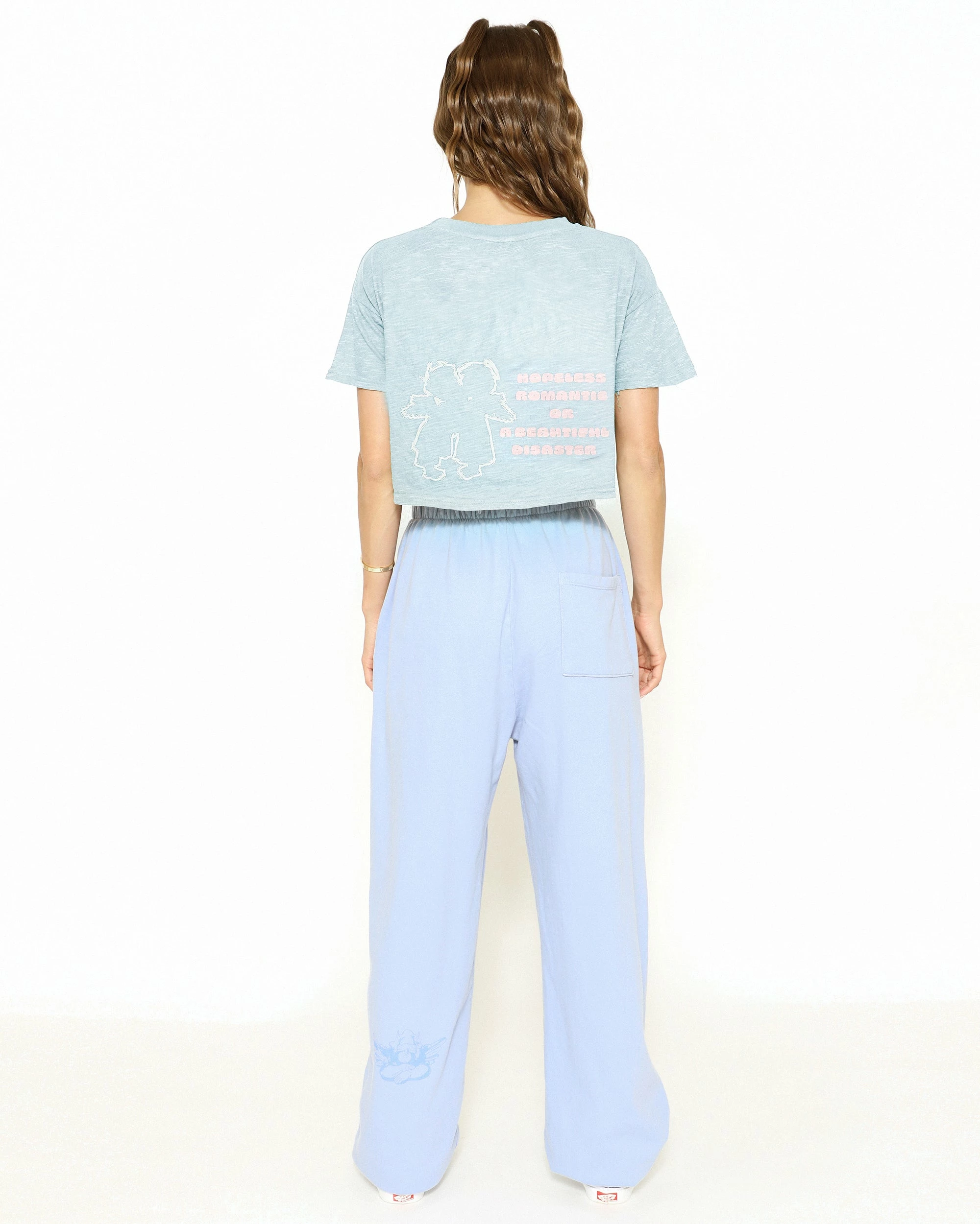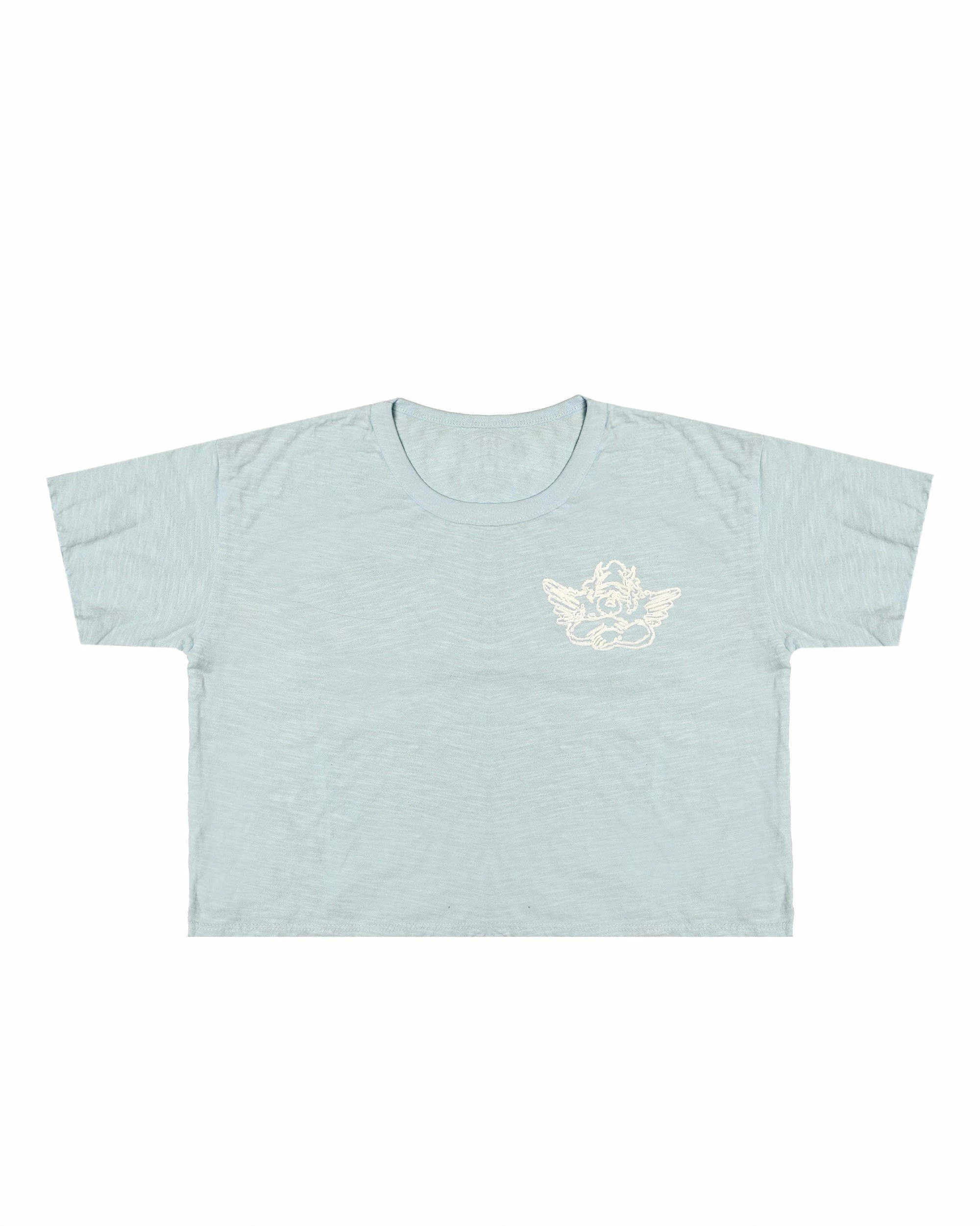 Cotton slub cropped baby tee in baby blue. Lightweight and slightly sheer.
