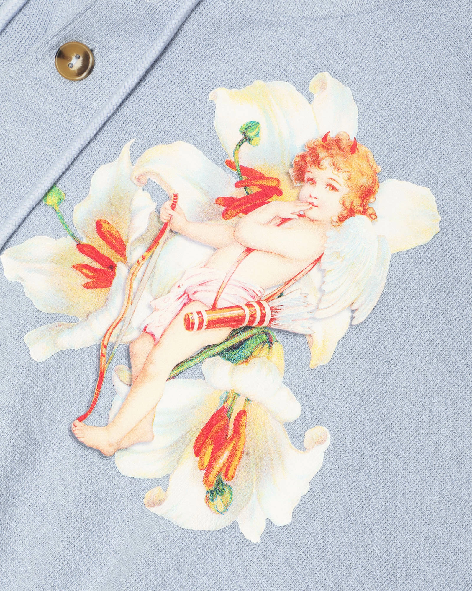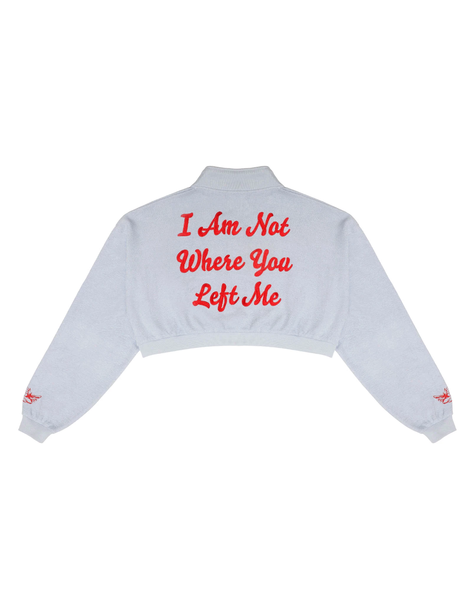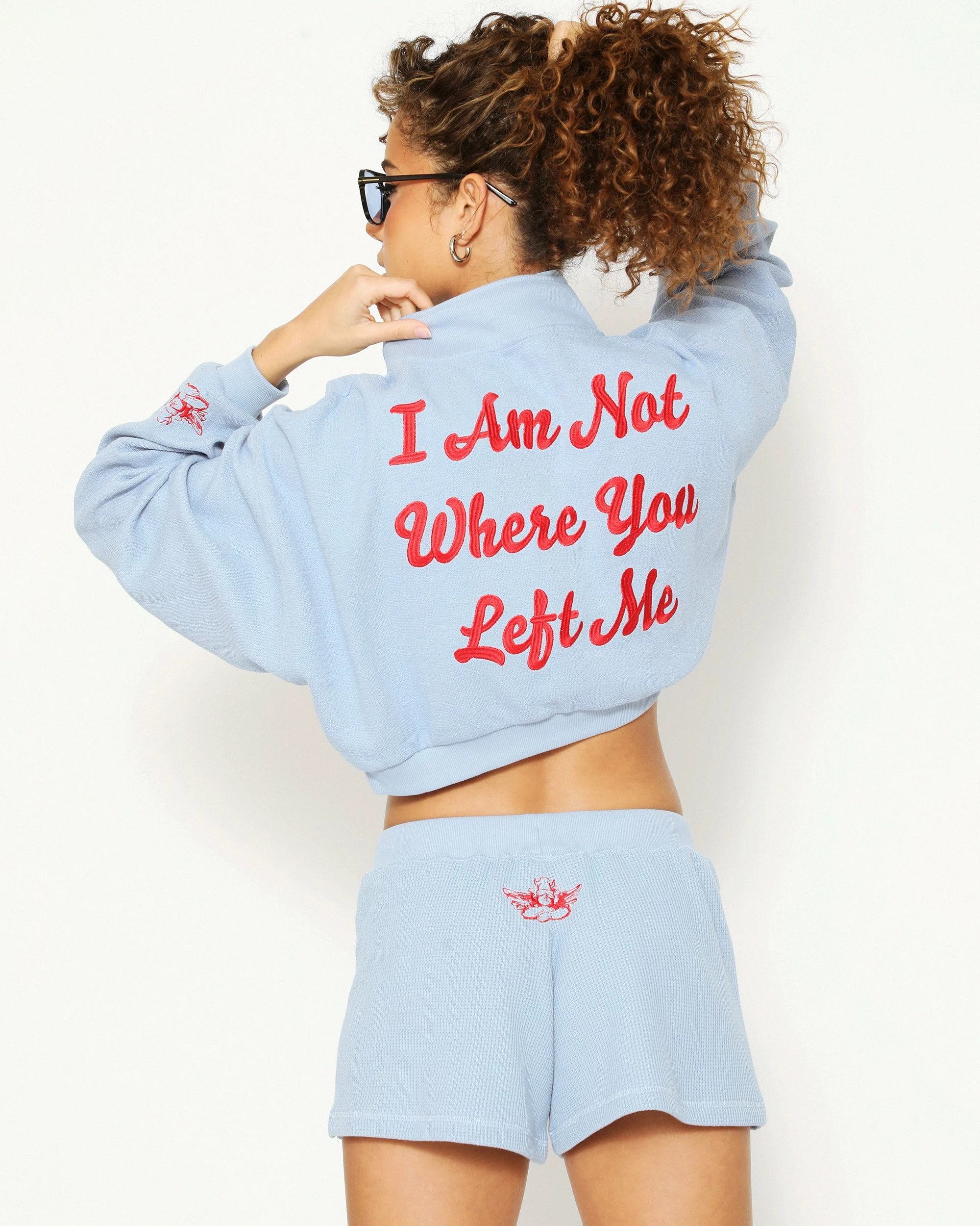 Inside out french terry fabric in blue. Henley style cropped crewneck with button details, drawstring, and ribbed cuffs and hem. Featured embroidery throughout.