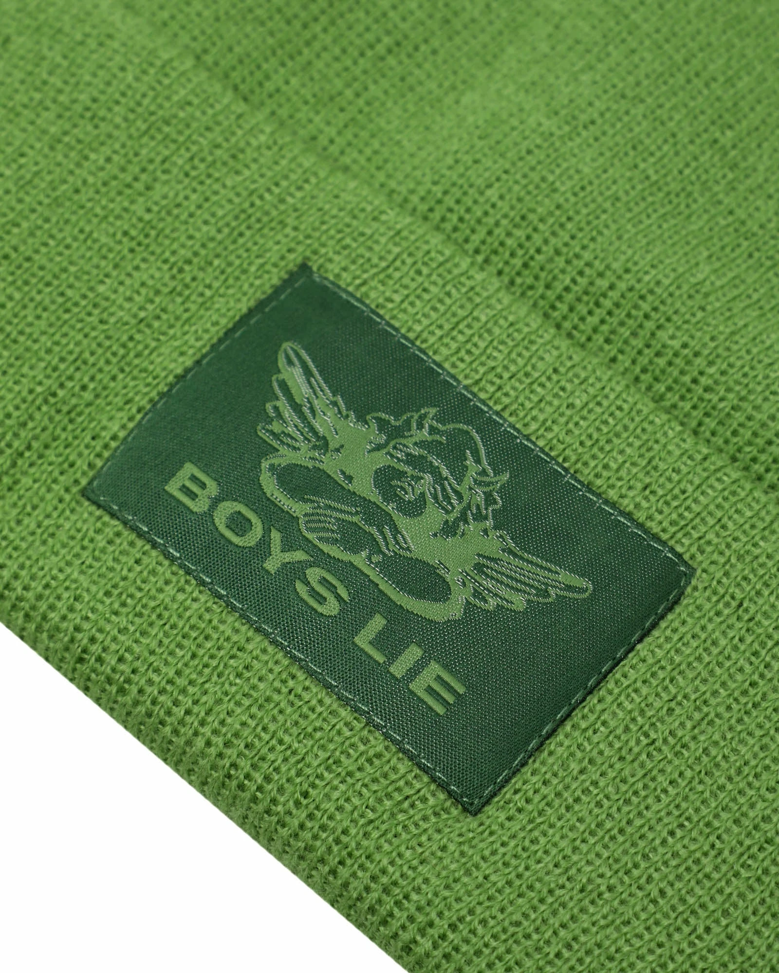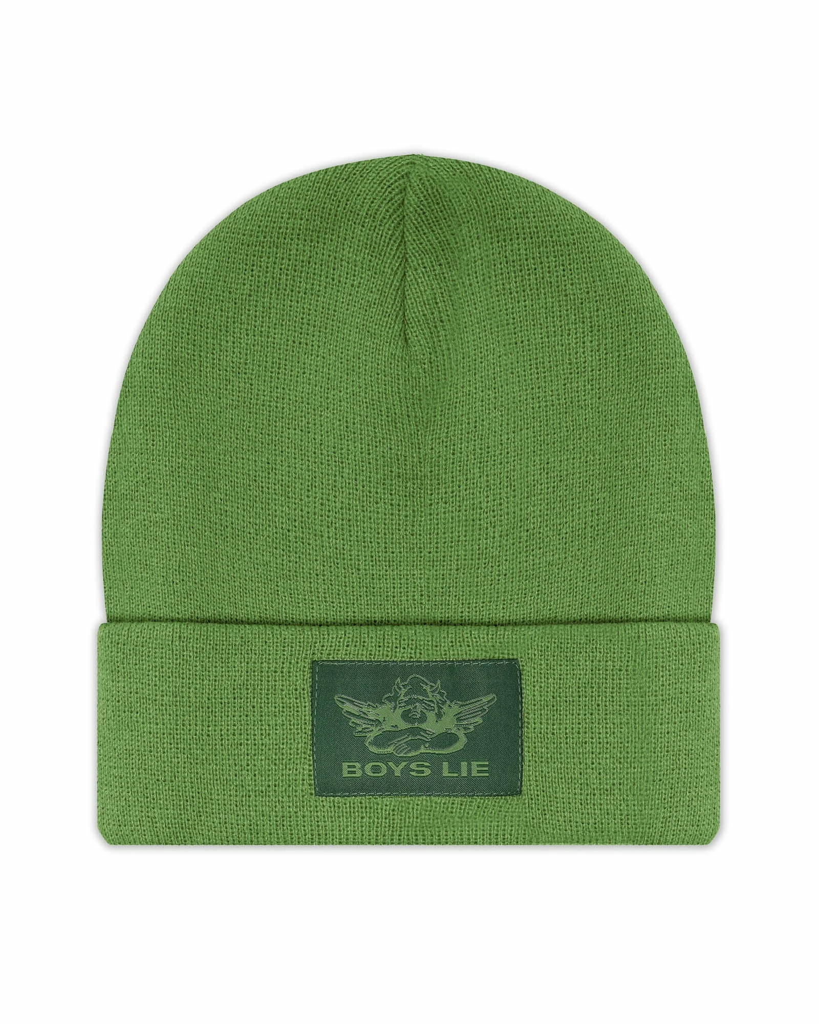 Green beanie with monochromatic green Boys Lie logo patch.