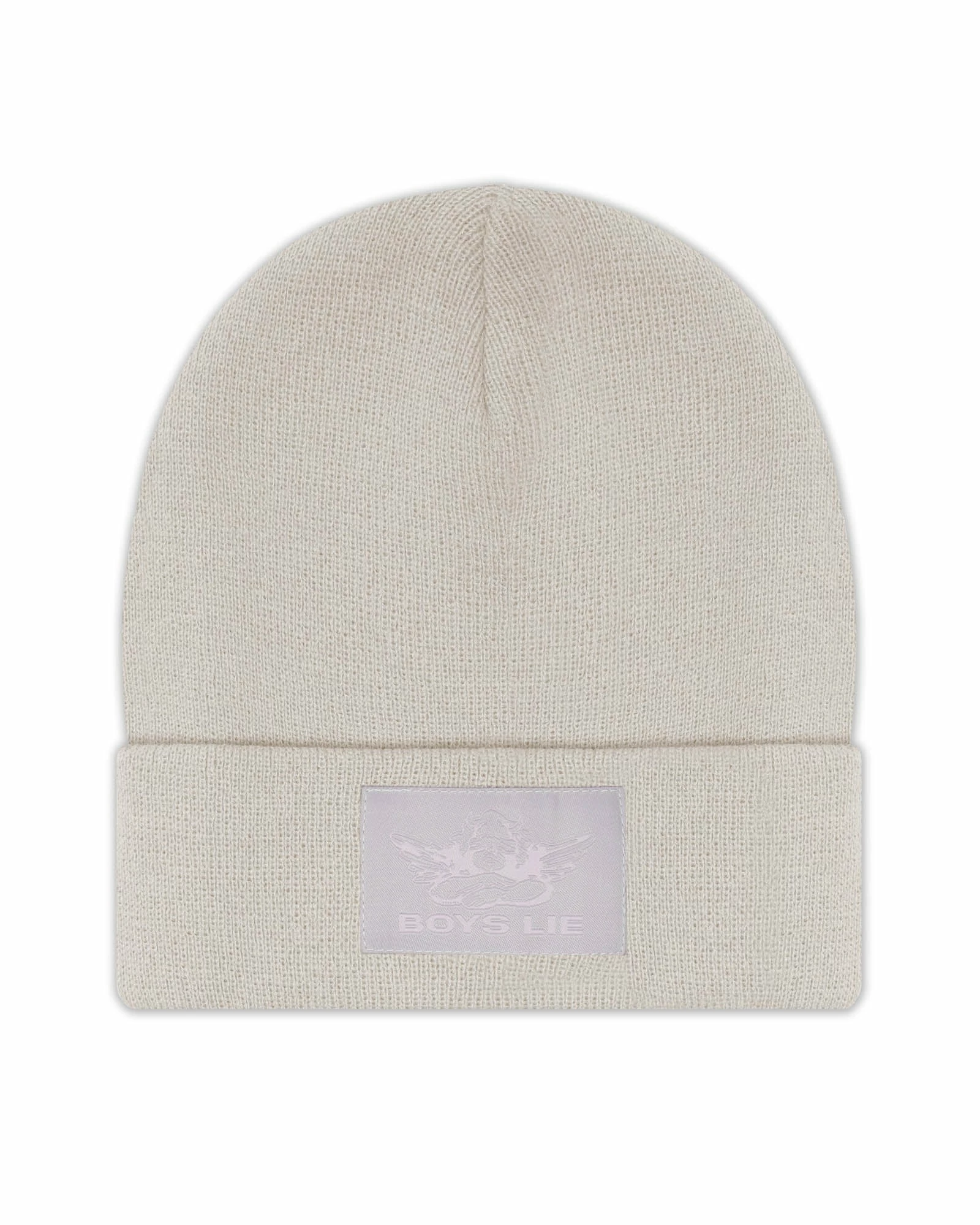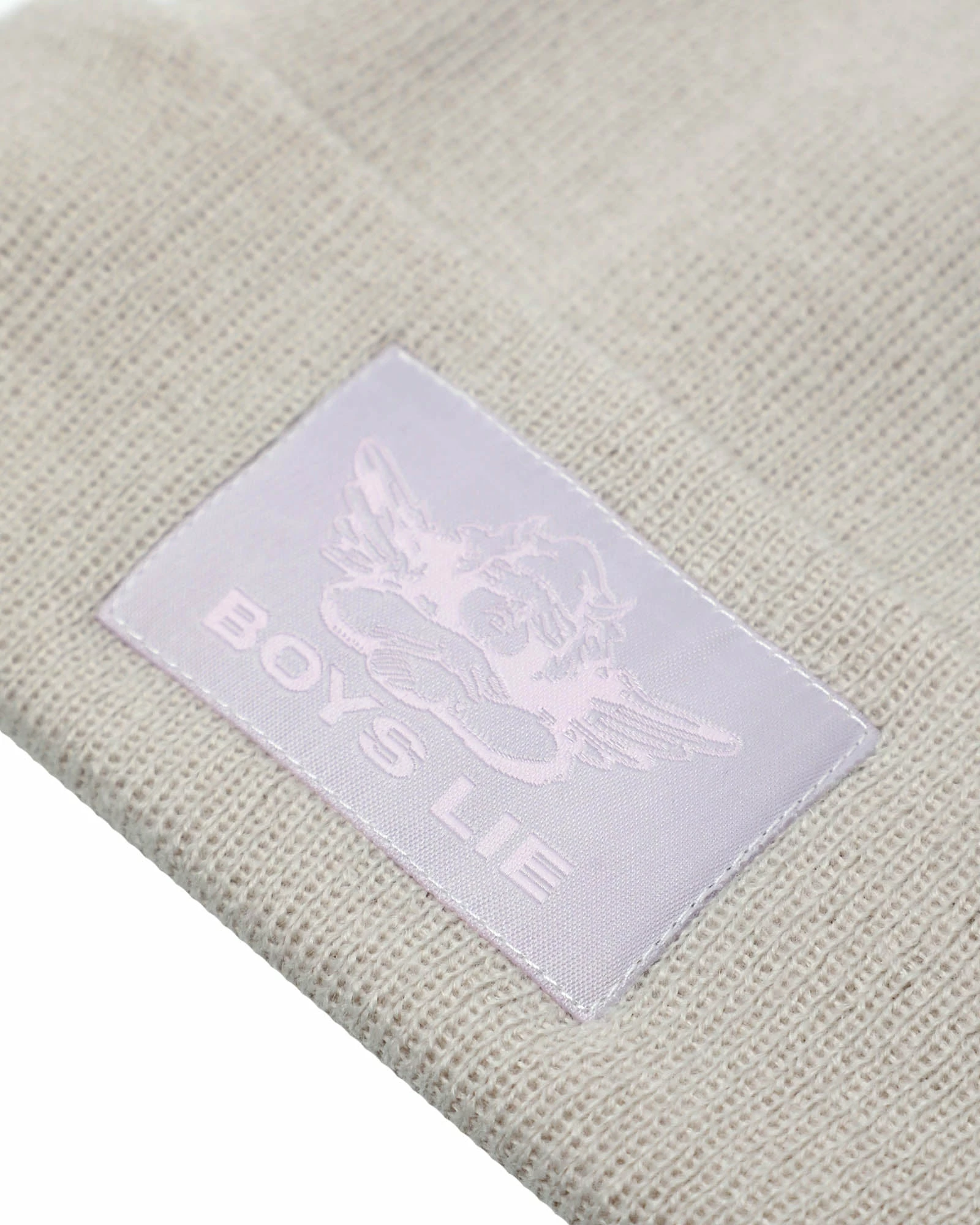 Taupe beanie with mauve Boys Lie logo patch.