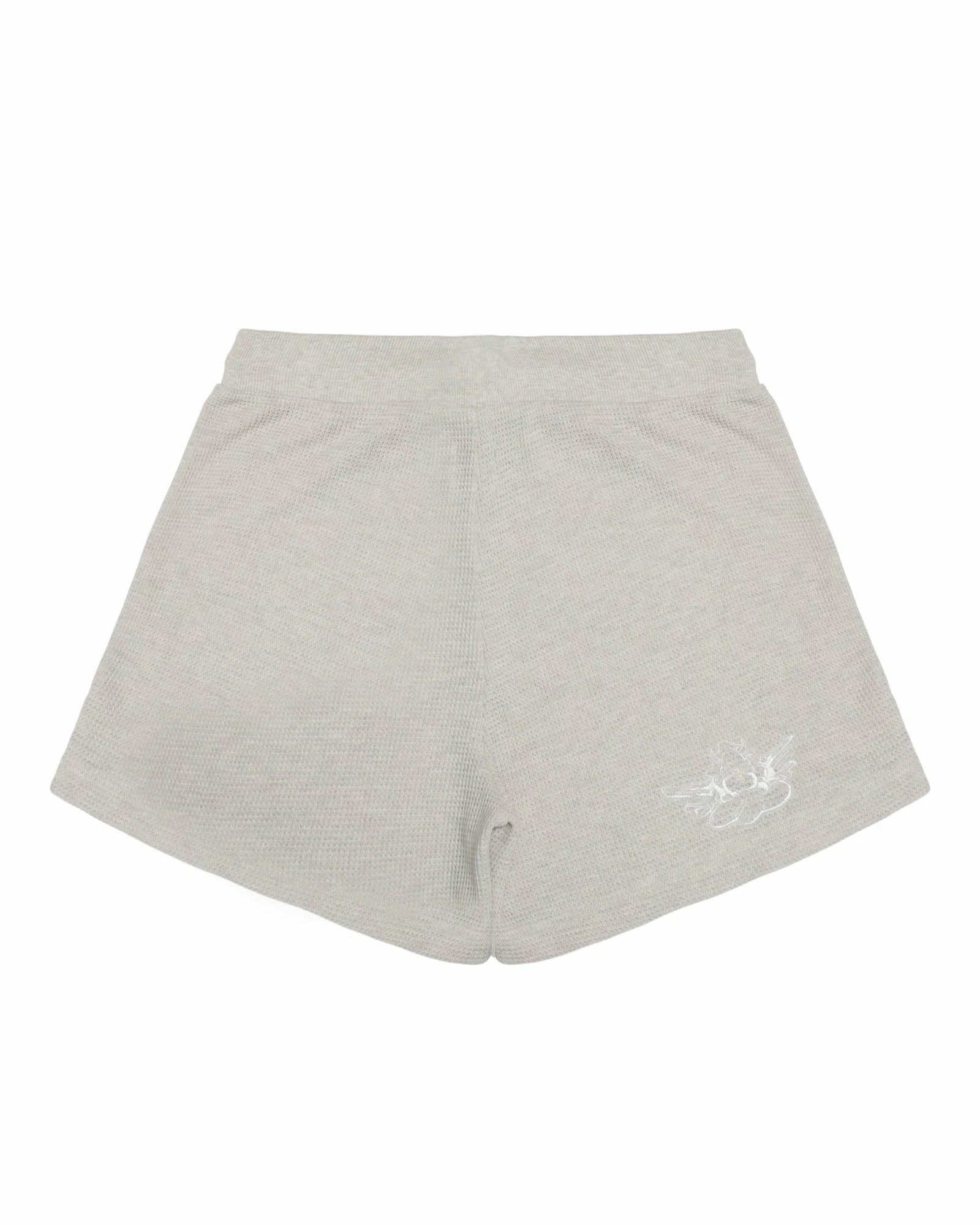 Soft thermal fabric in heather grey. High rise shorts with adjustable drawstring and an oversized fit.