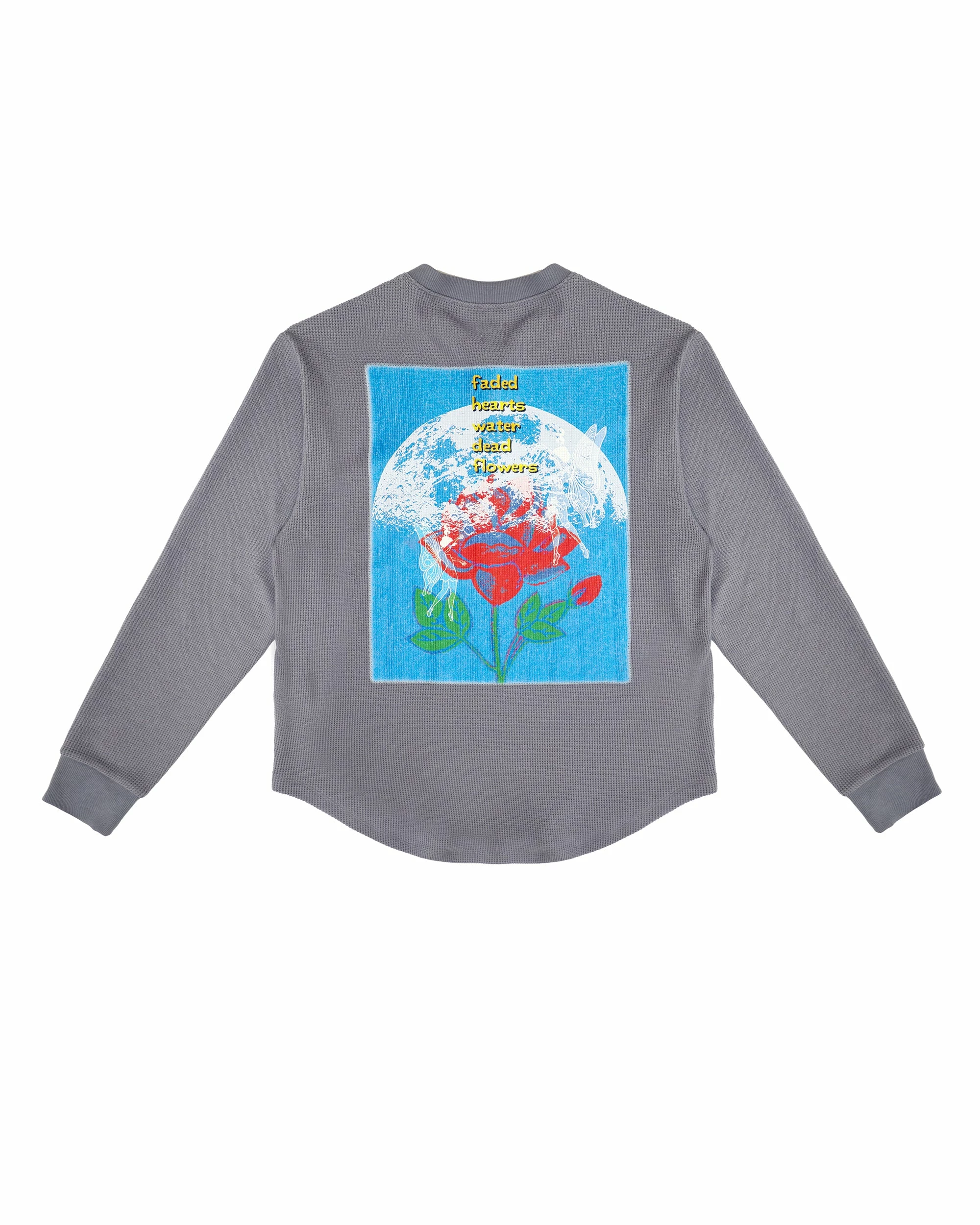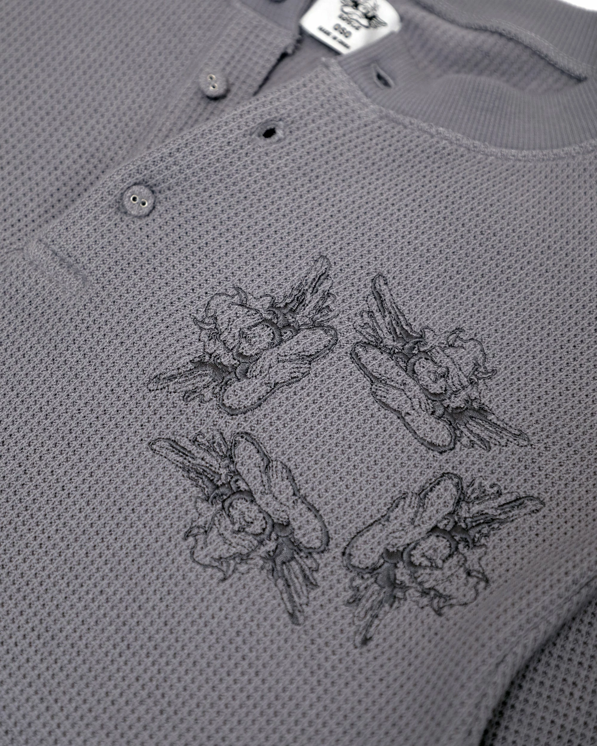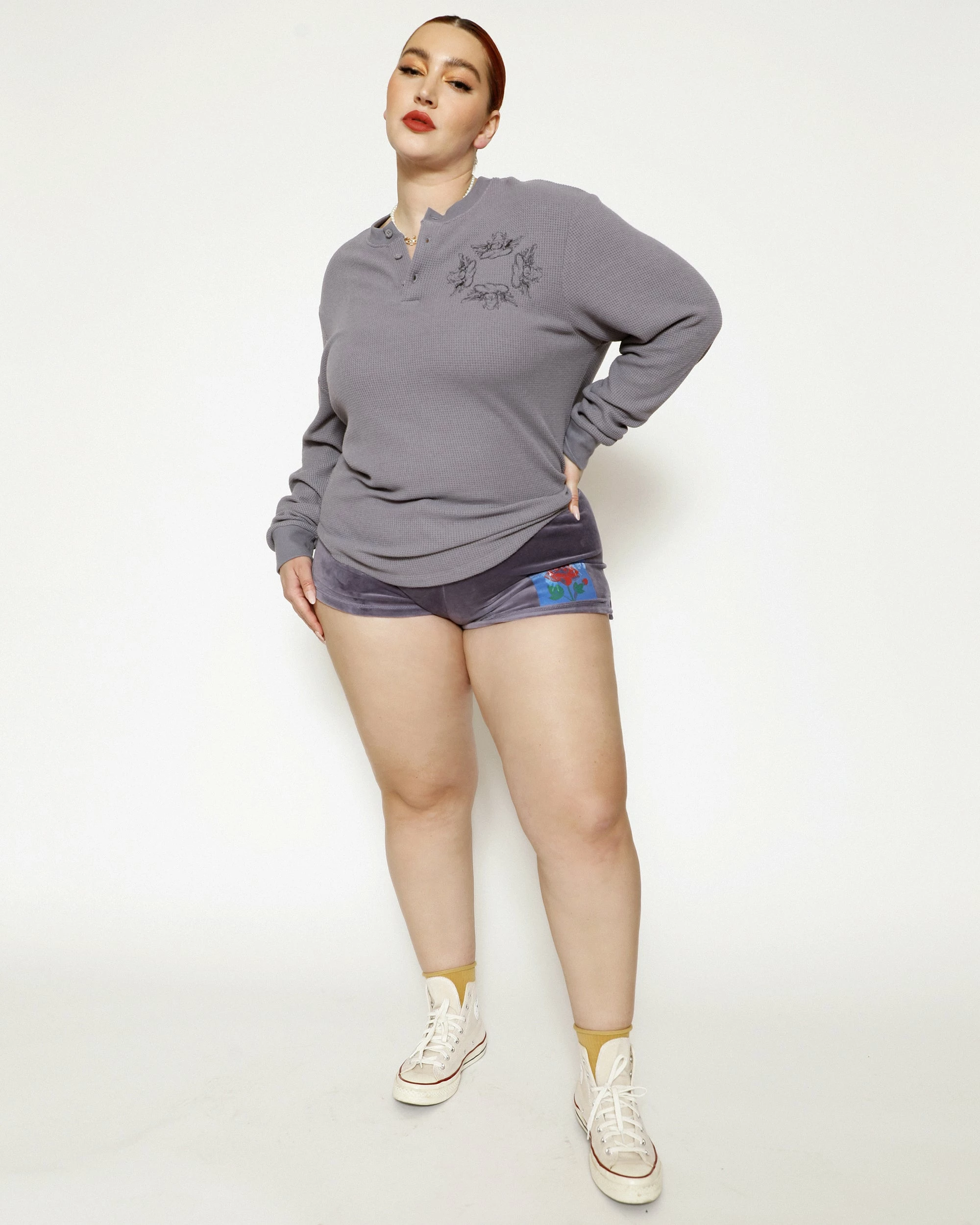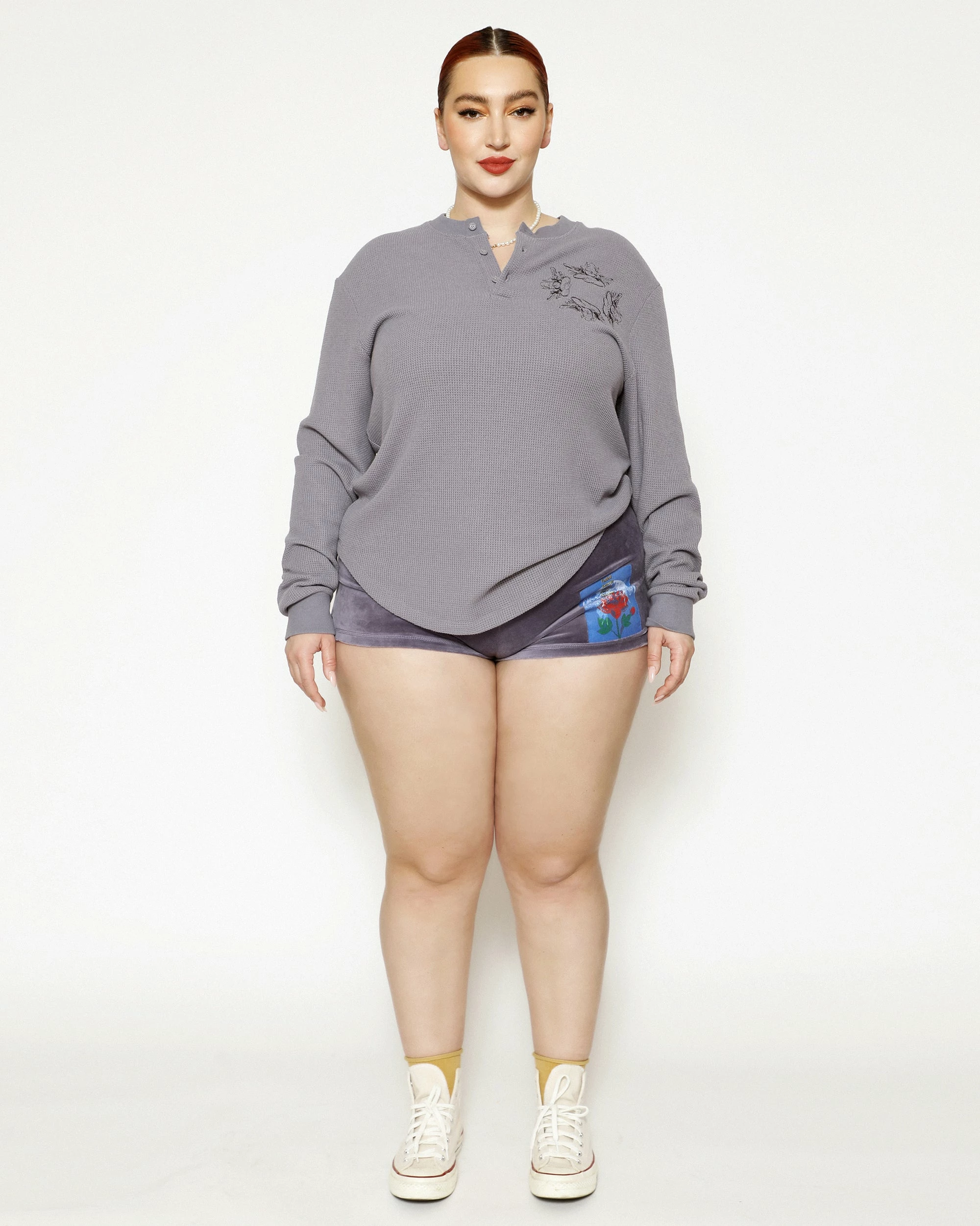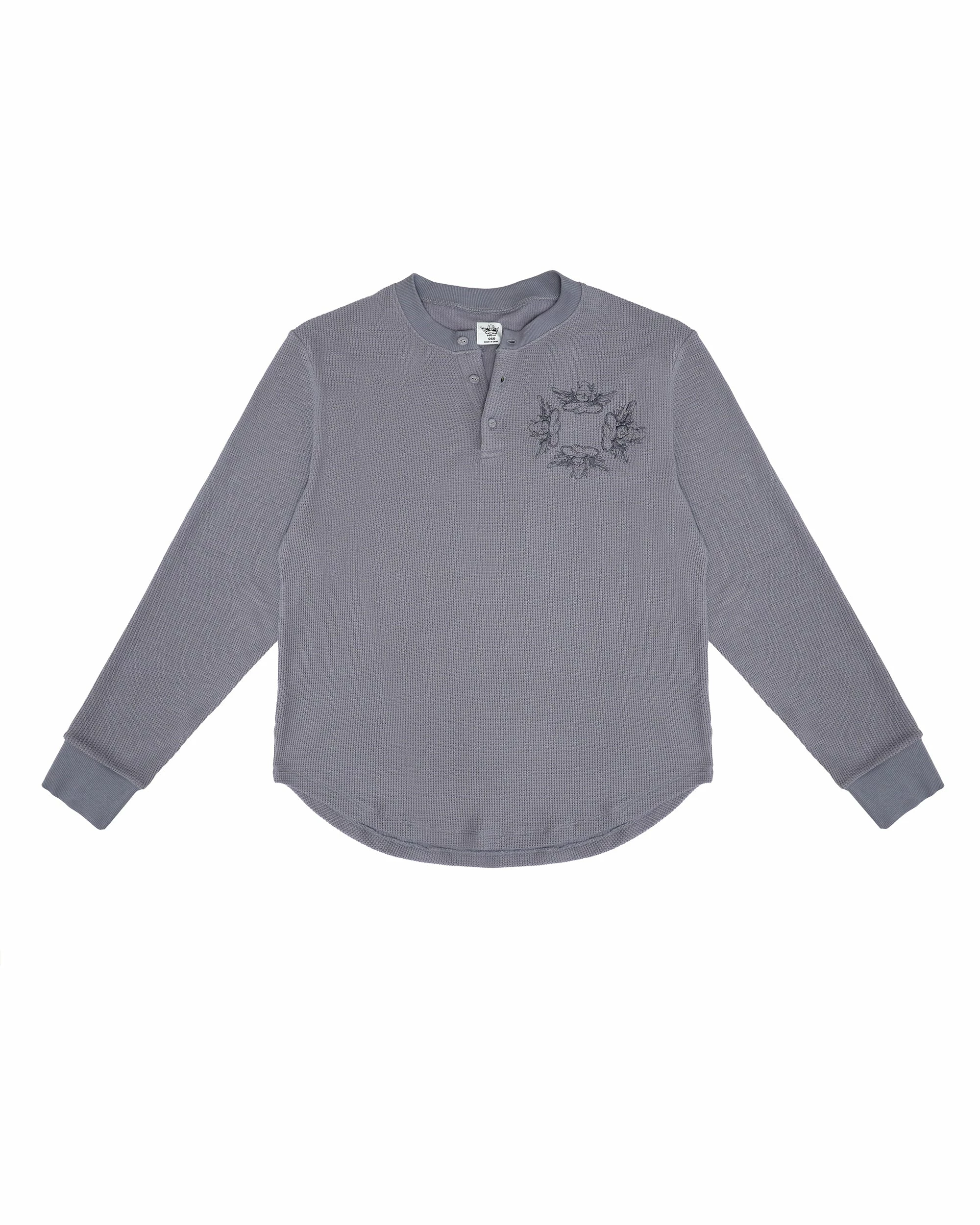 Oversized thermal long sleeve henley in dusty purple. Front button details and a curved hem with embroidered logos.