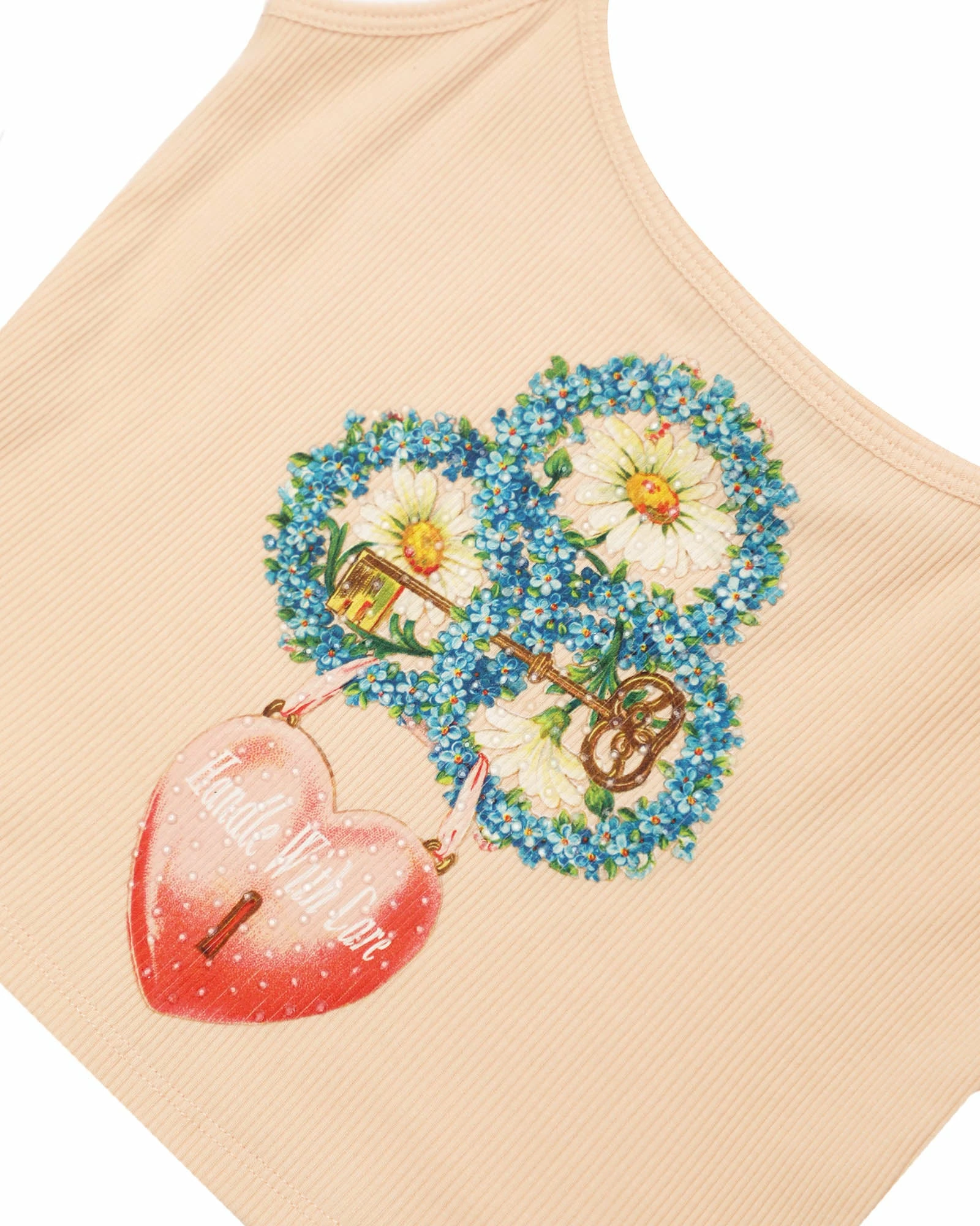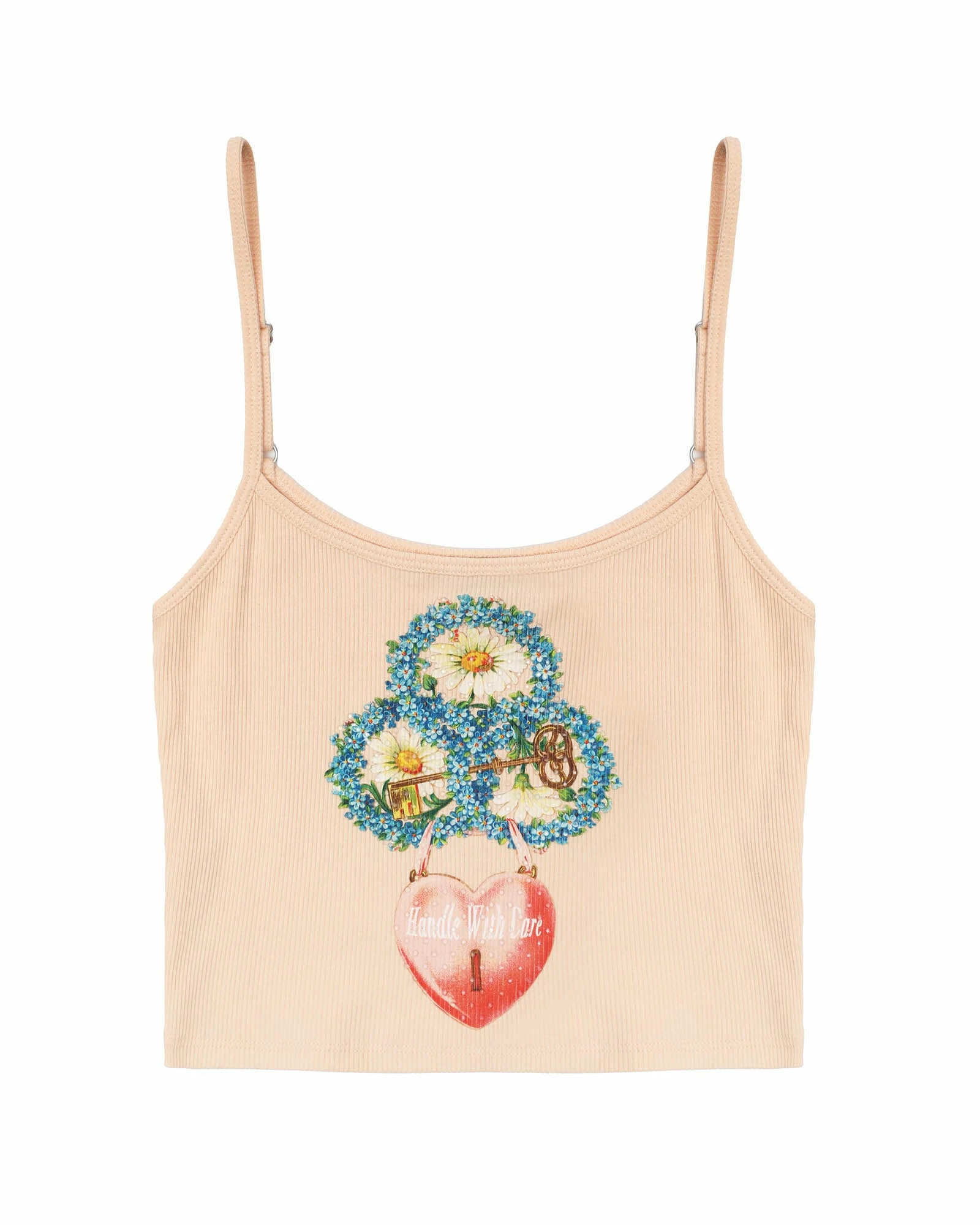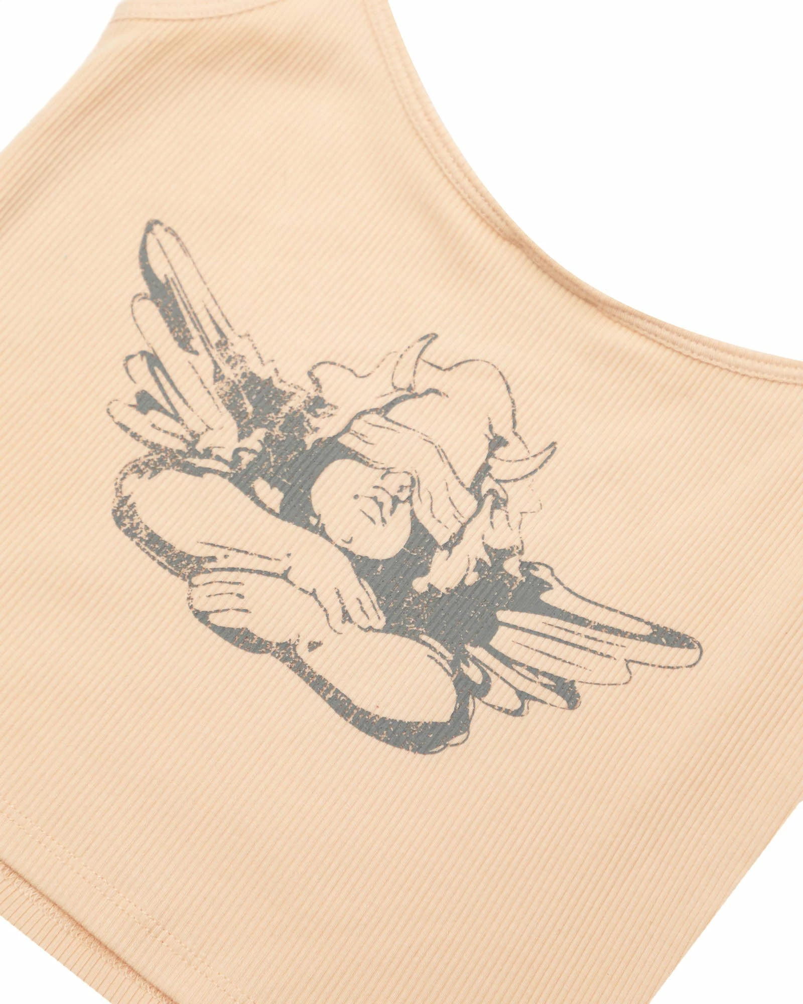 Ribbed crop tank in peach with adjustable straps, distressed logo, and rhinestone embellishments.