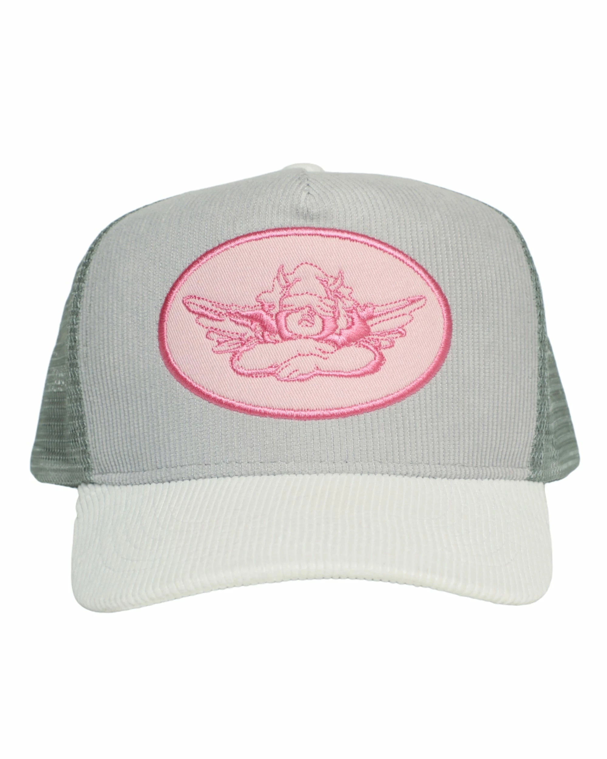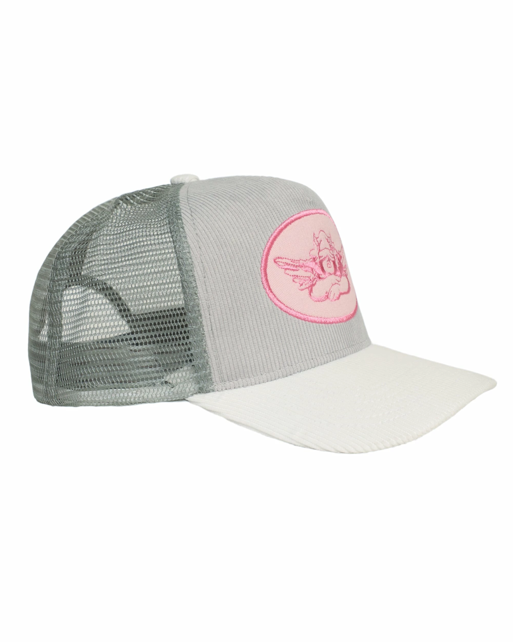 Grey trucker hat with pink patch and grey corduroy. Adjustable snapback.