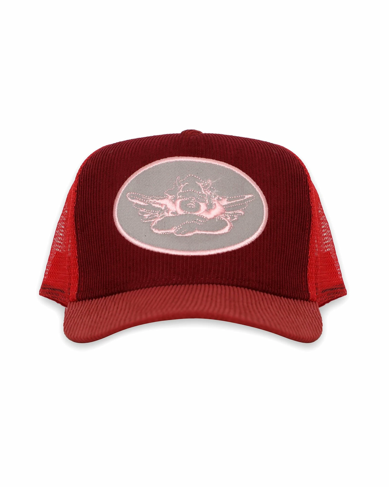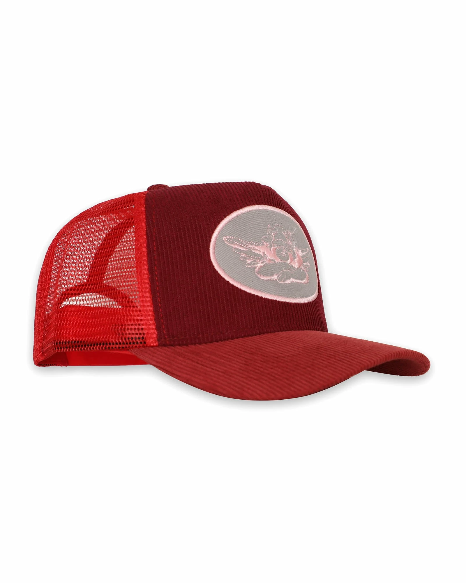 Deep red trucker hat with grey patch and burgundy corduroy. Adjustable snapback.