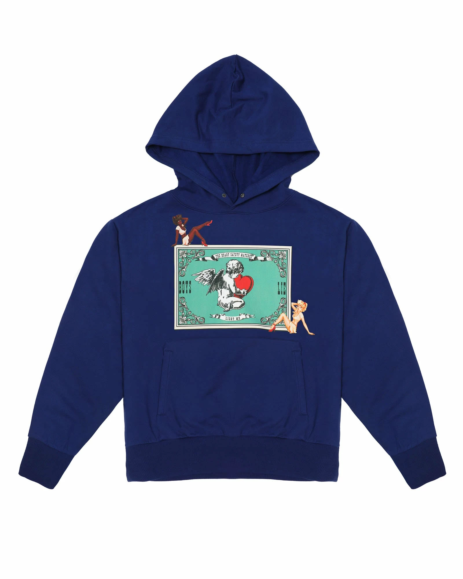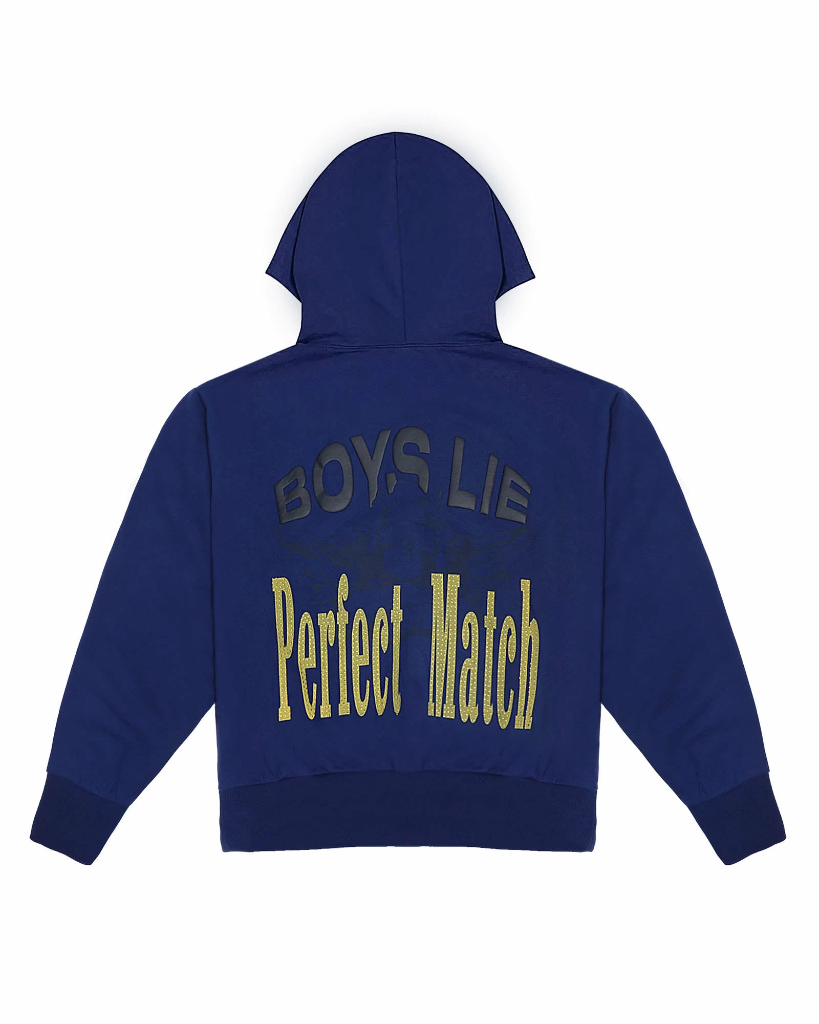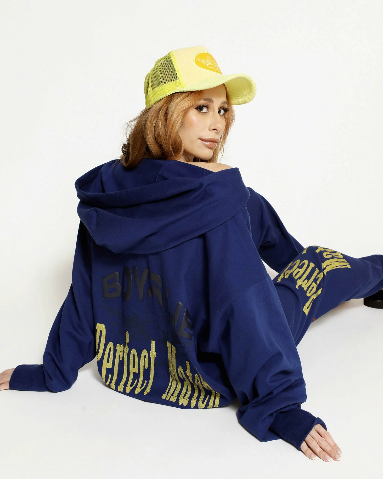 Lightweight fleece hoodie in dark navy blue with rhinestone embellishments and puff print details. Oversized hood with snap closure and front pocket.