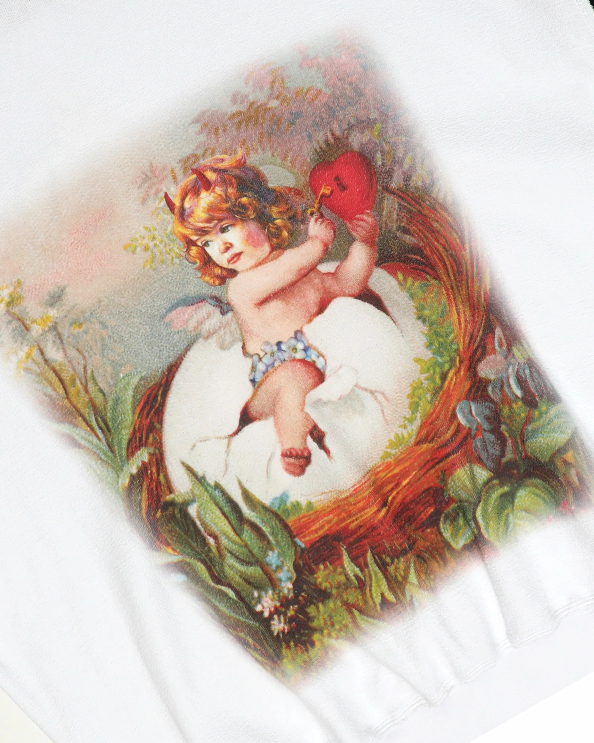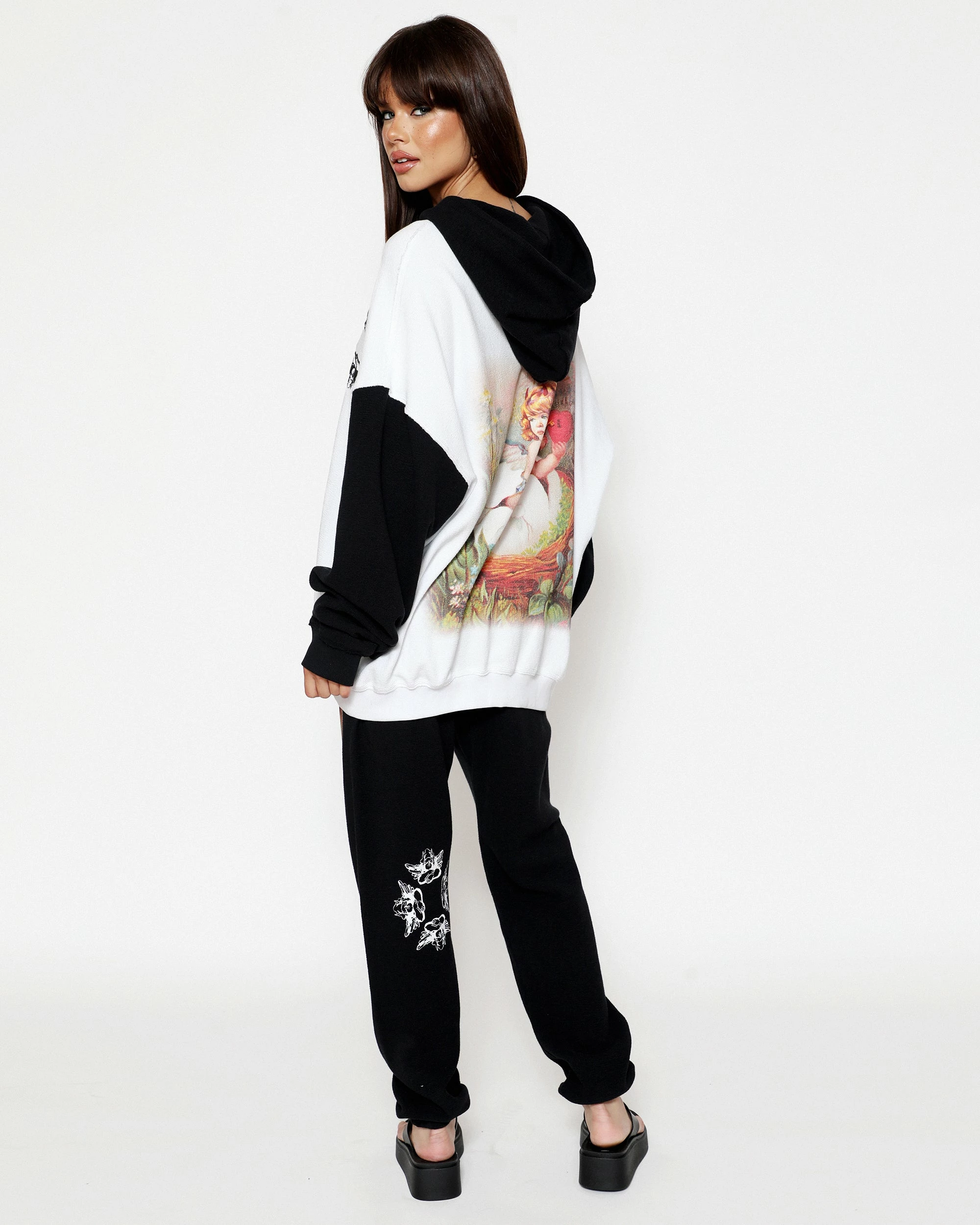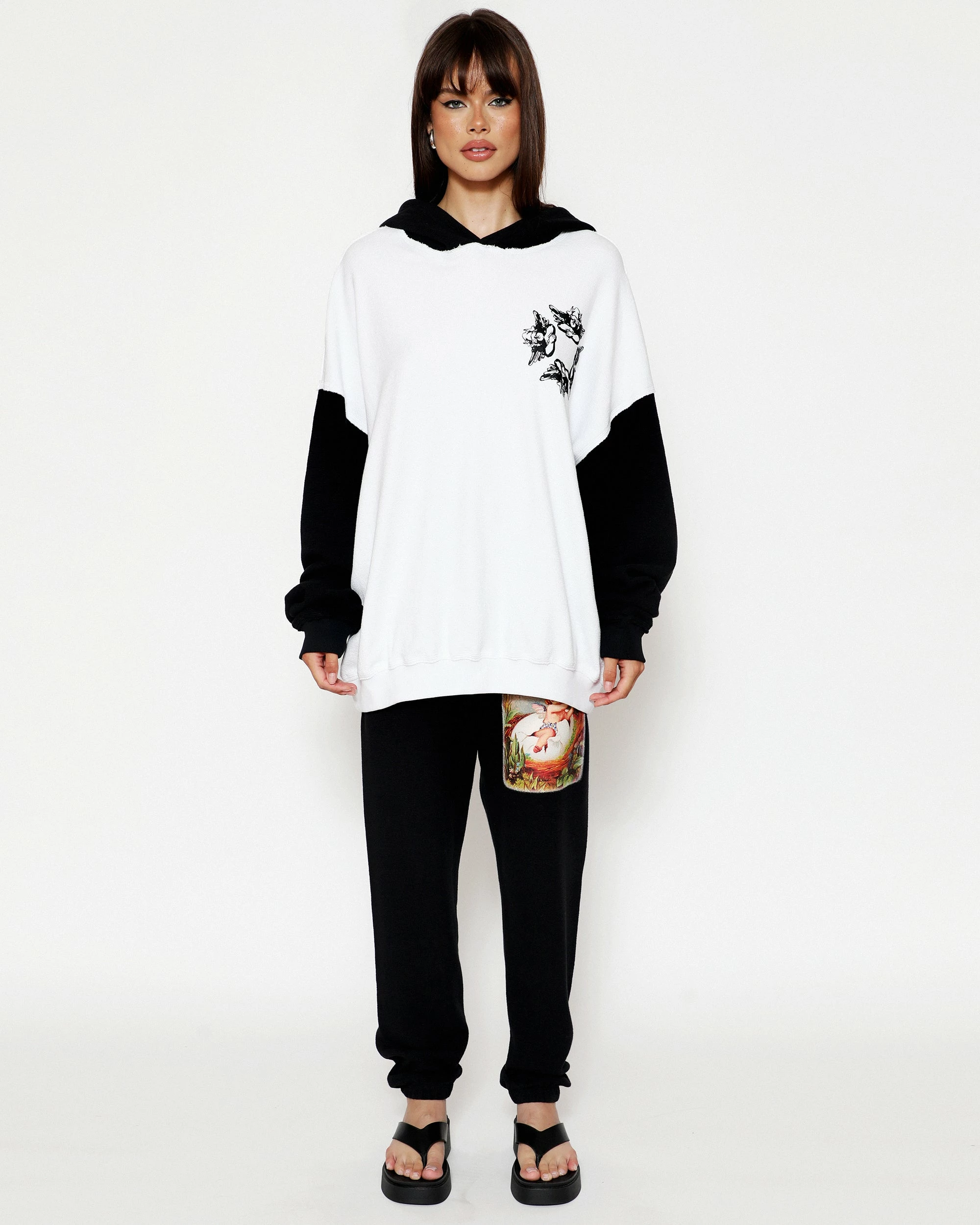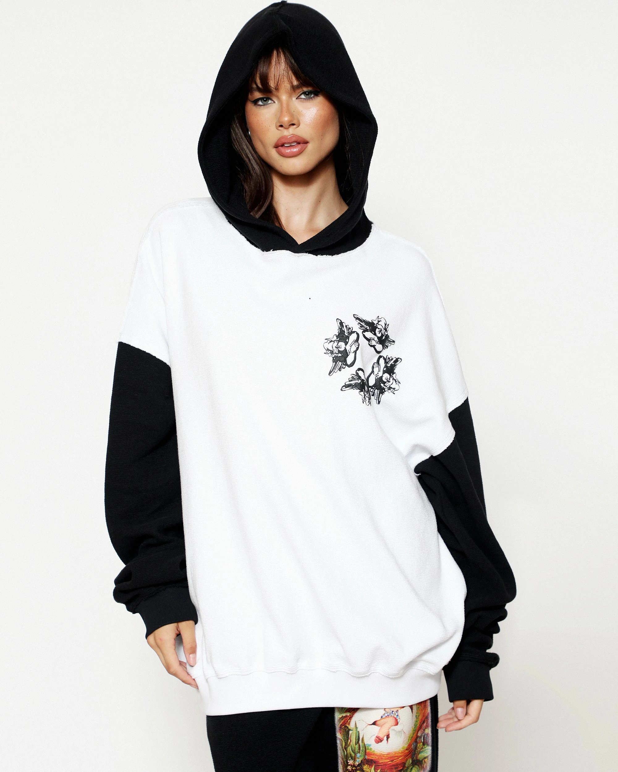 Inside out french terry fabric in white and black. Oversized hoodie featuring a dramatic hood and front and back printed graphics.
