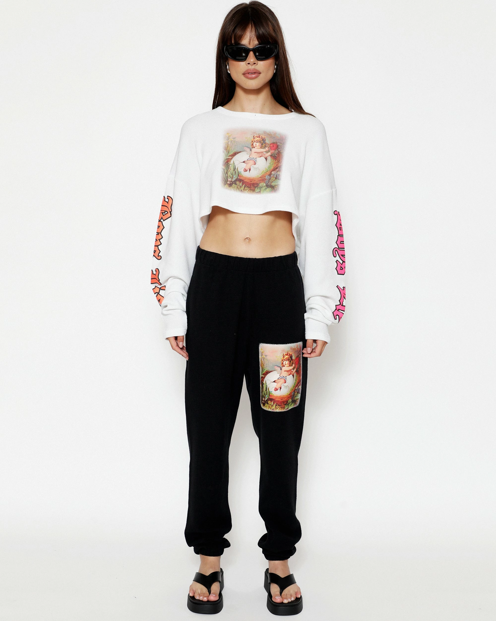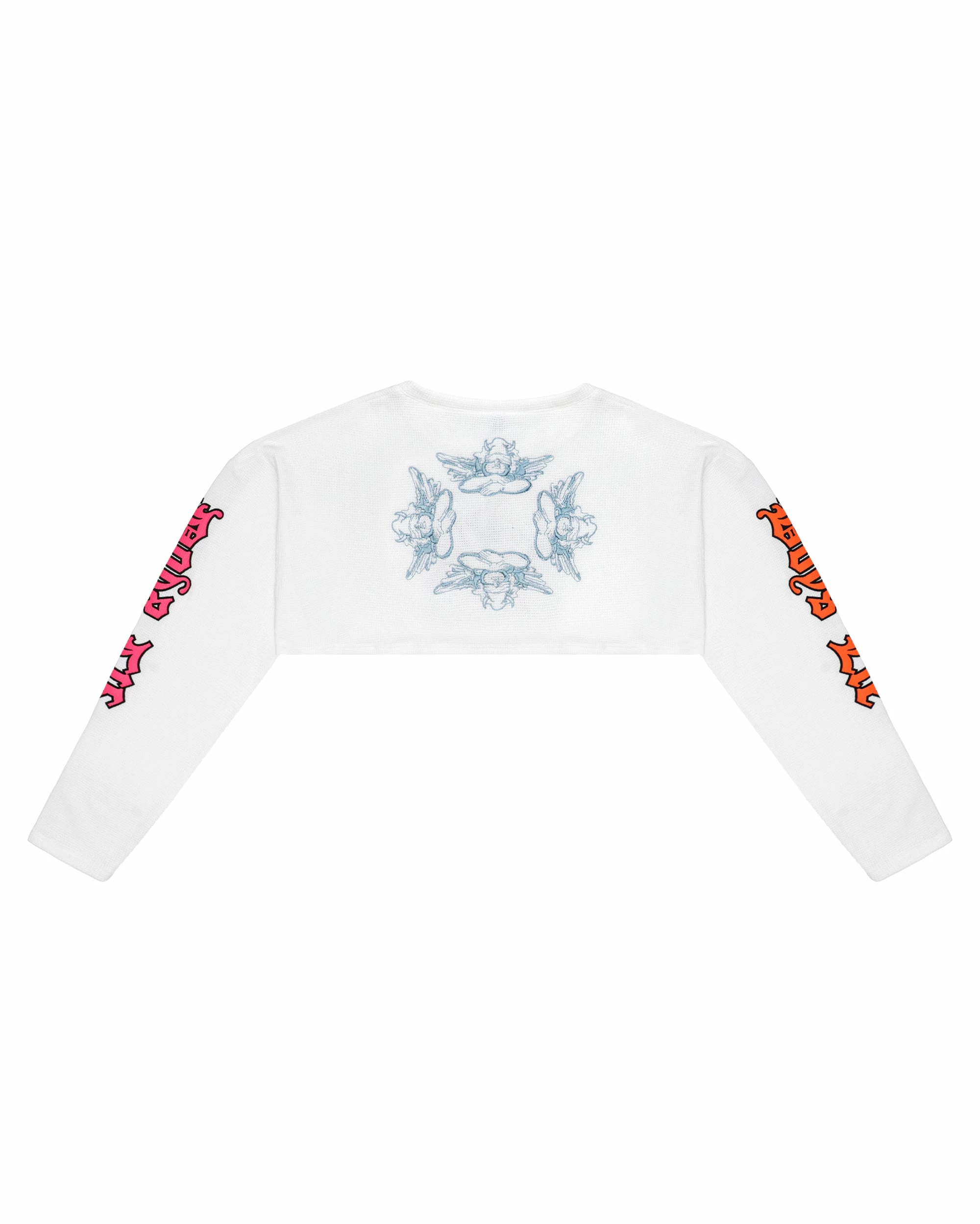 Oversized cropped longsleeve in white. Printed front graphic and sleeves with embroidered back logo.