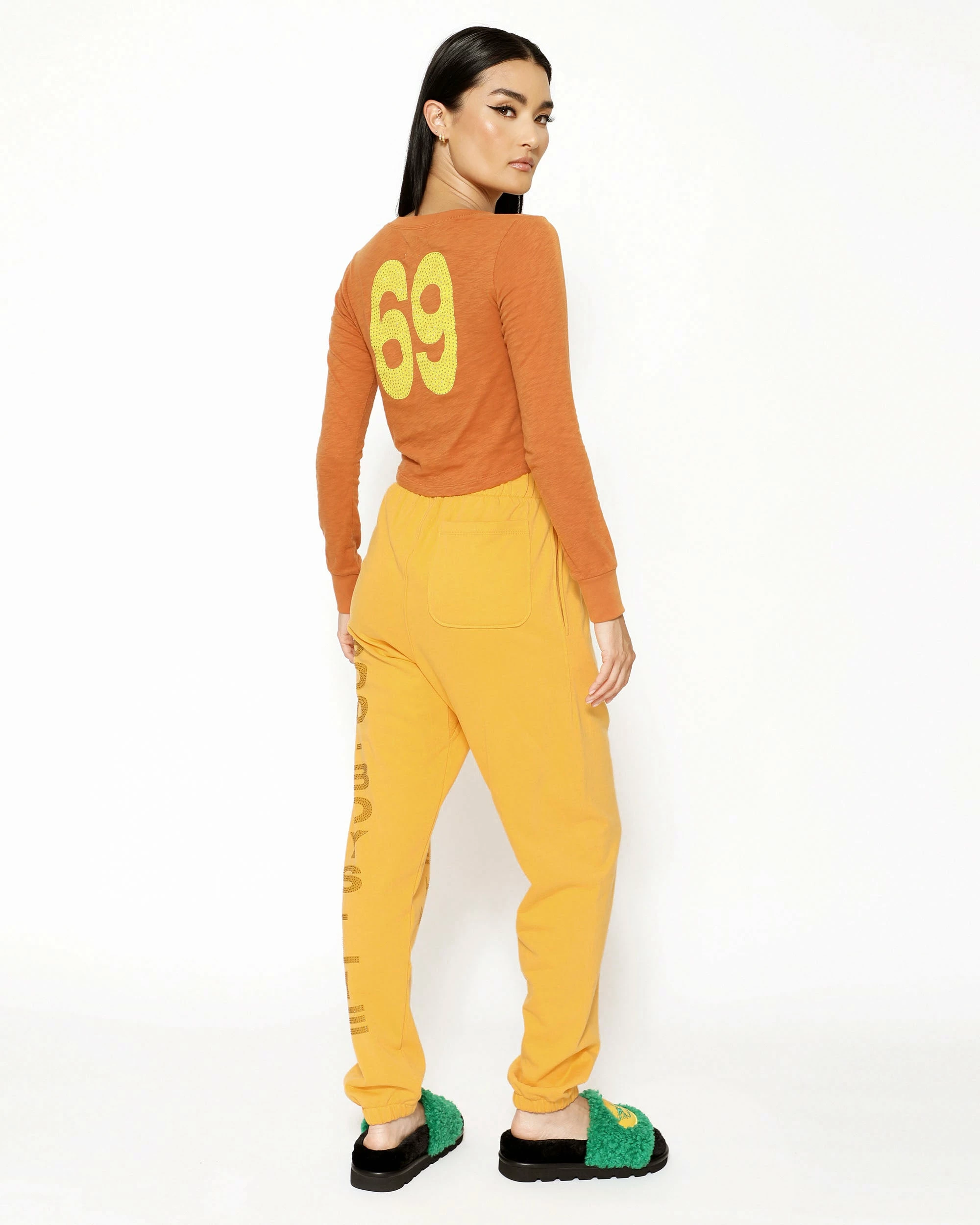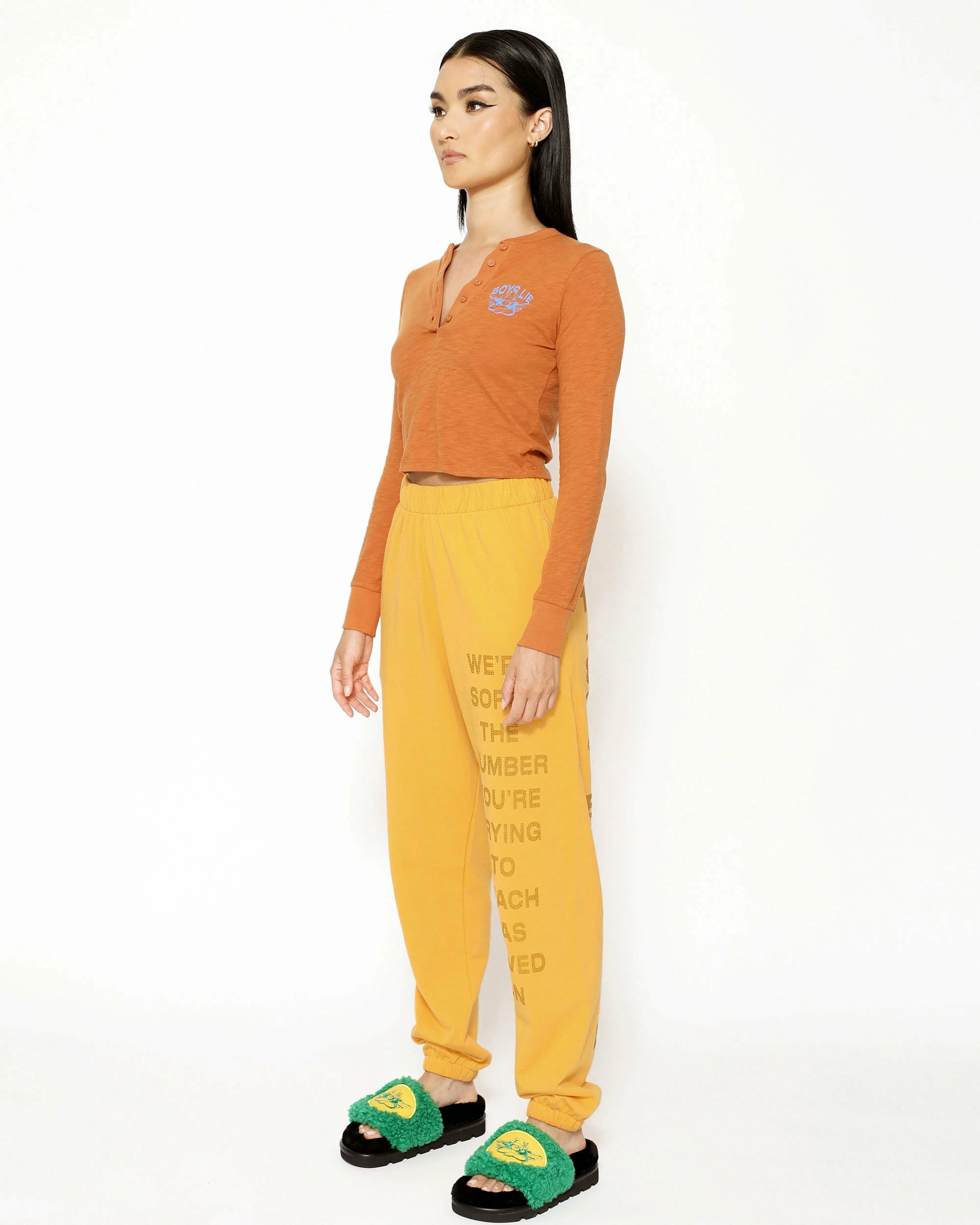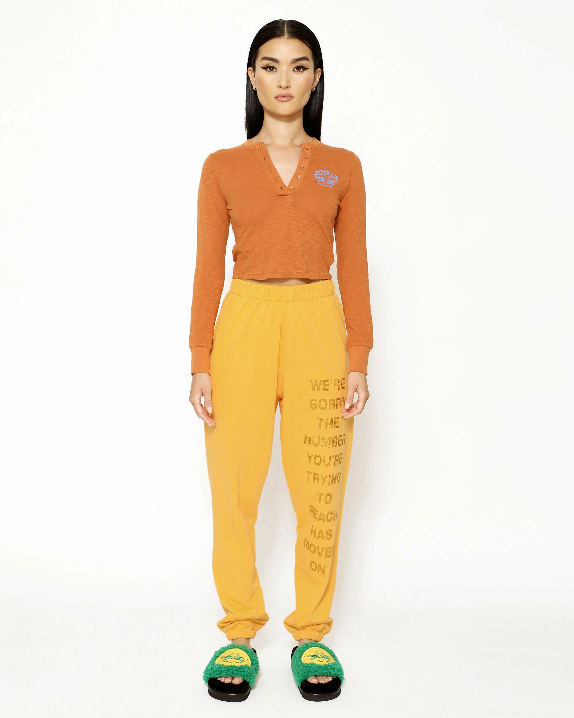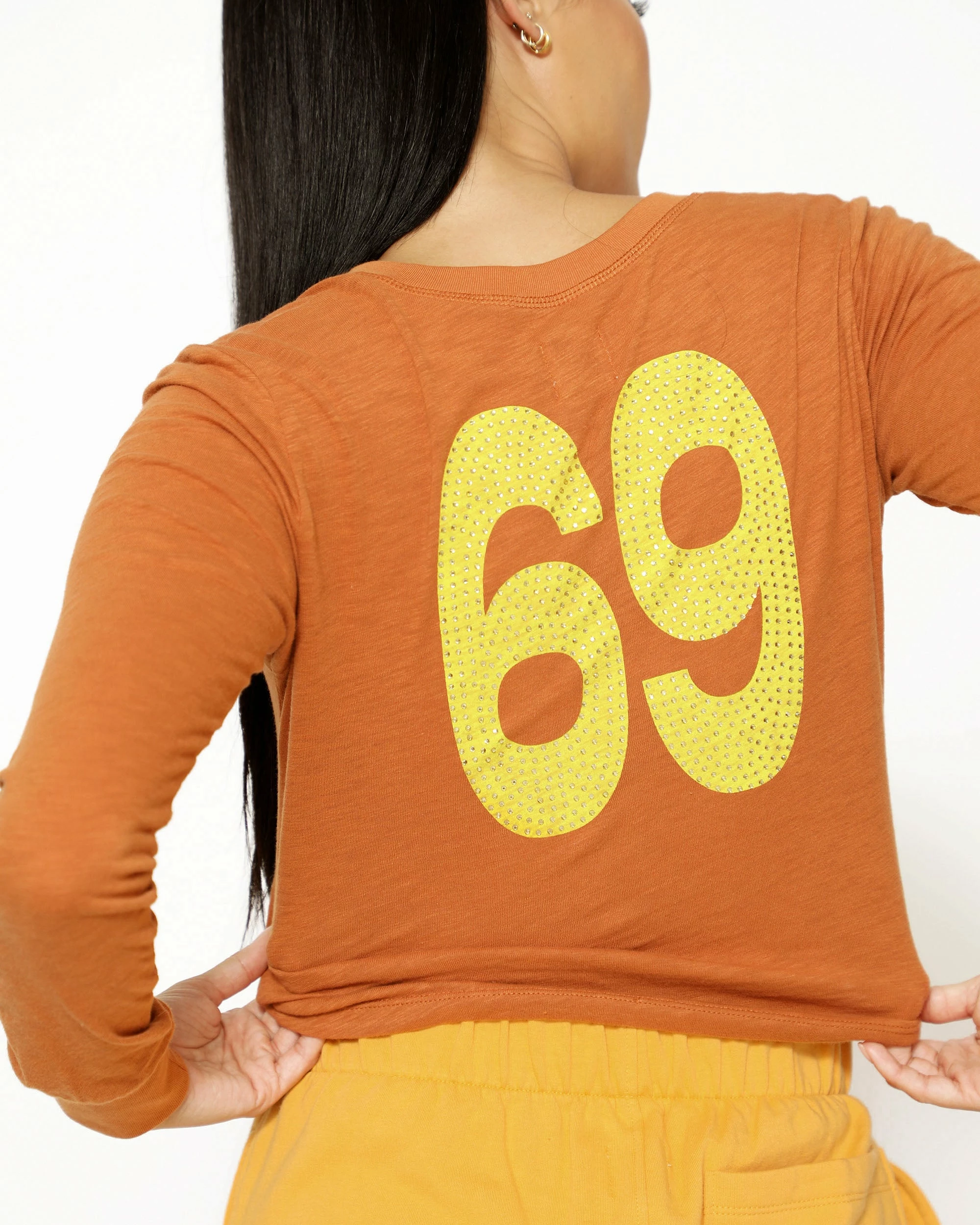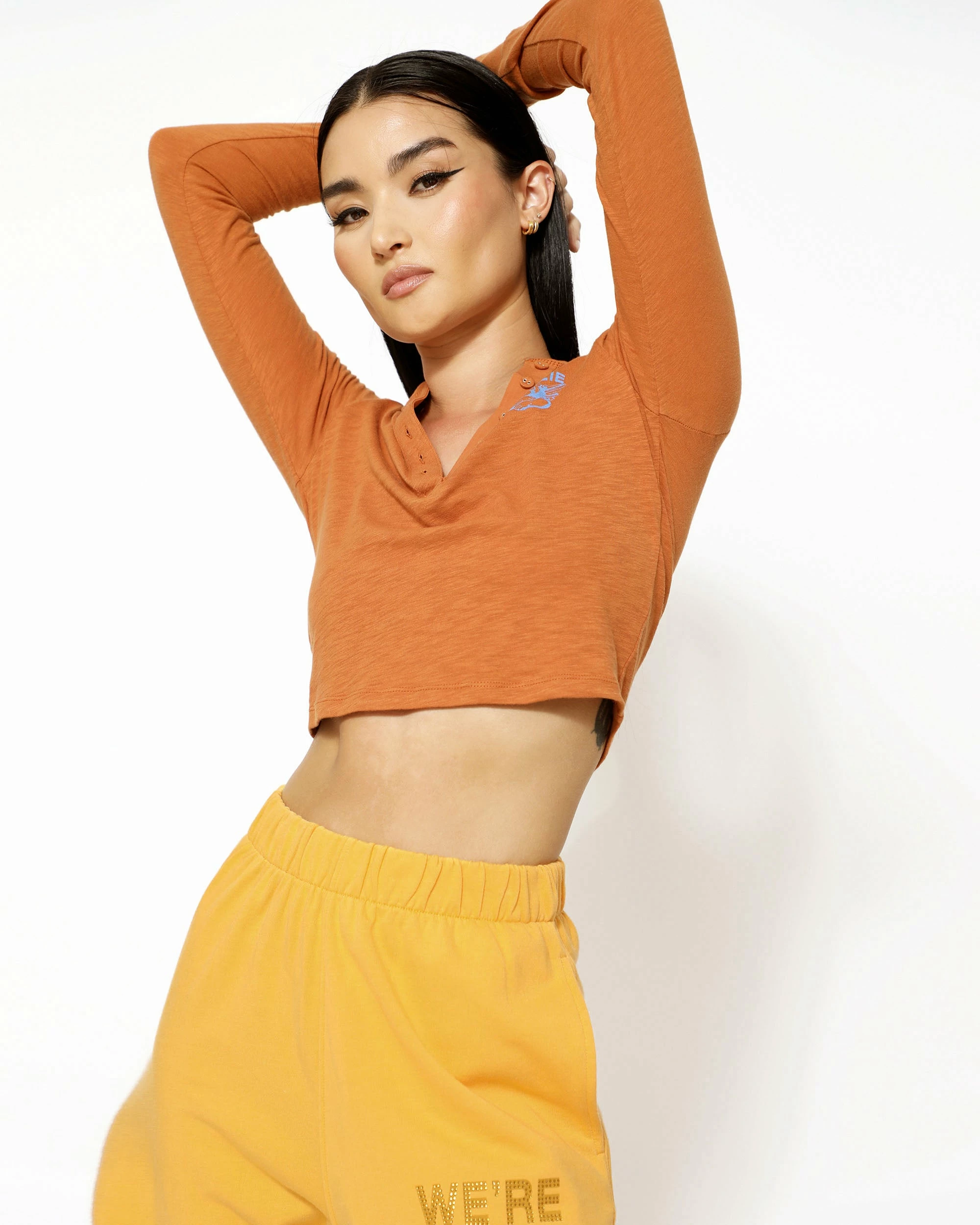 Burnt orange cropped henley long sleeve with button details and rhinestone embellishments.