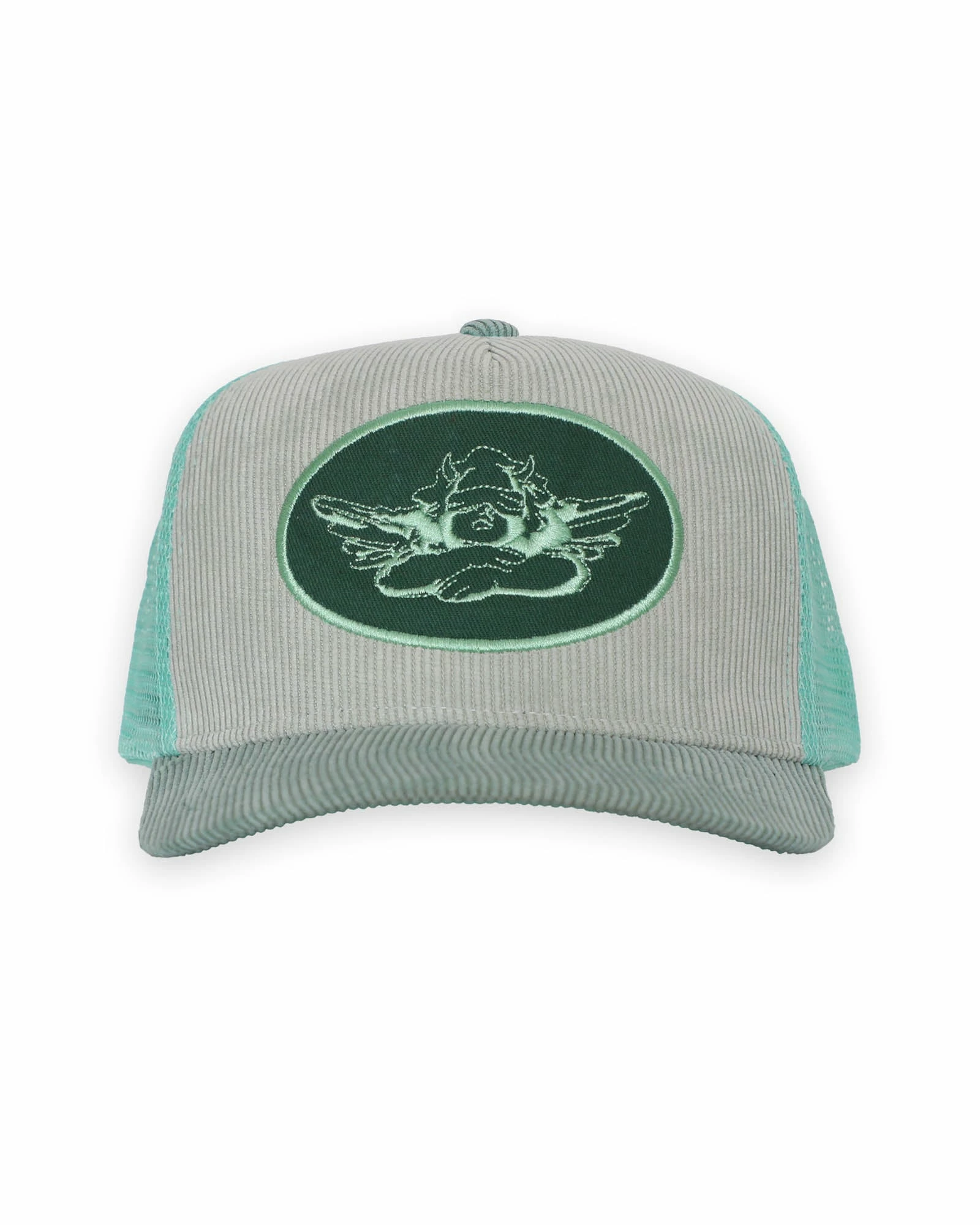 Aquamarine trucker hat with green patch and pale blue/grey corduroy. Adjustable snapback.