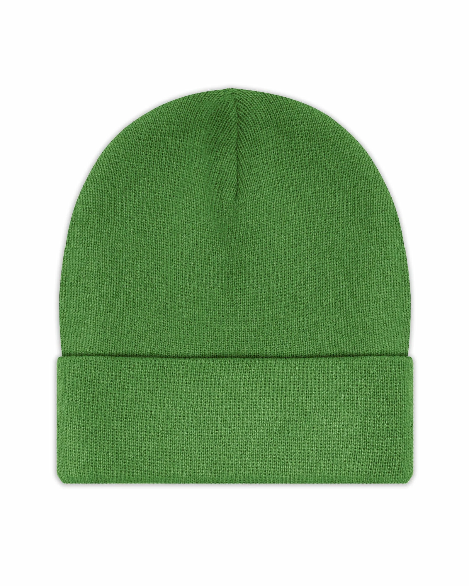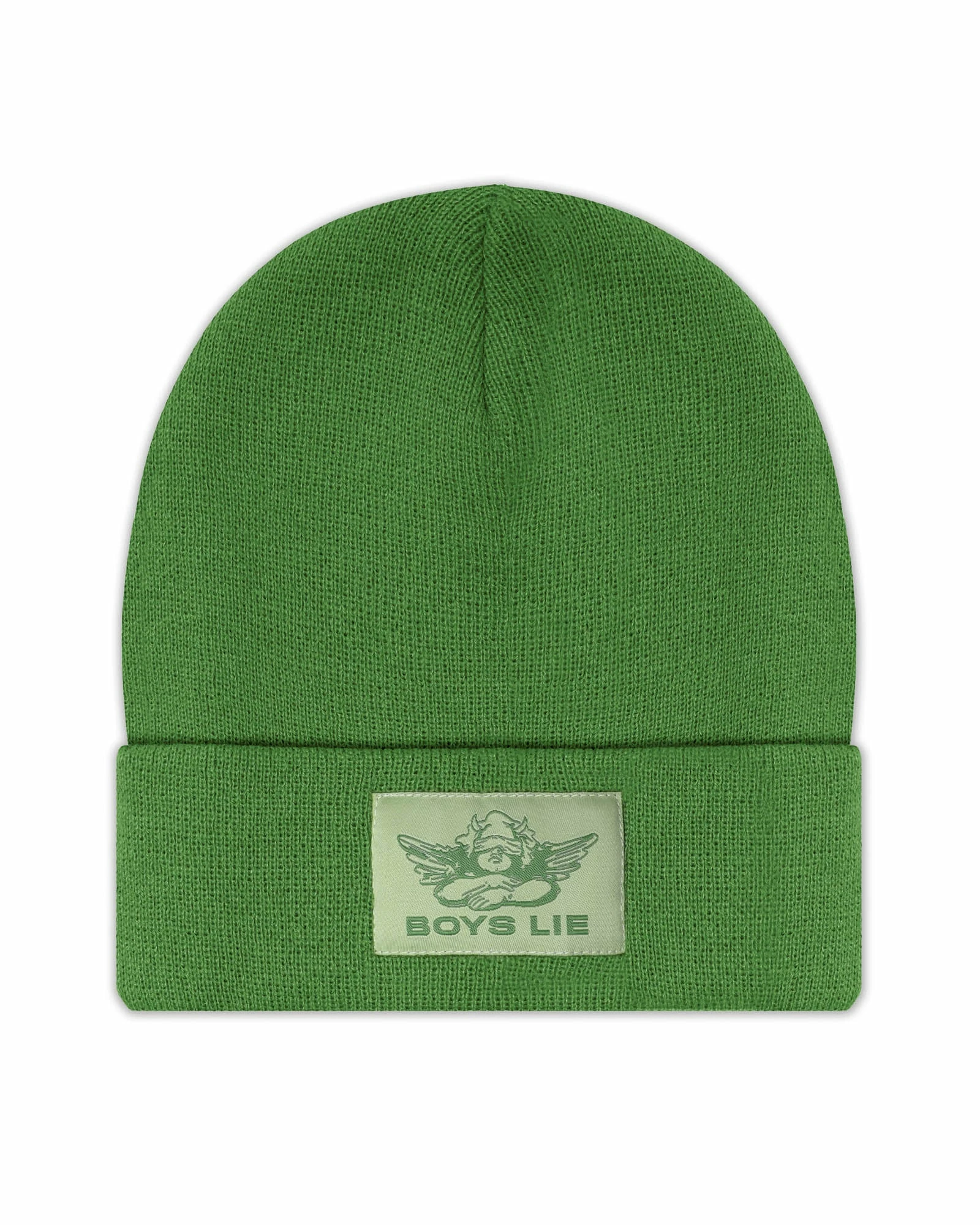 Olive green beanie with monochromatic olive Boys Lie logo patch.