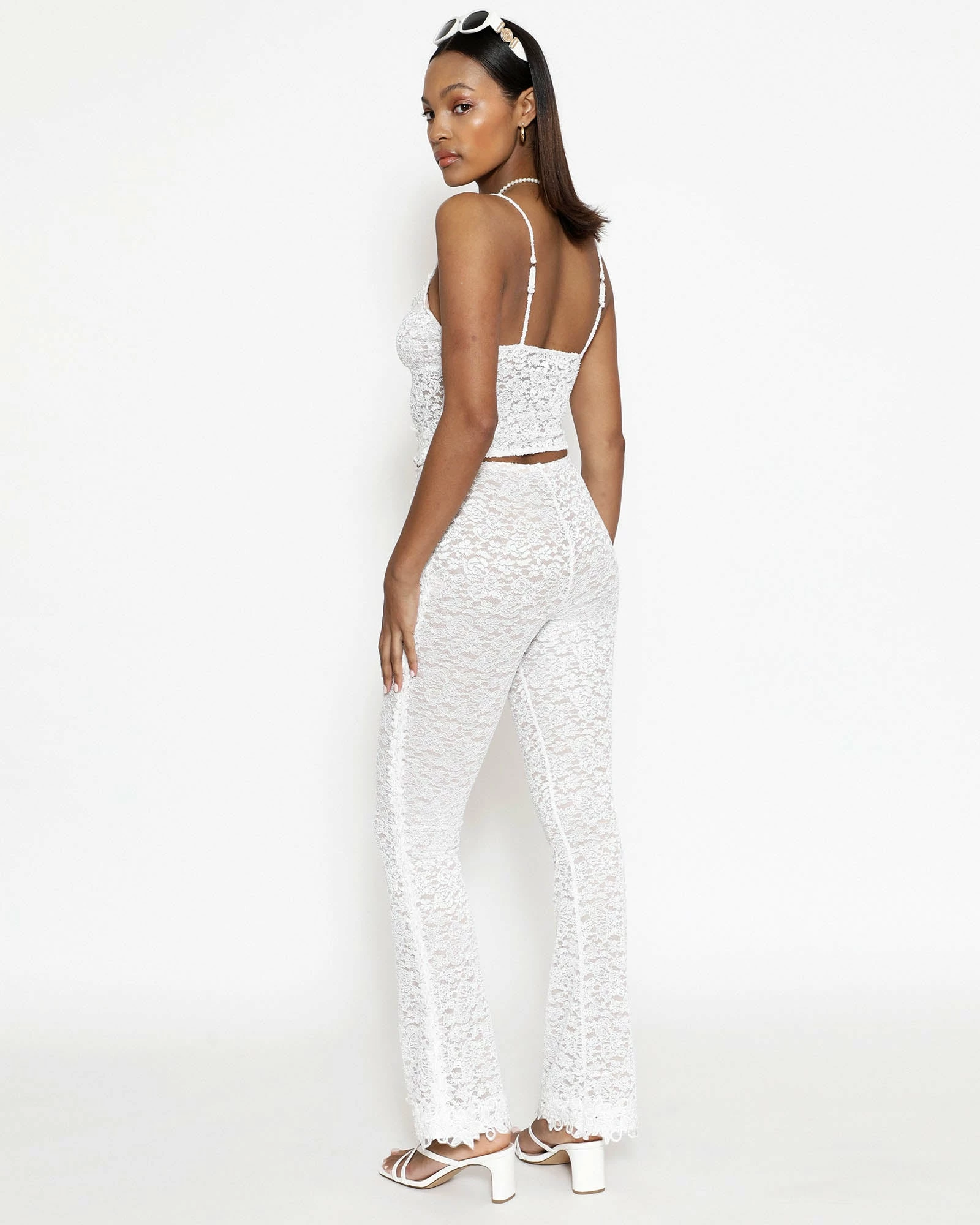 Sheer lace white crop top with low neckline, floral beaded trim, small side splits, and adjustable straps. Featured nude lining at bust.