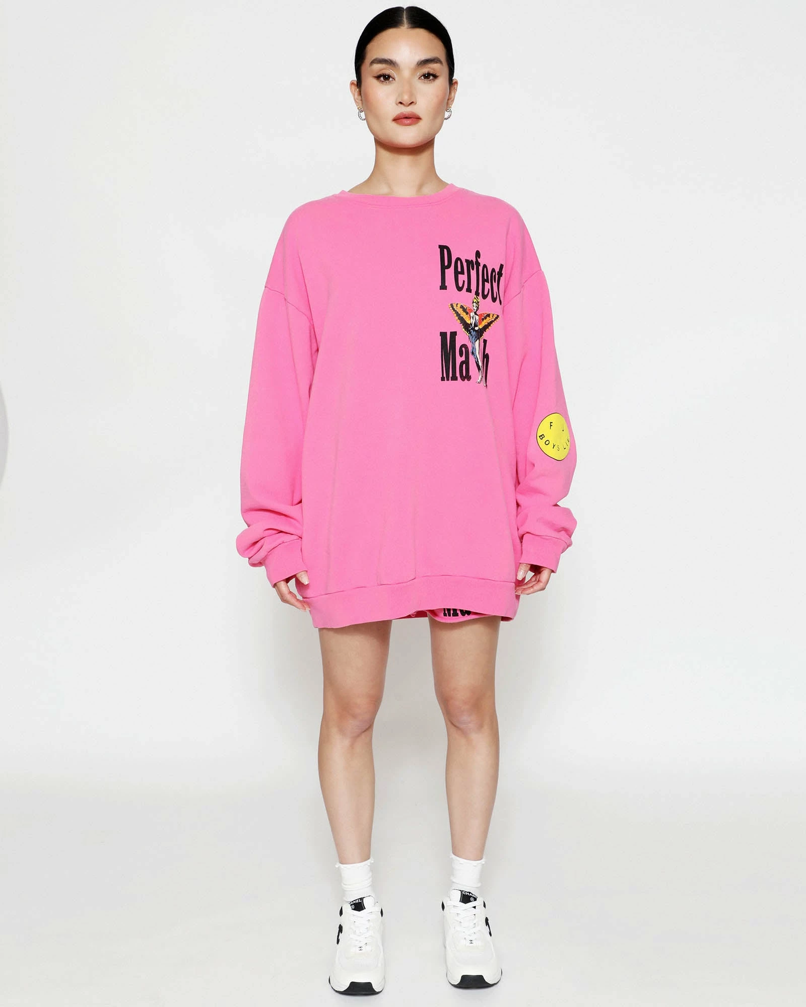 Heavyweight french terry fabric in hot pink. Oversized crewneck with puff print detail.