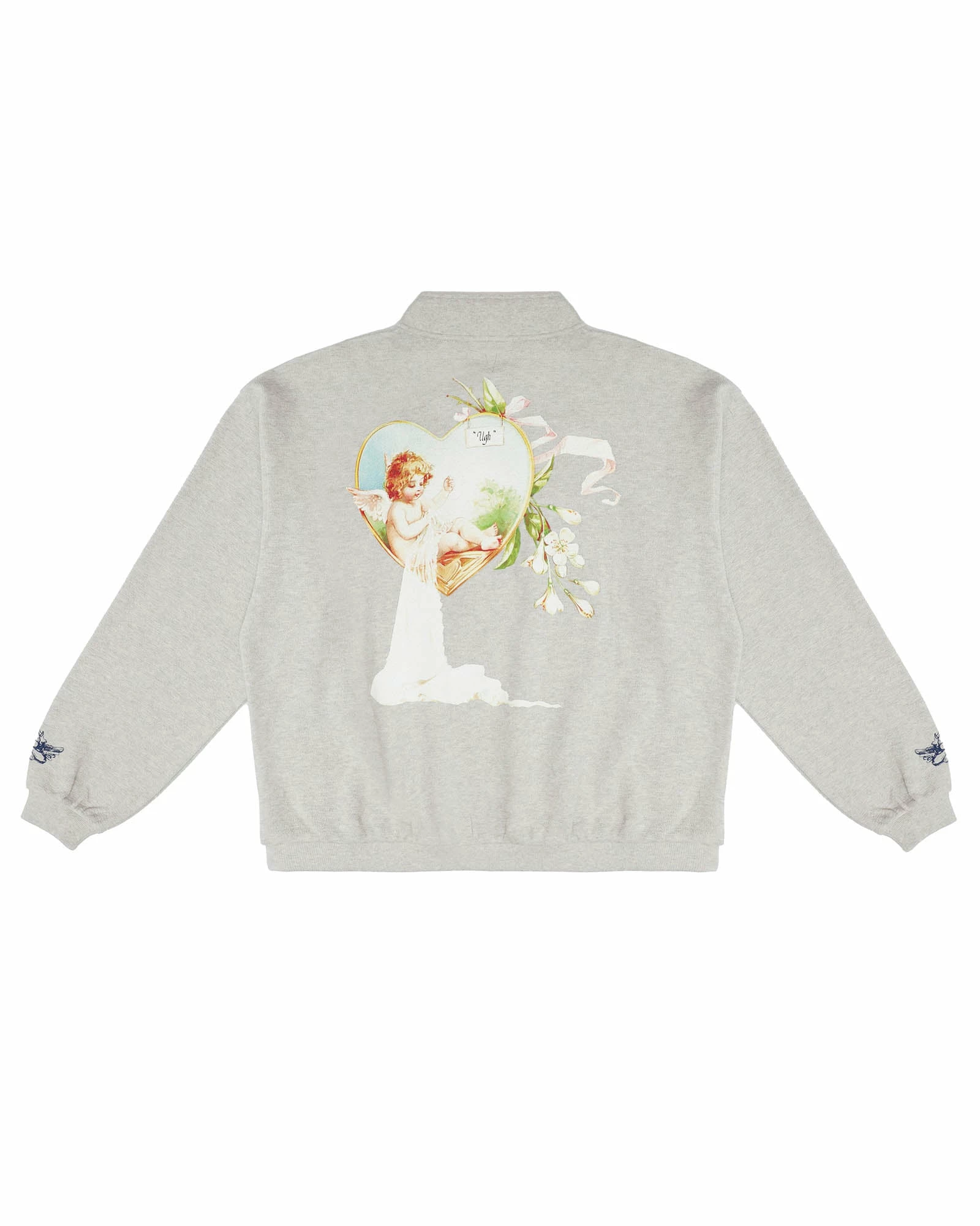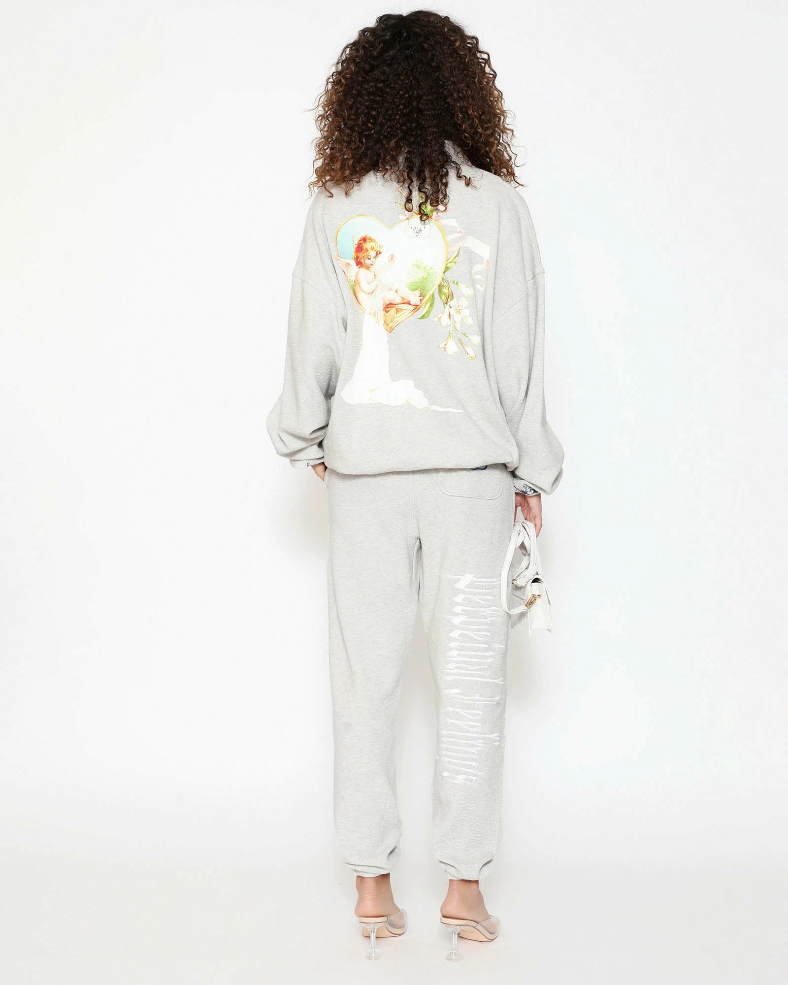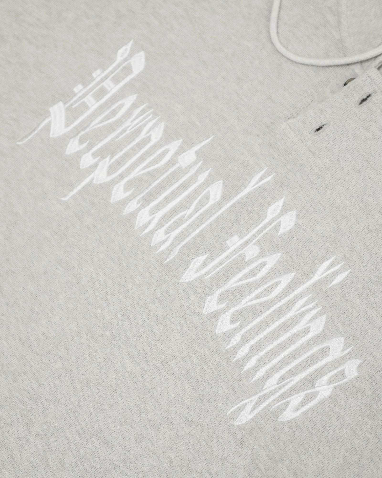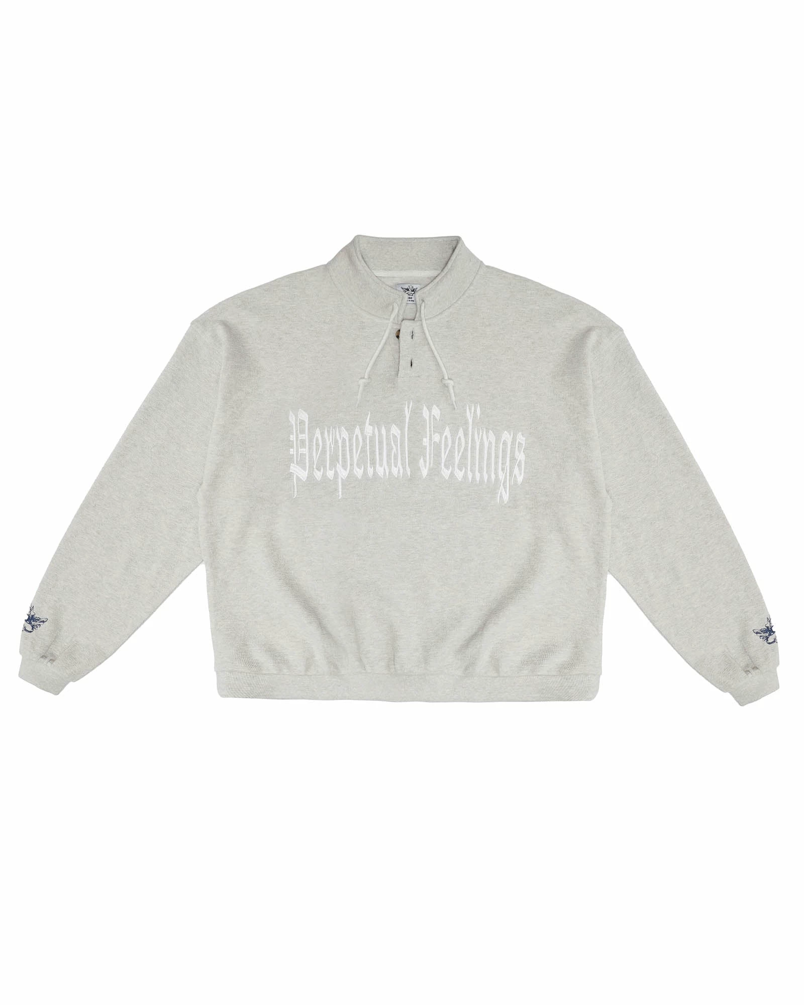 Inside out french terry fabric in heather grey. Henley style crewneck with button details, drawstring, ribbed cuffs and hem, and embroidery.