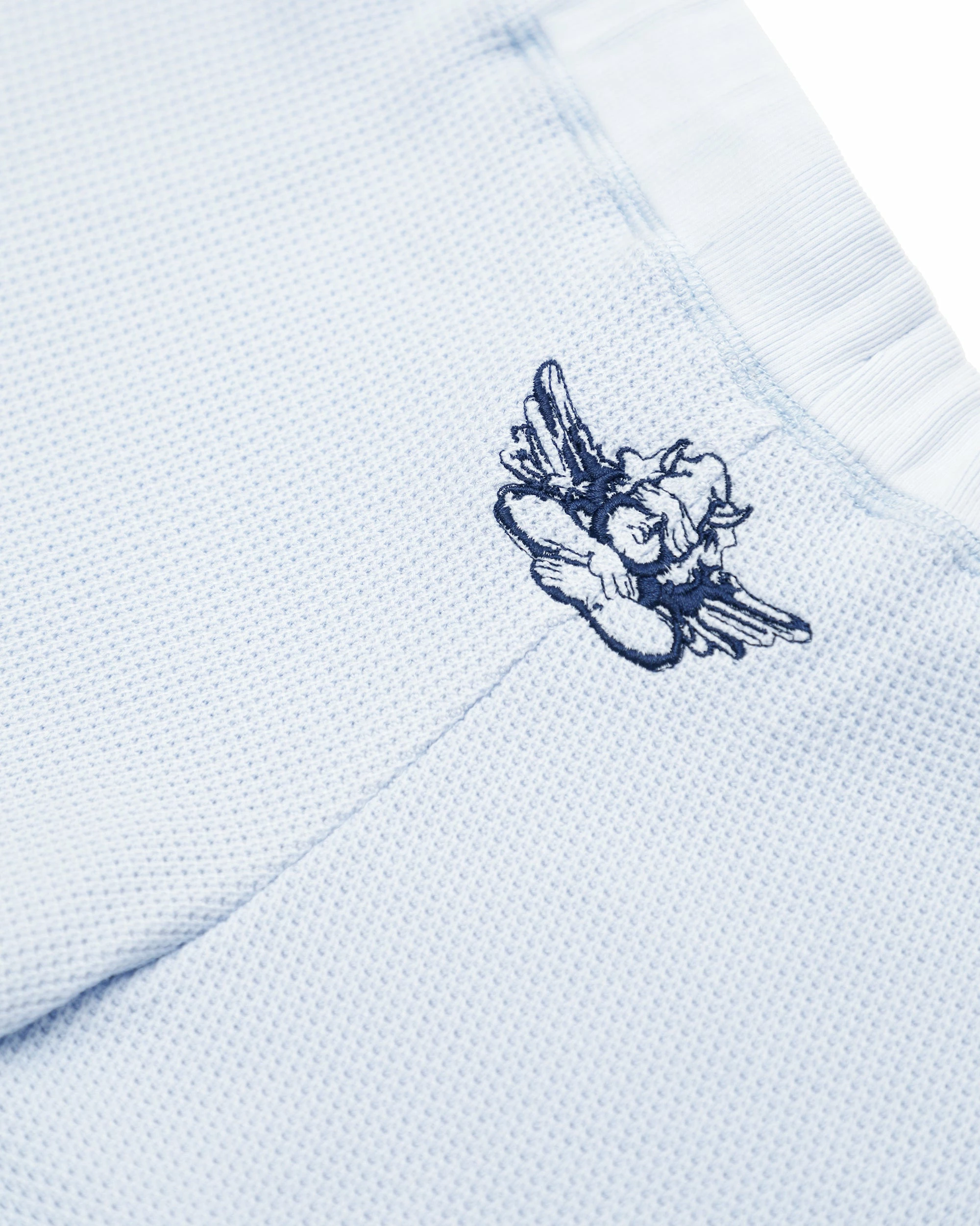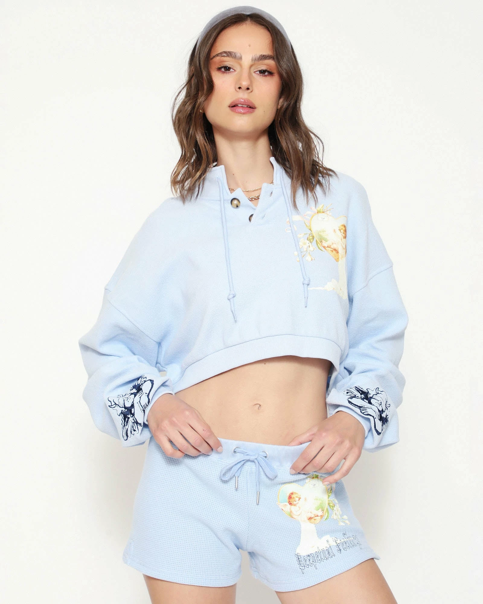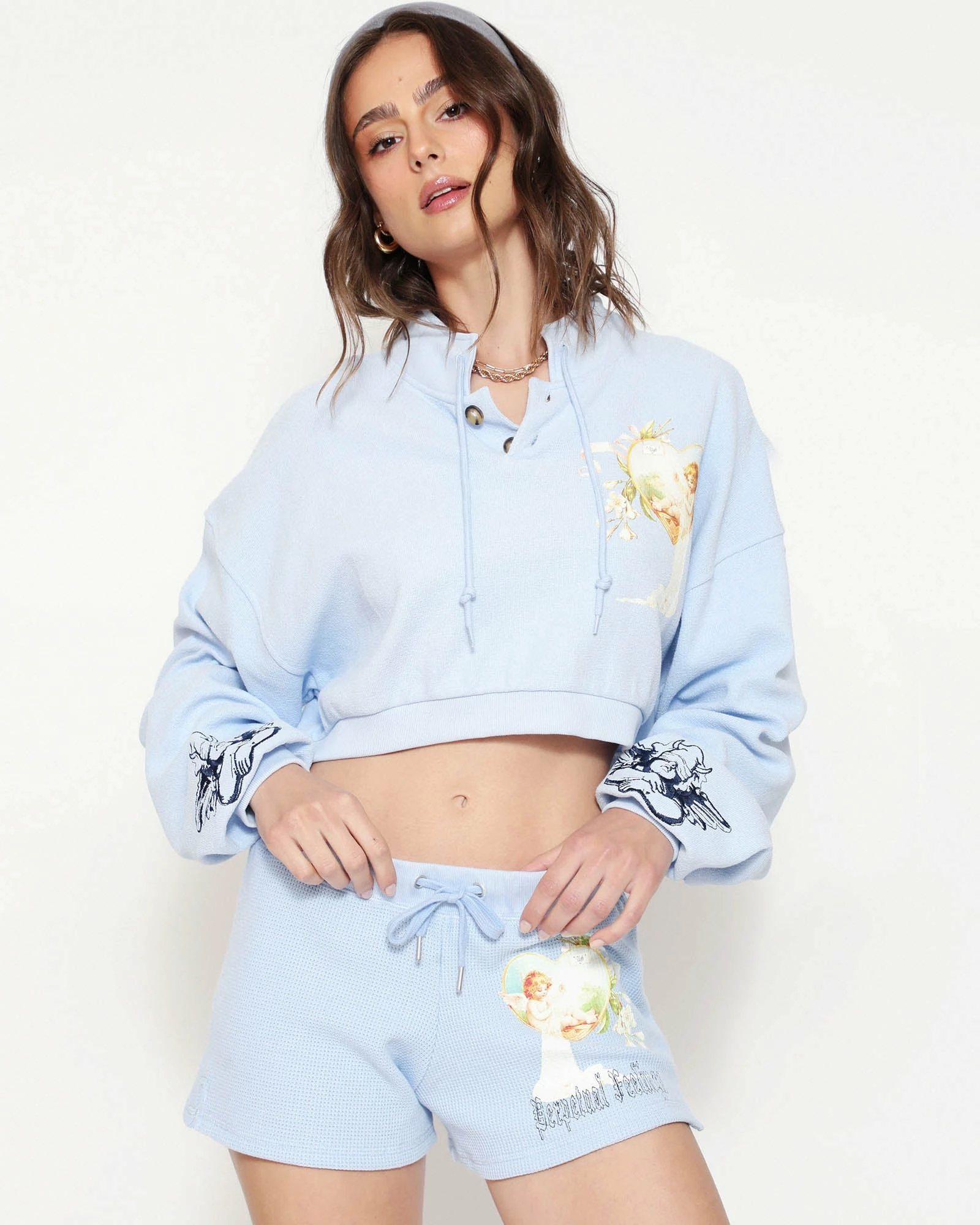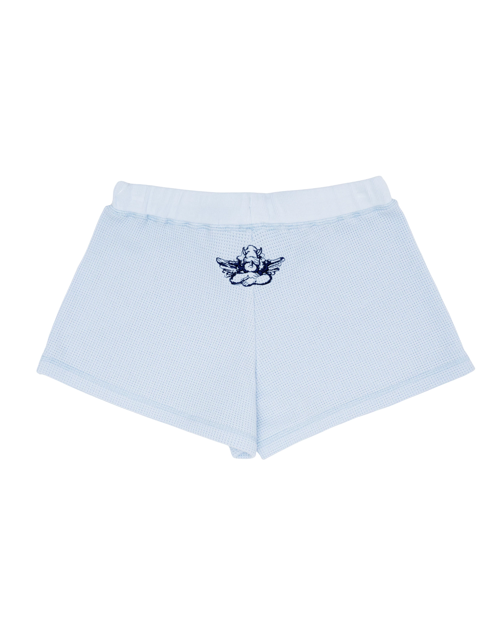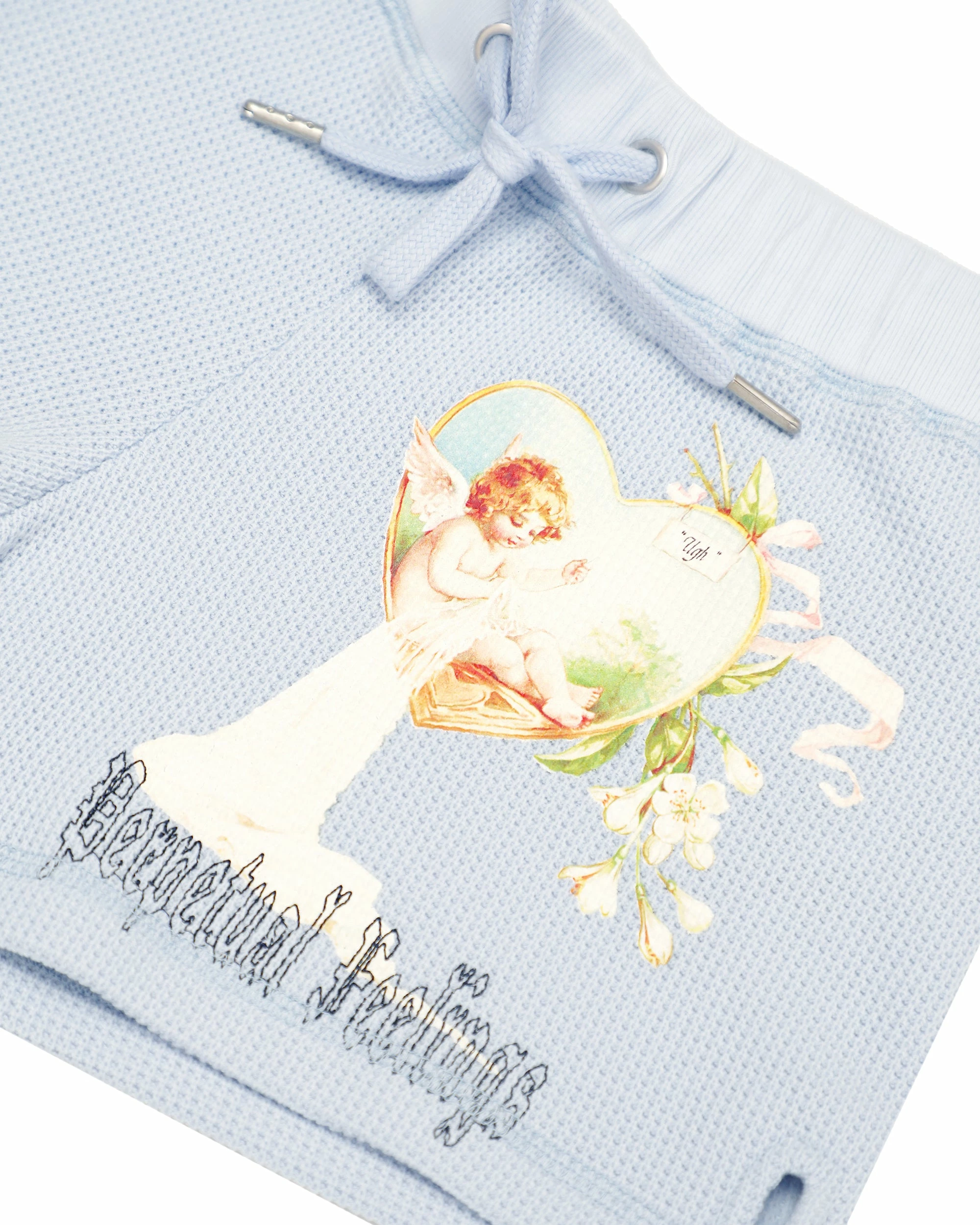 Soft thermal fabric in baby blue. Mid-rise shorts with adjustable drawstring and embroidery.