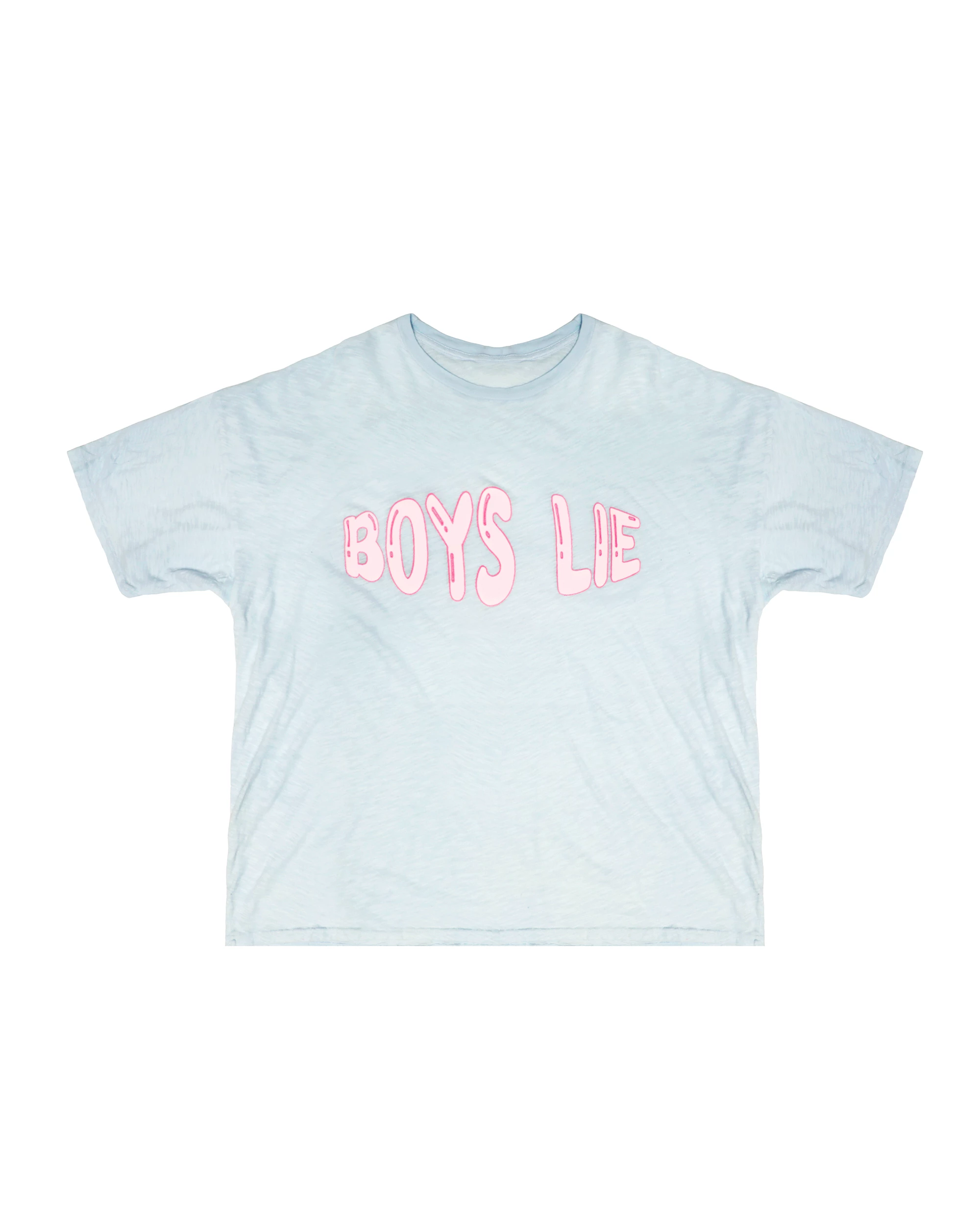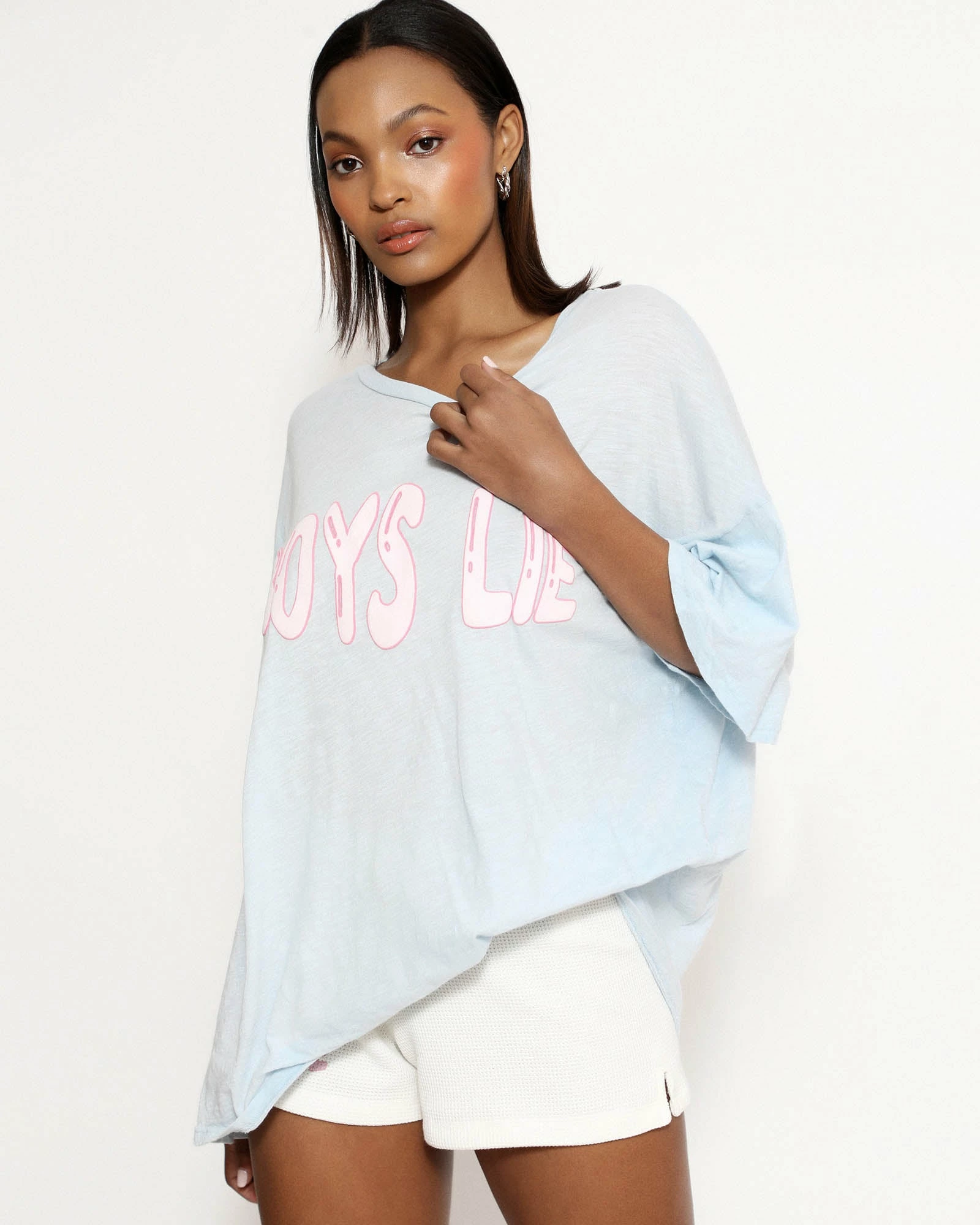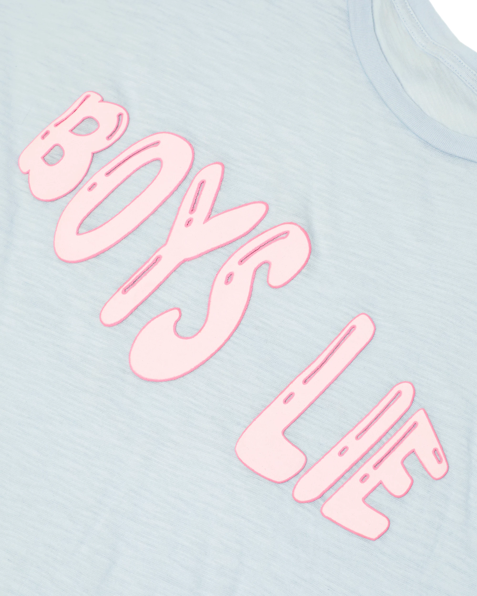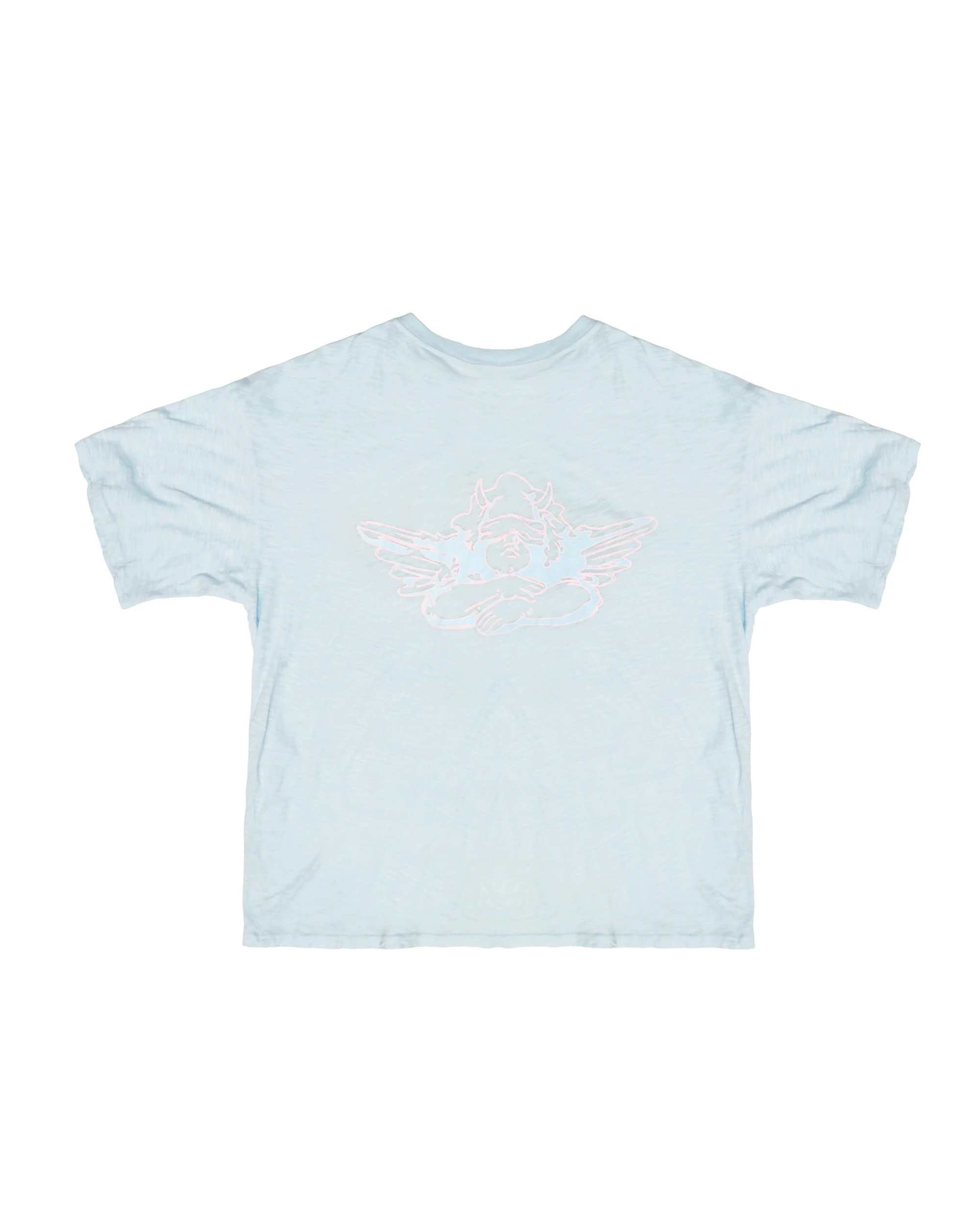 Lightweight and slightly sheer baby blue tee in cotton slub jersey with an oversized fit. Features puff print graphic on front.