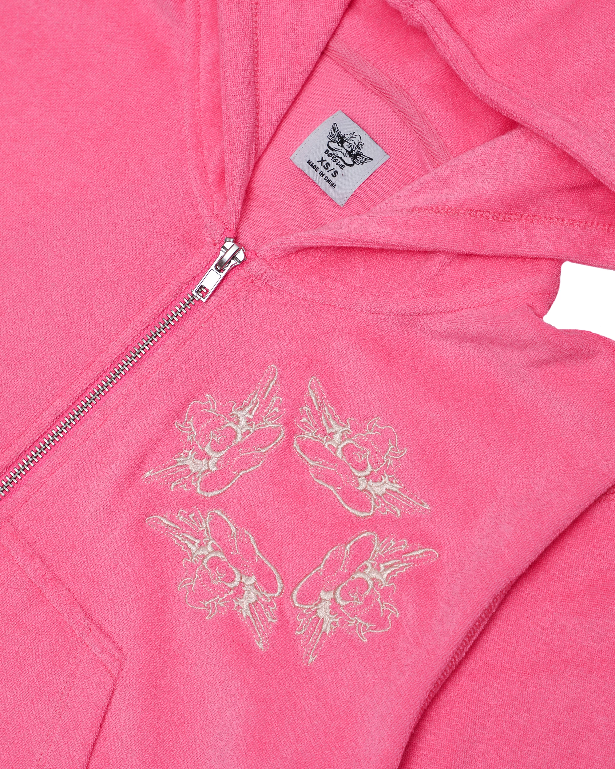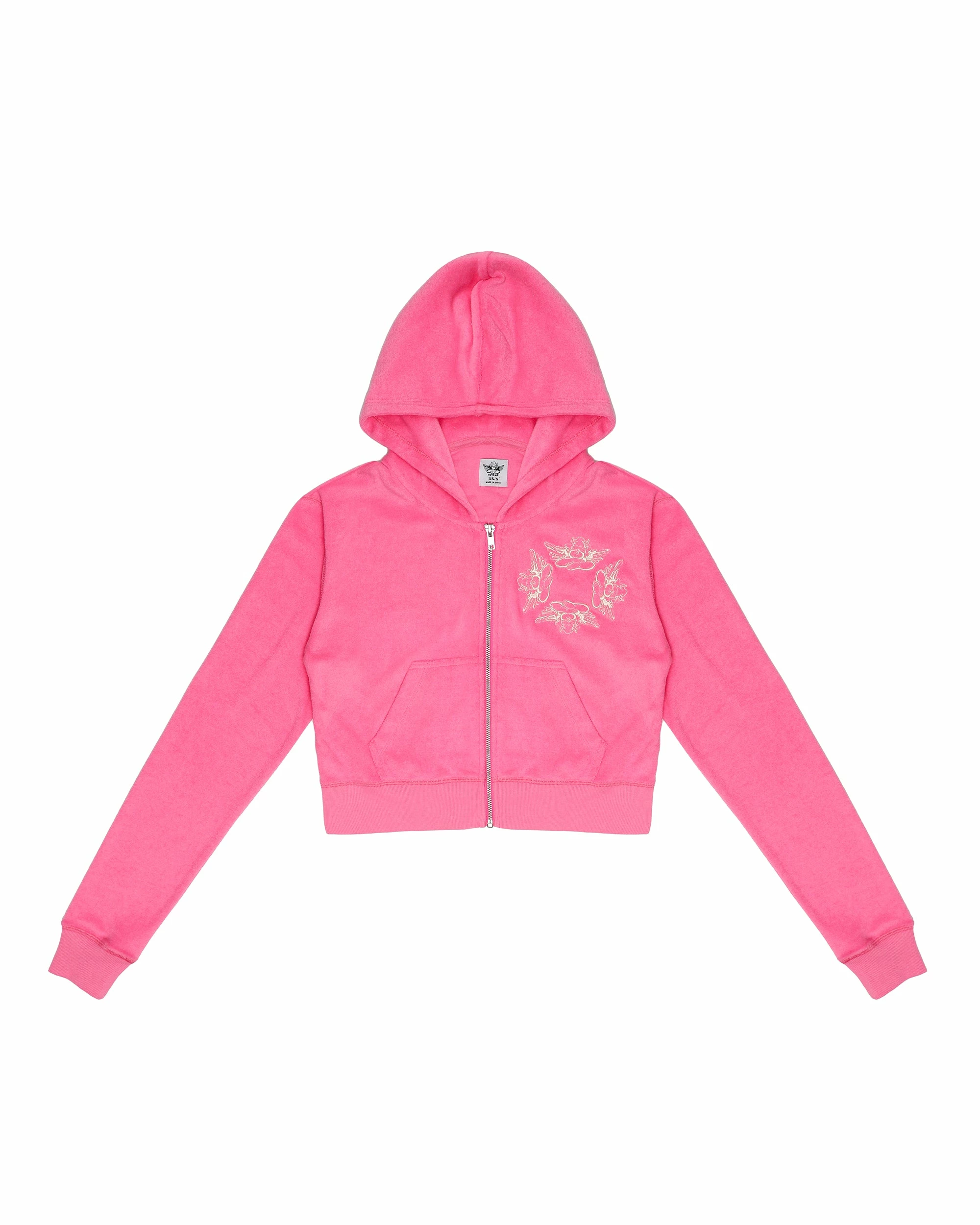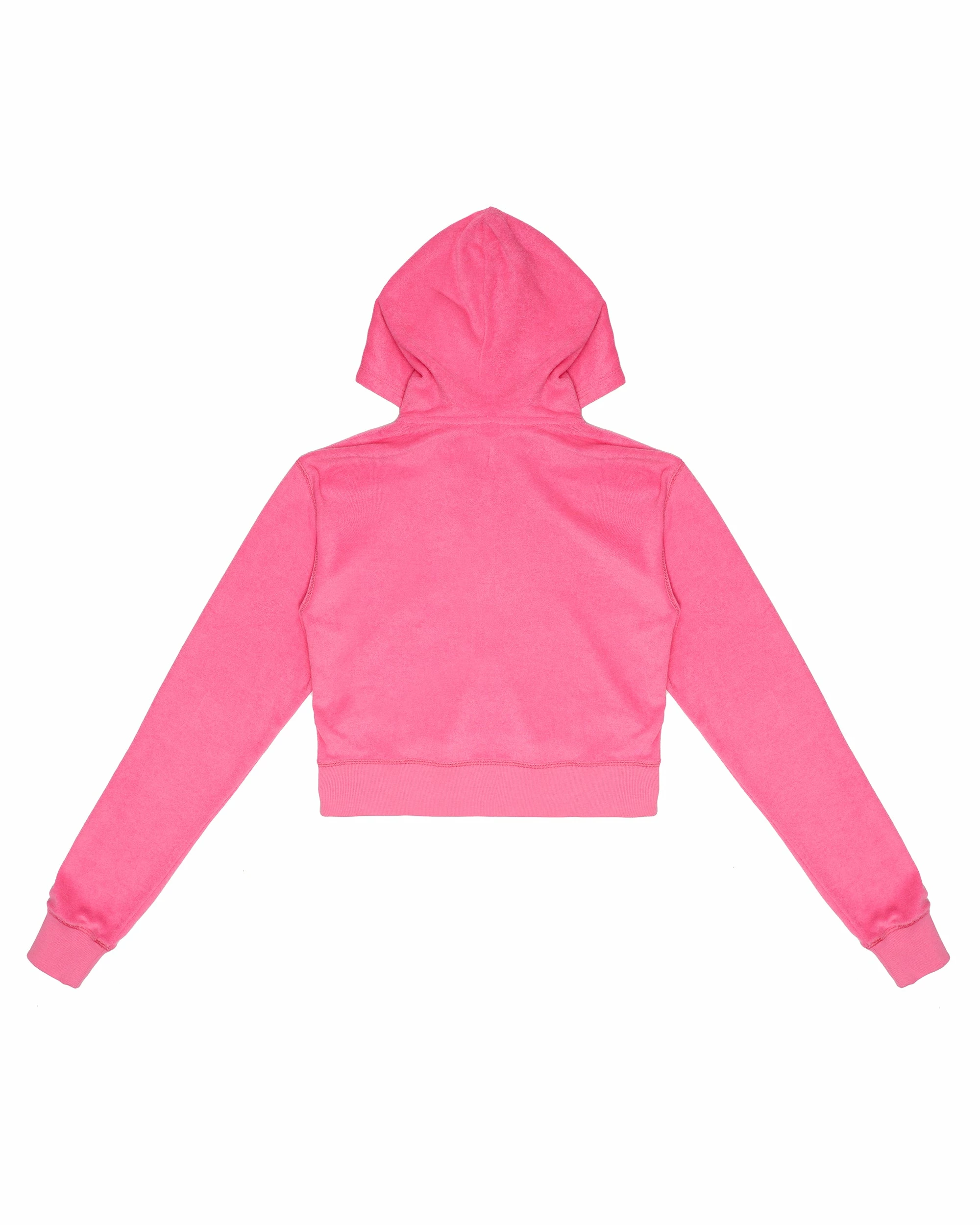 Lightweight terry cloth fabric in a neon pink. Zip up hoodie with cropped hem, front pockets, and ribbed cuffs. Features embroidered front logos.