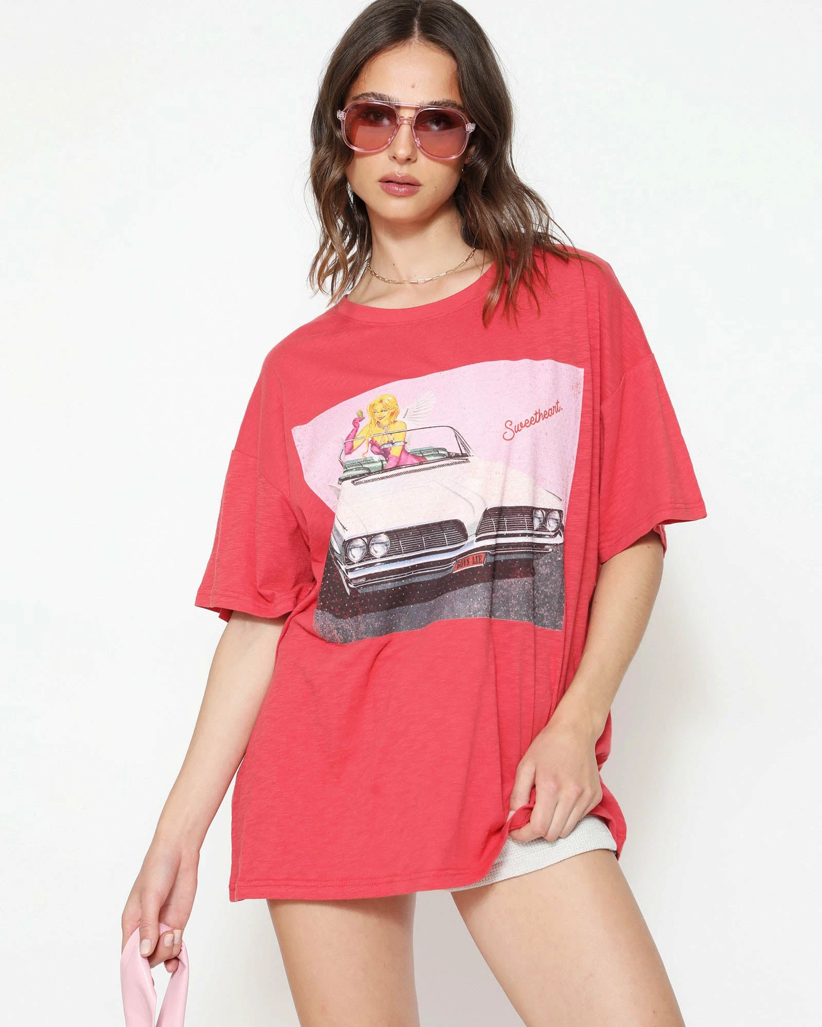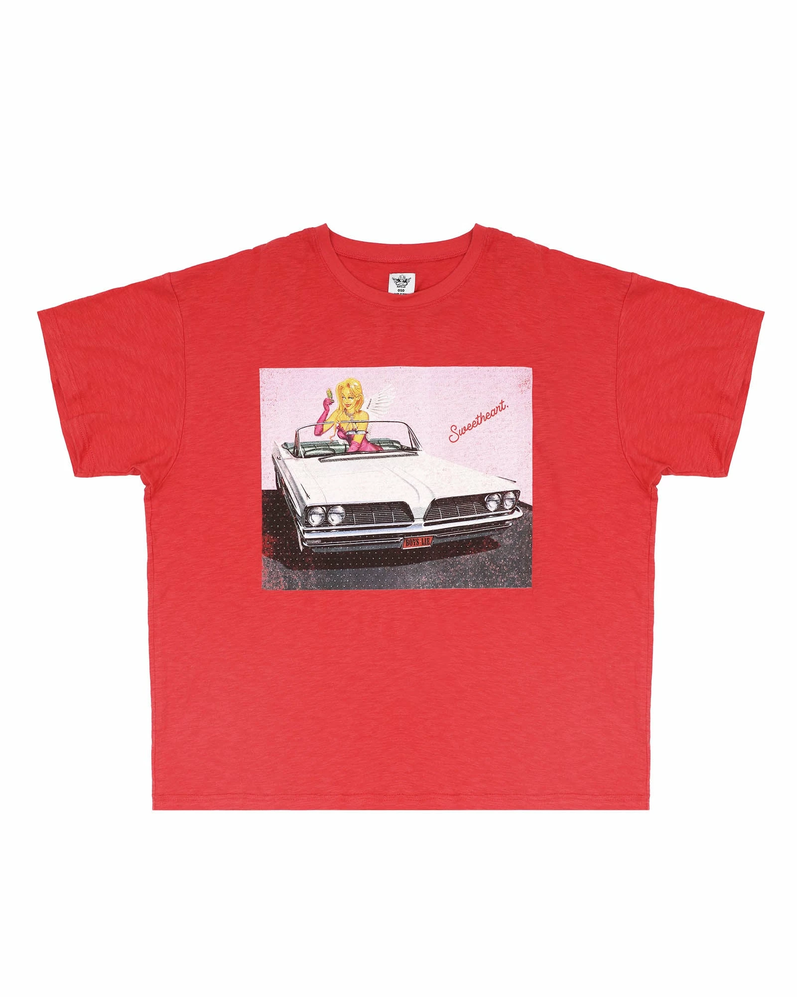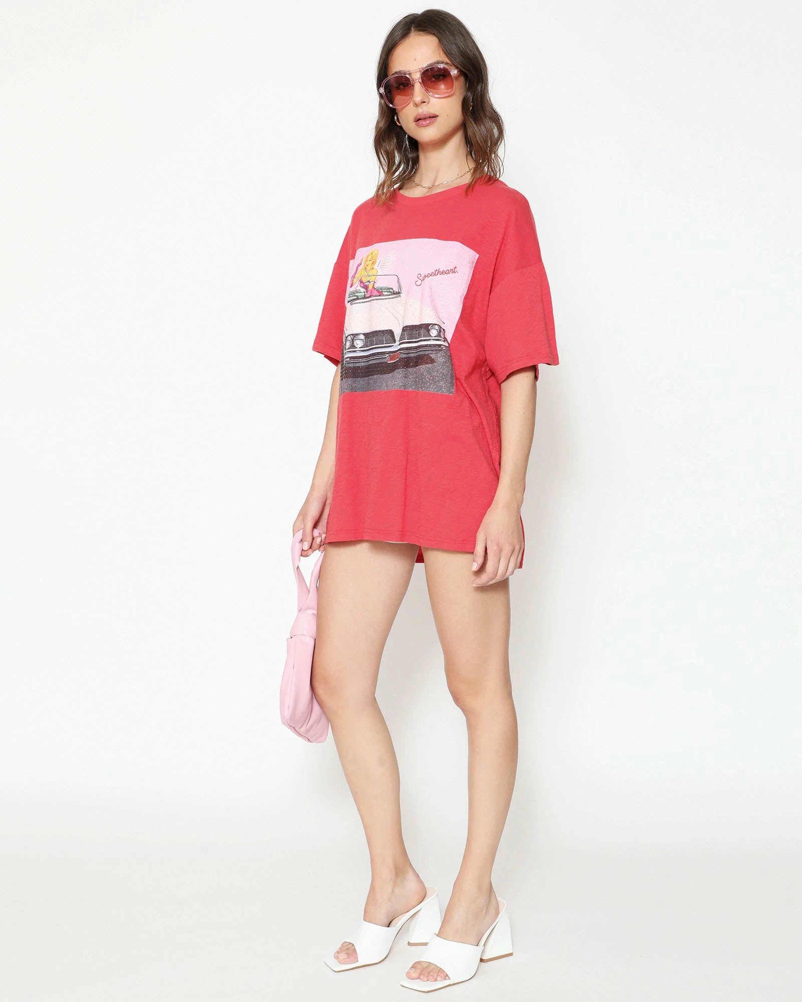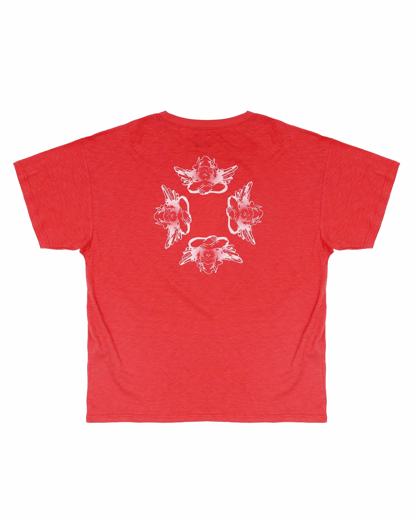 Lightweight and slightly sheer red tee in cotton slub jersey with an oversized fit. Features distressed graphics and rhinestone embellishments.