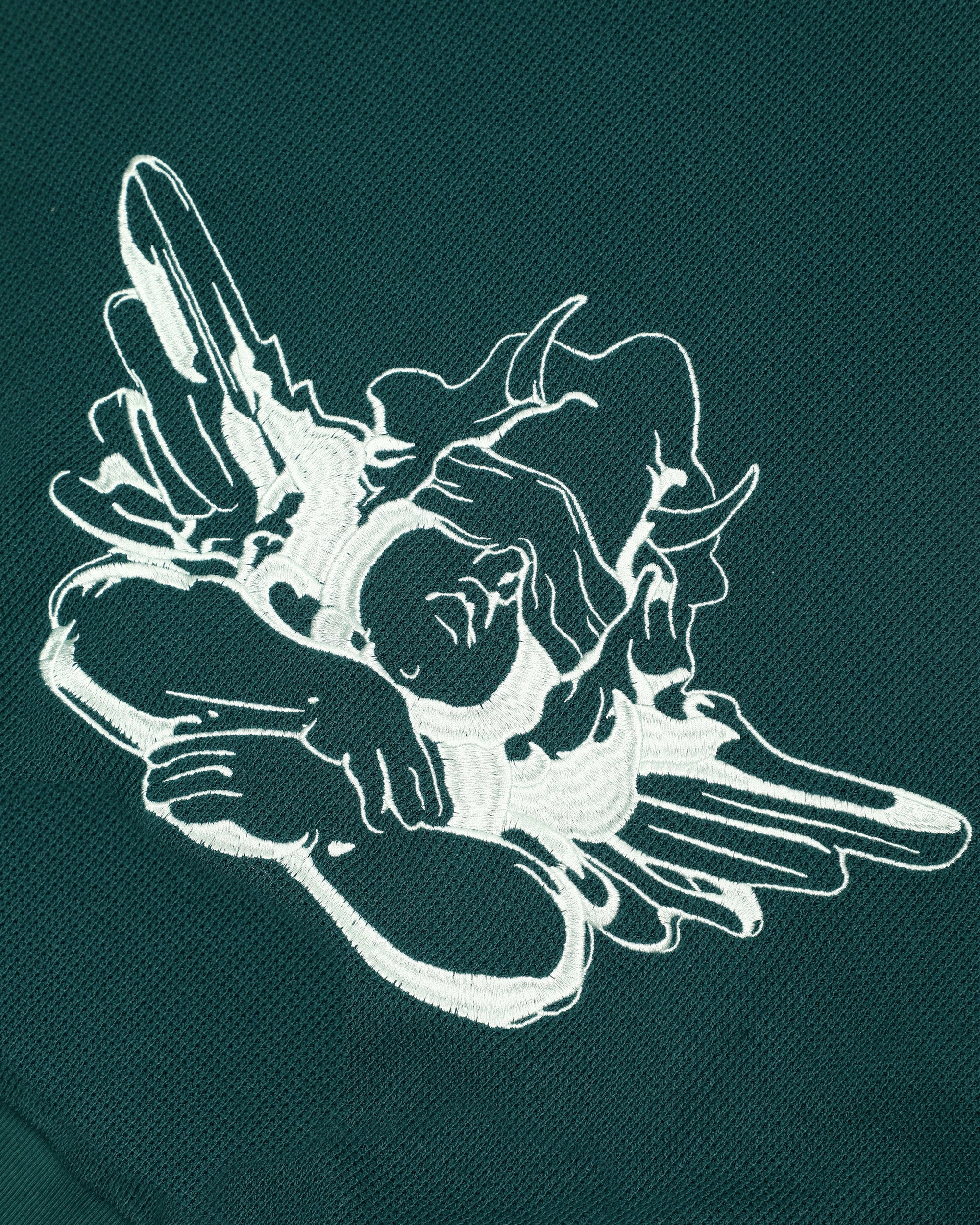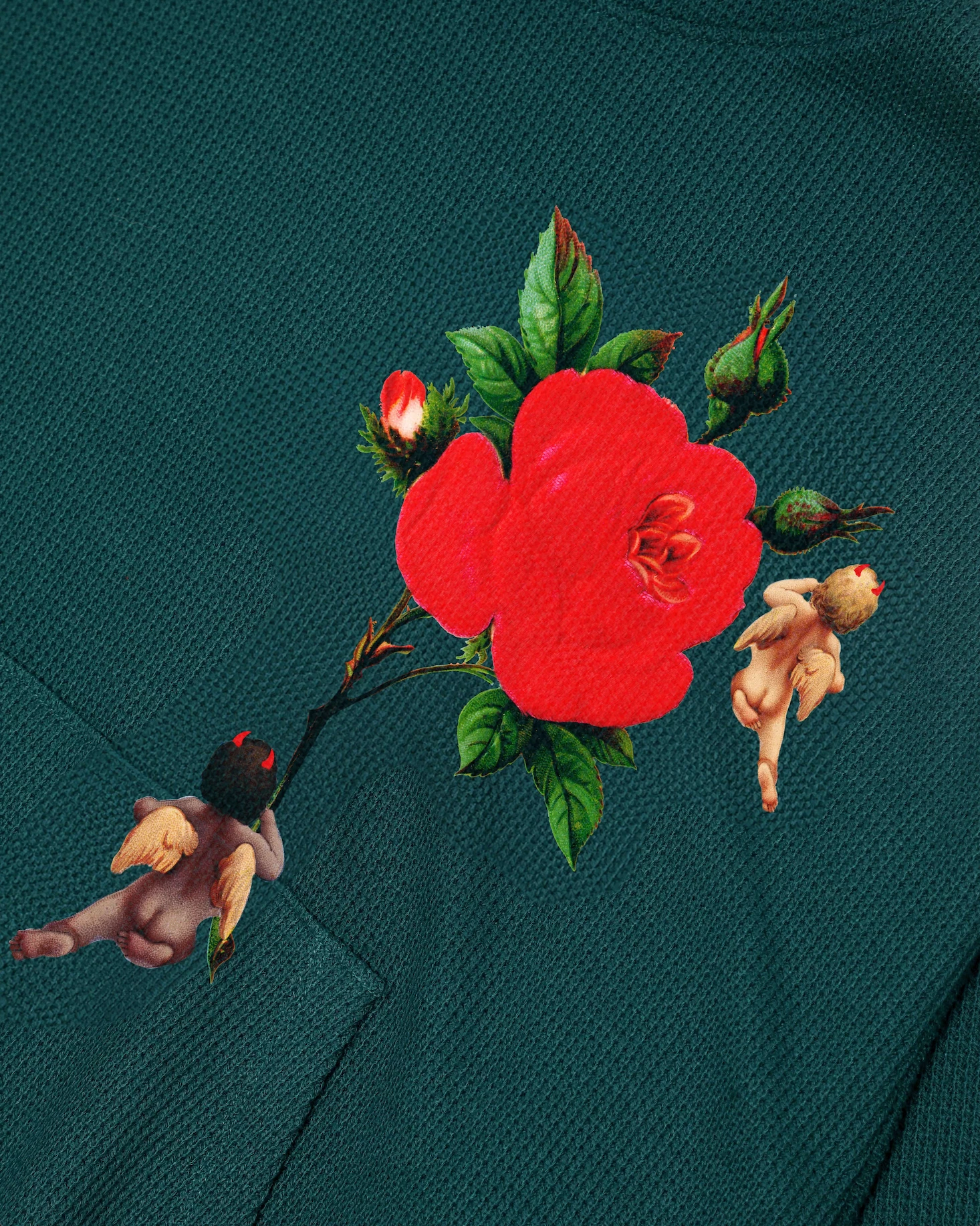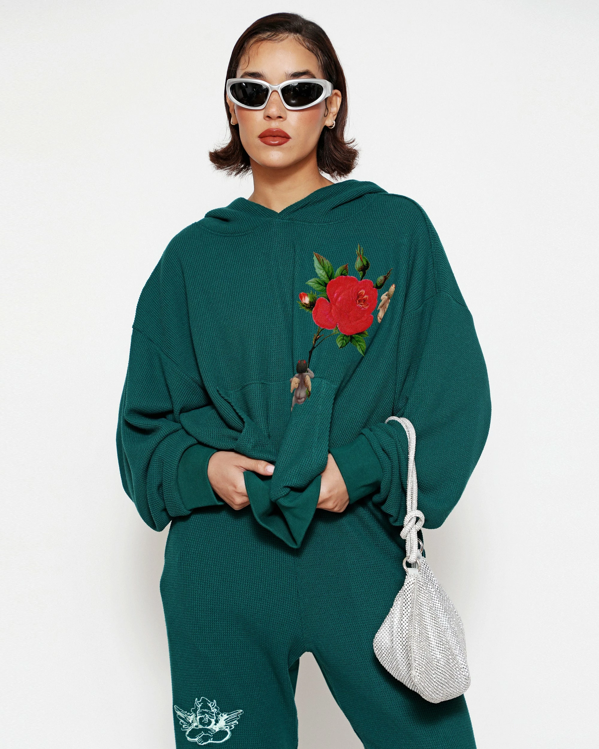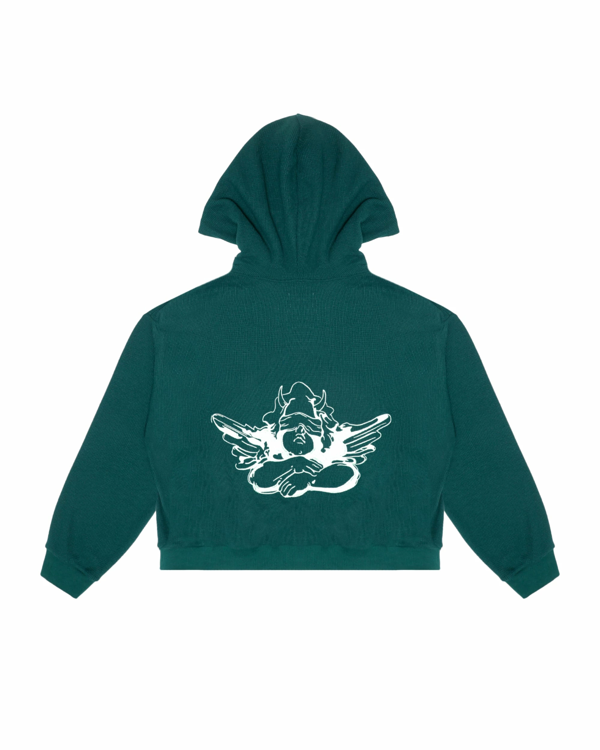 Oversized and cropped forest green thermal hoodie with front pocket featuring front and back graphic prints.