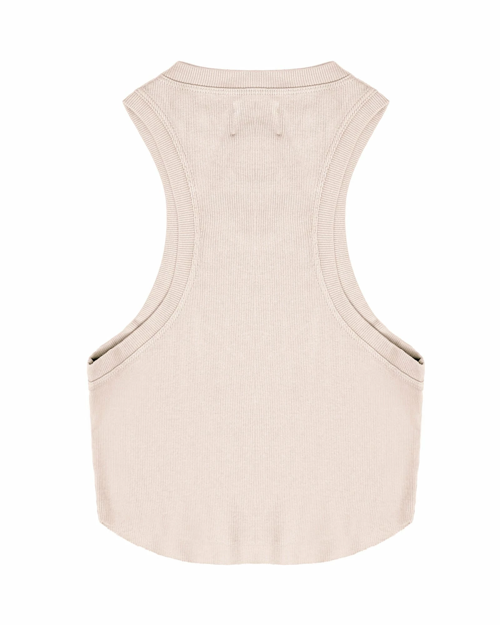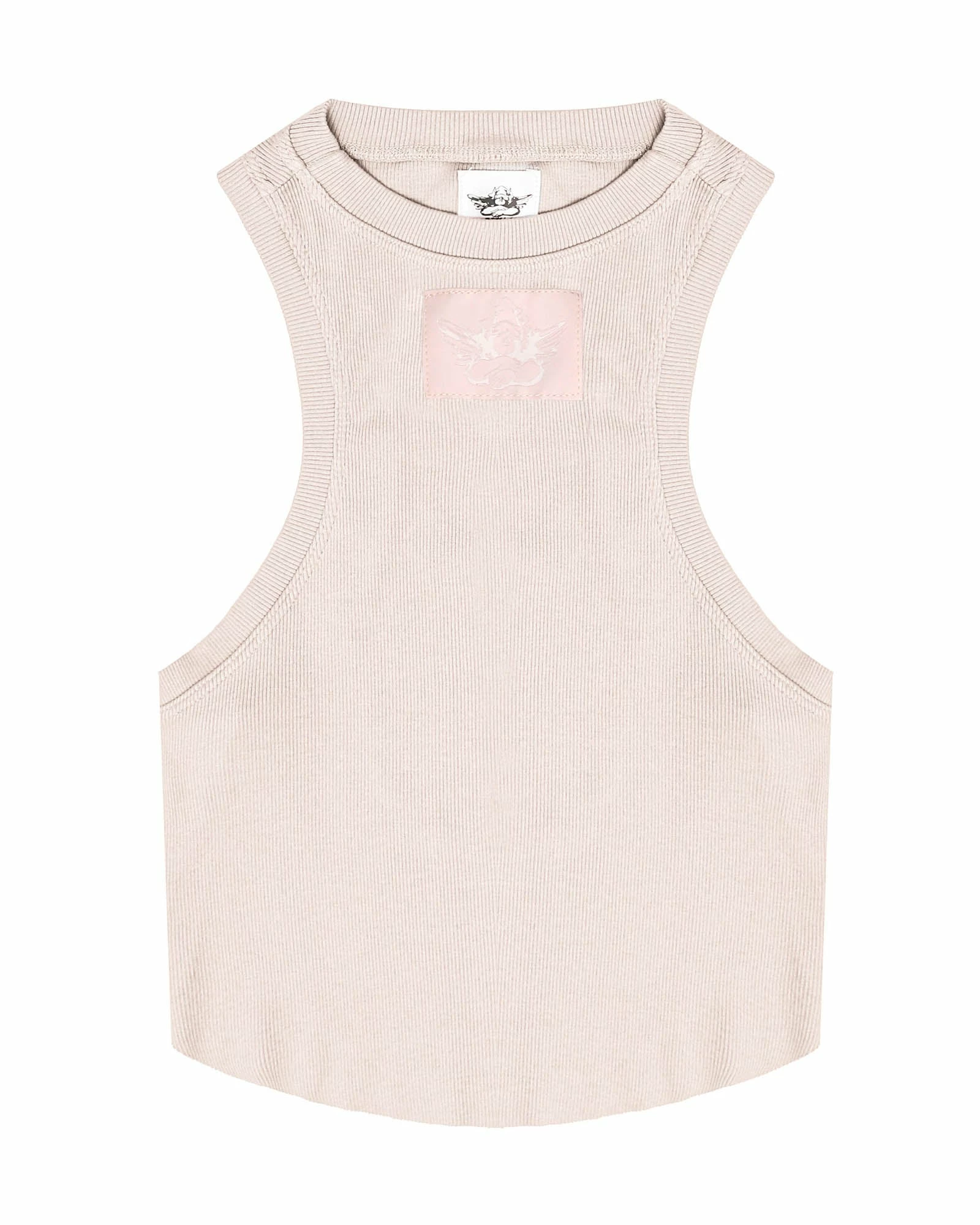 Soft, stretchy ribbed tank in baby pink. Curved hem with a raw edge, racerback neckline, and Boys Lie logo patch.