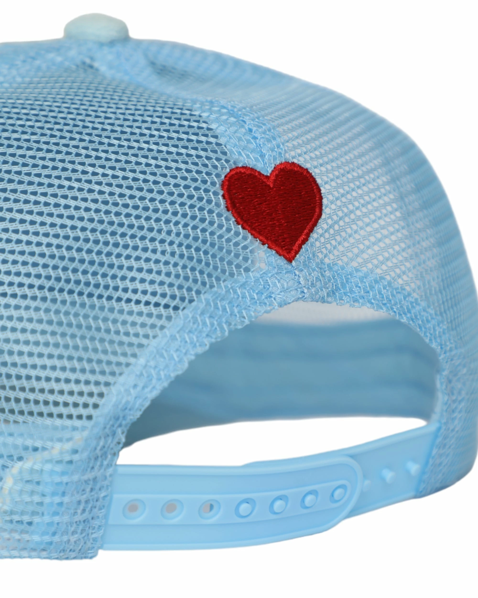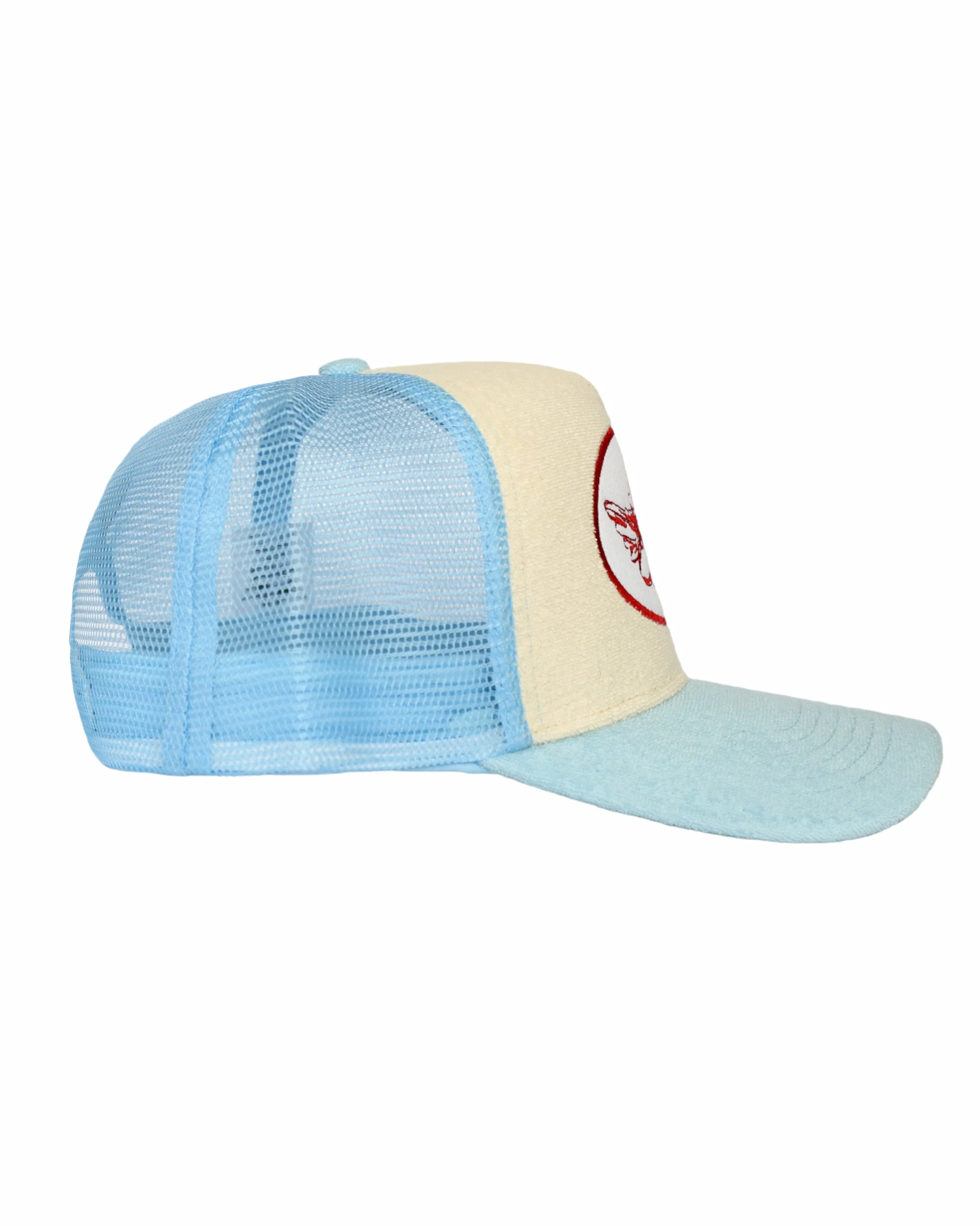 Cream terry trucker hat with a white and red patch and blue brim. Adjustable snapback.